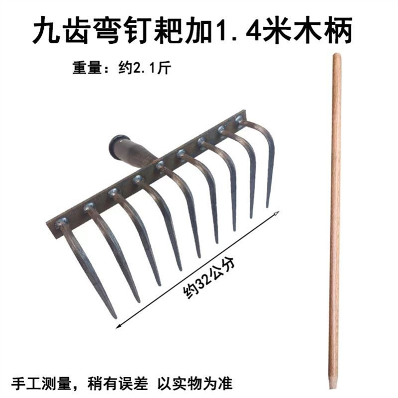 • 1.4 m 나무 손잡이가있는 새로운 두꺼운 9 개의 이빨 곡선 갈퀴