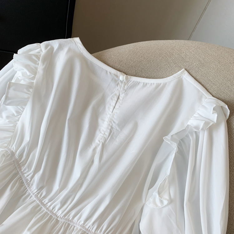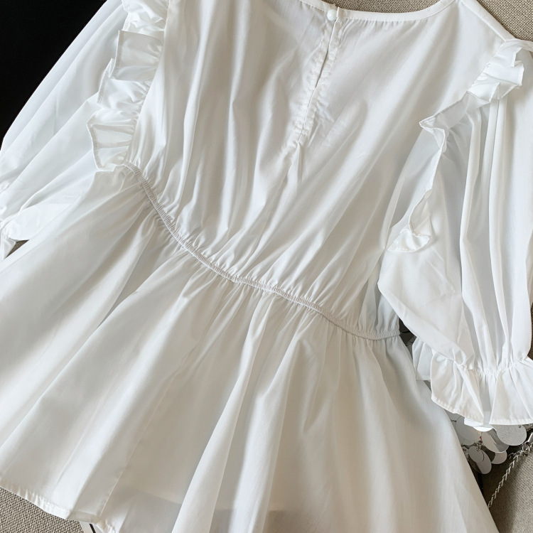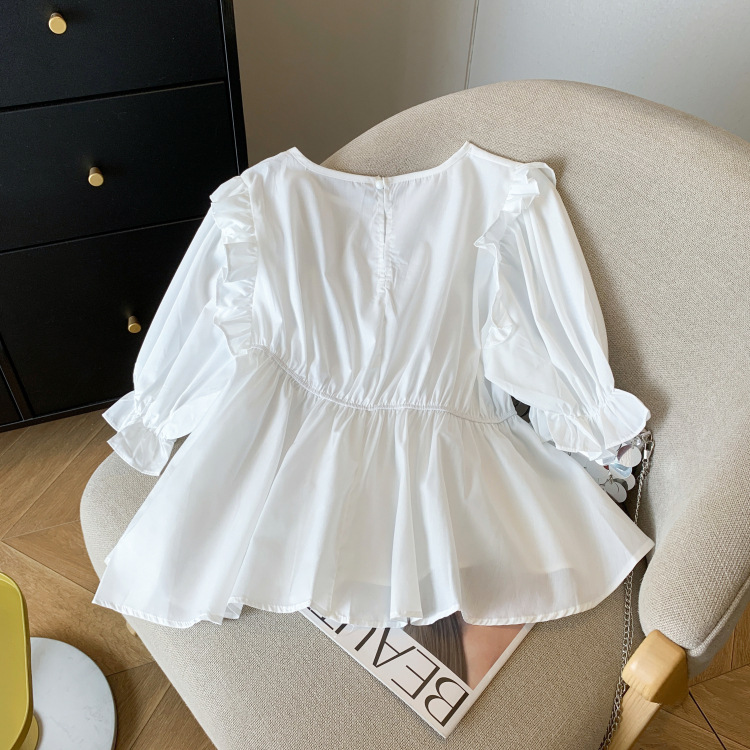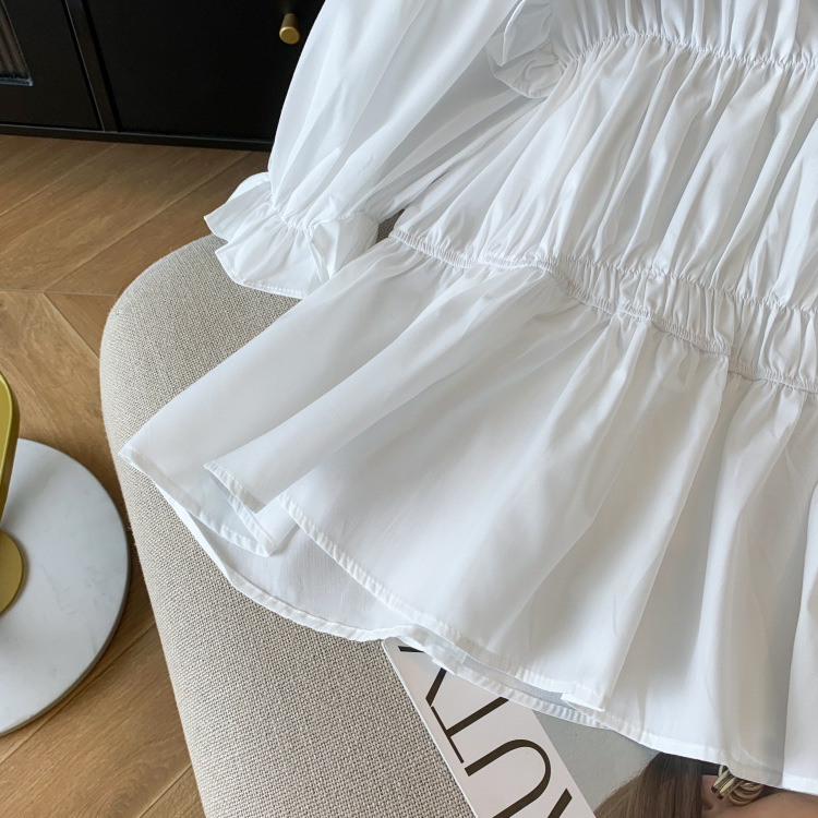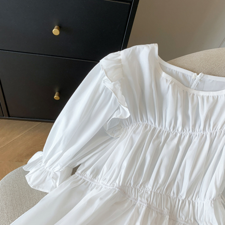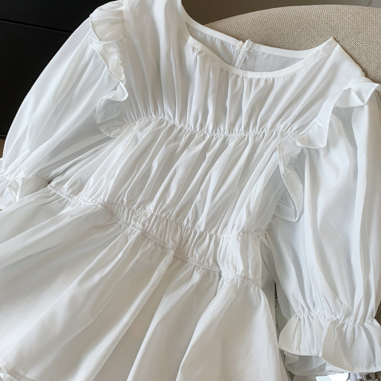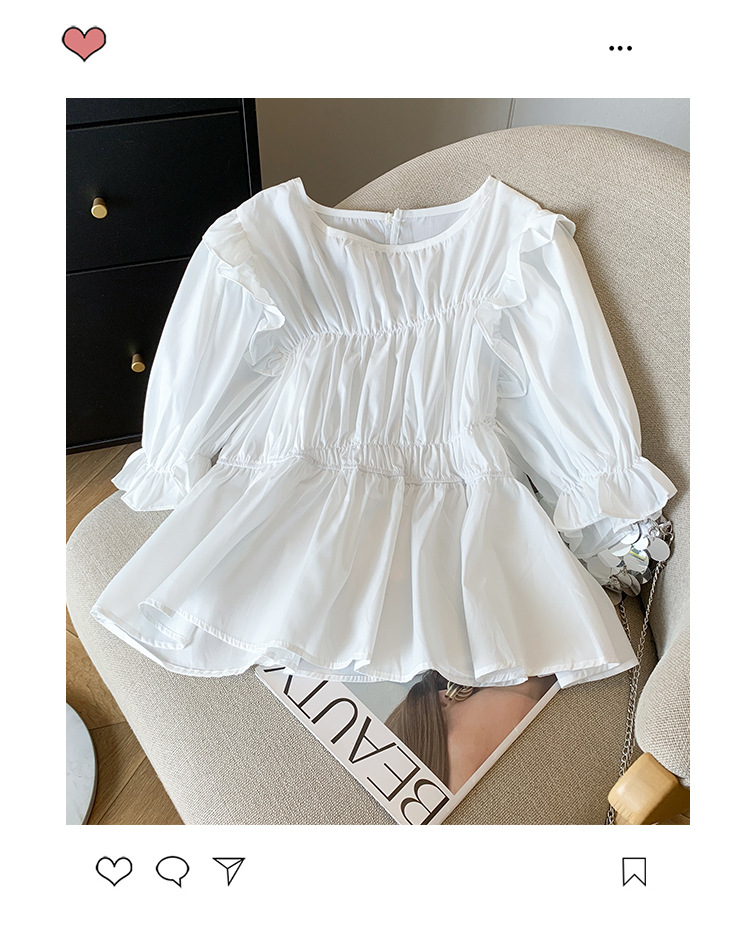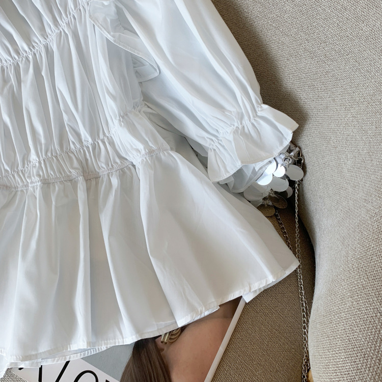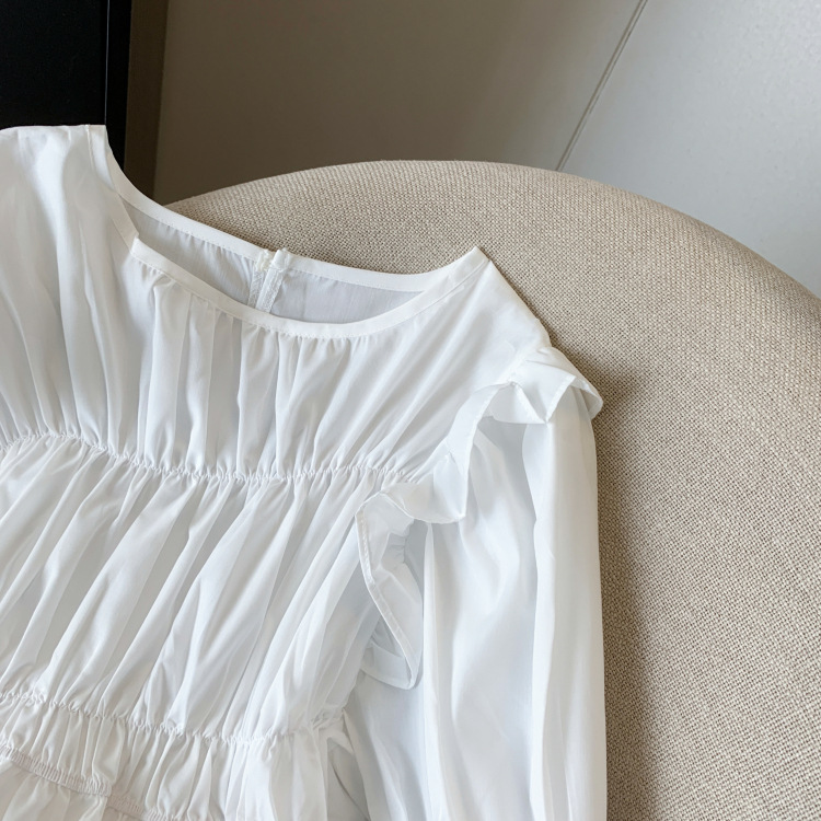 실제 샷 재고 여름 새로운 디자인 감각 세련된 달콤한 흰색 셔츠 주름 쉬폰 셔츠 최고 여성스토어 가기