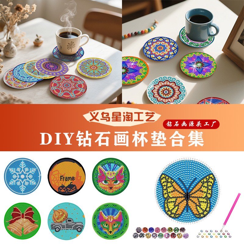 크로스보더 다이아몬드 페인팅 컵받침 원형 식탁매트 만다라 크리스마스 만화 나비 어린이 수제 DIY 단열매트스토어 가기