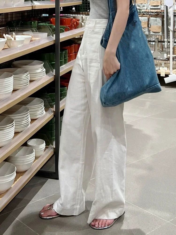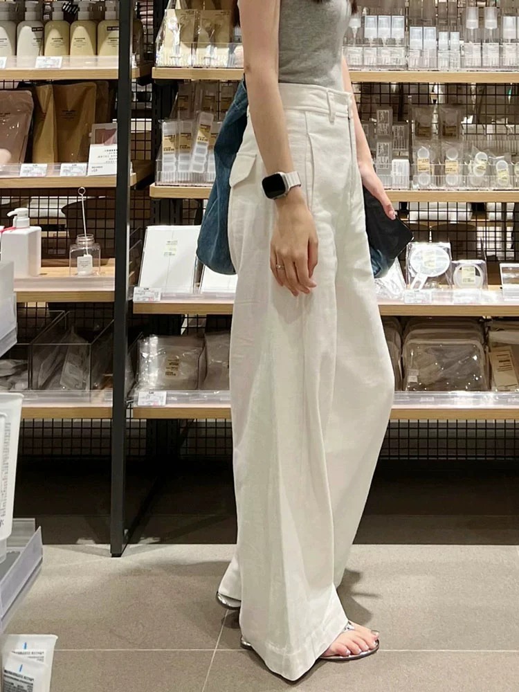 2024 년 여름 새로운 도착 화이트 코튼 및 리넨 와이드 레그 바지 작은 남성 높은 허리 투약 슬리밍 캐주얼 바지 여성용 의류