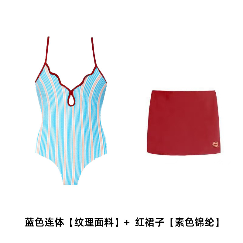 • 파란색 줄무늬 점프수트 + 빨간색 스커트