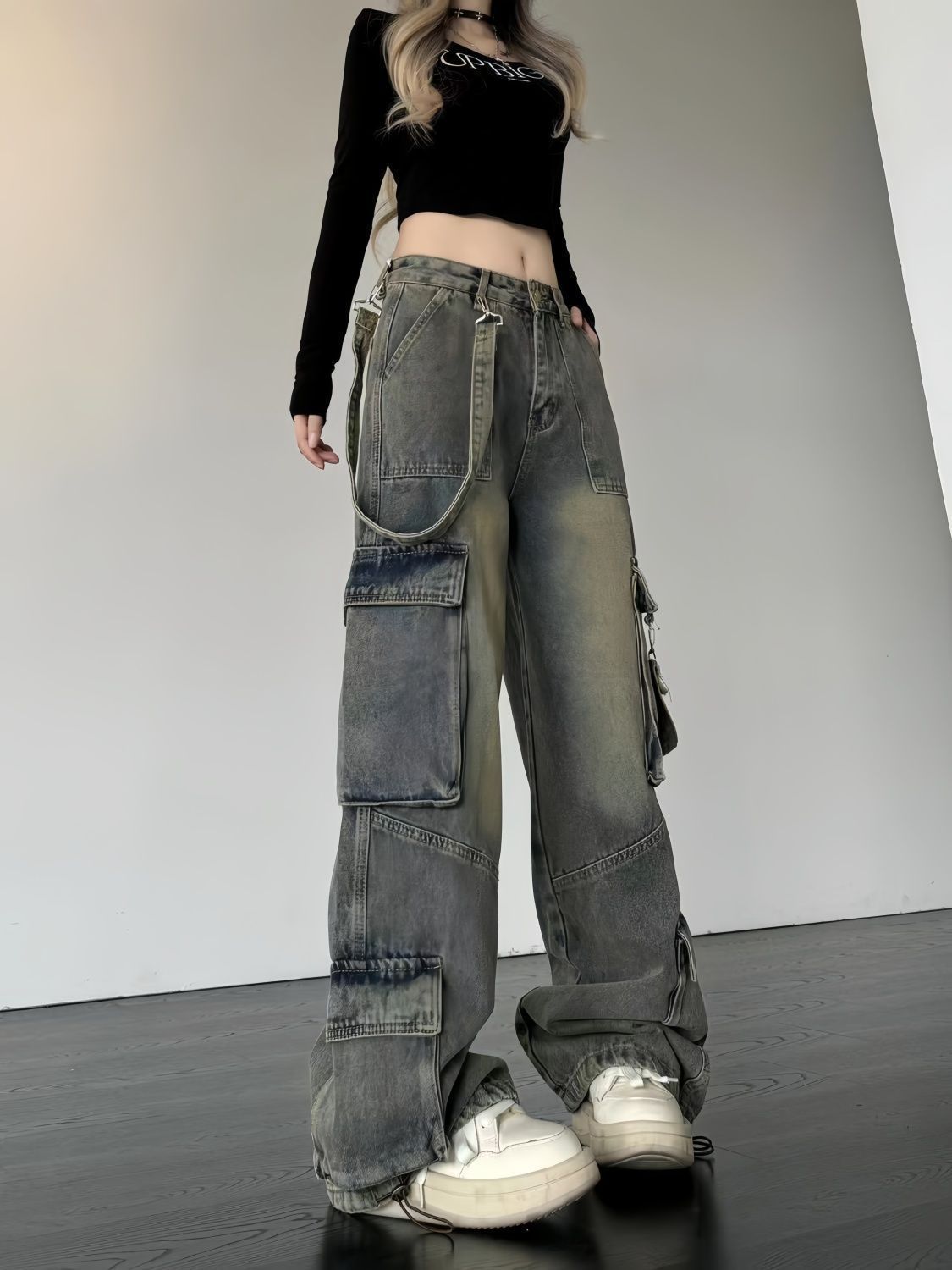 통통녀 Xiaozhong 하이 스트리트 멀티 포켓 요금 청바지 여성 플러스 사이즈 아메리칸 스타일 레트로 느슨한 슬리밍 와이드 레그 트렌디 팬츠스토어 가기