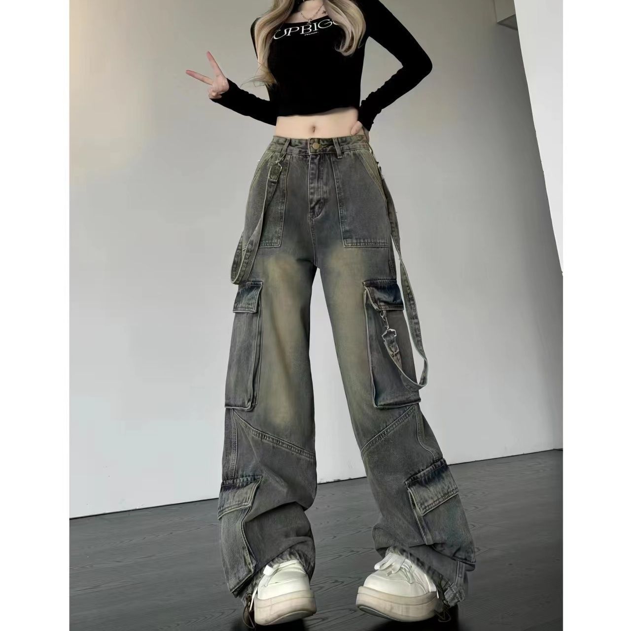통통녀 Xiaozhong 하이 스트리트 멀티 포켓 요금 청바지 여성 플러스 사이즈 아메리칸 스타일 레트로 느슨한 슬리밍 와이드 레그 트렌디 팬츠