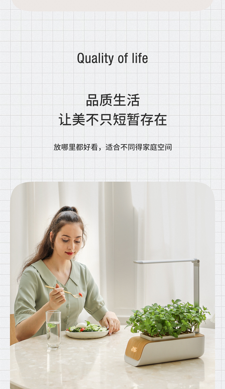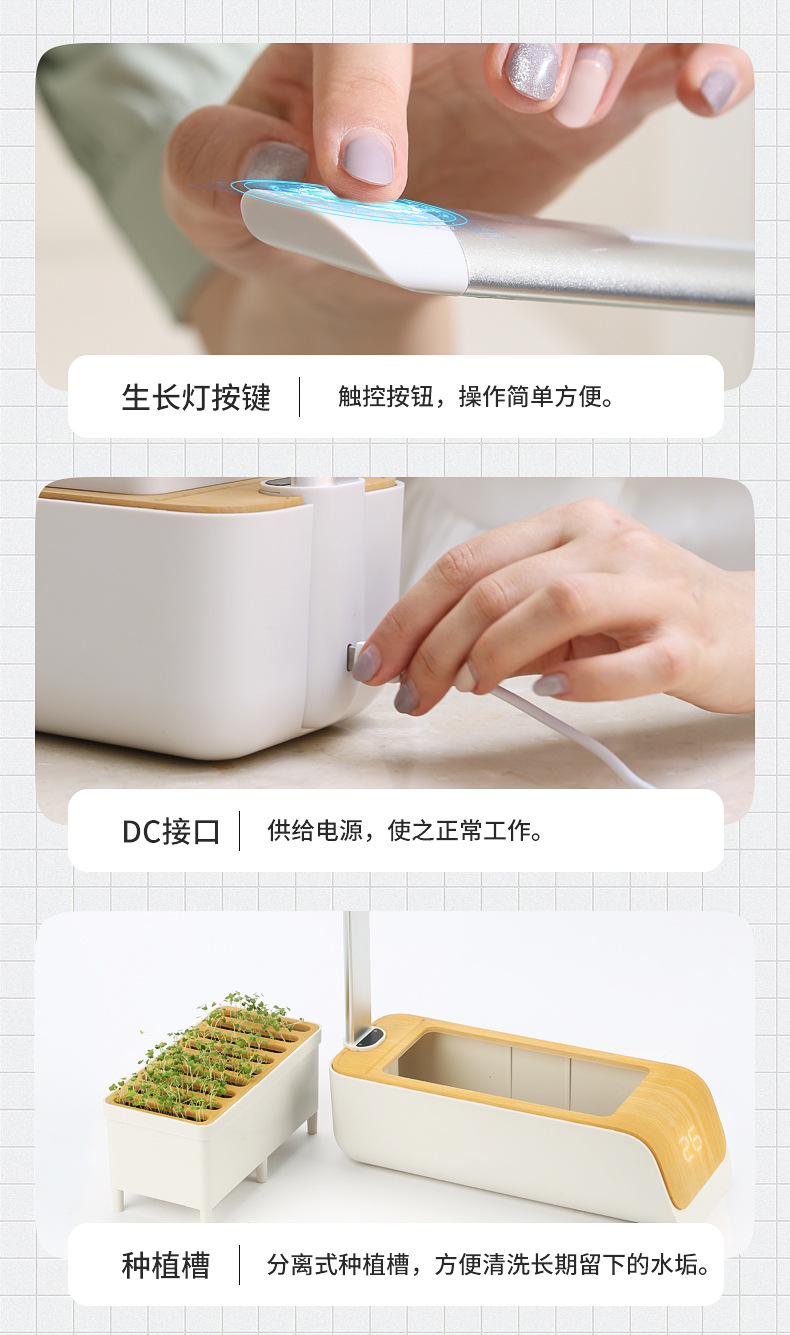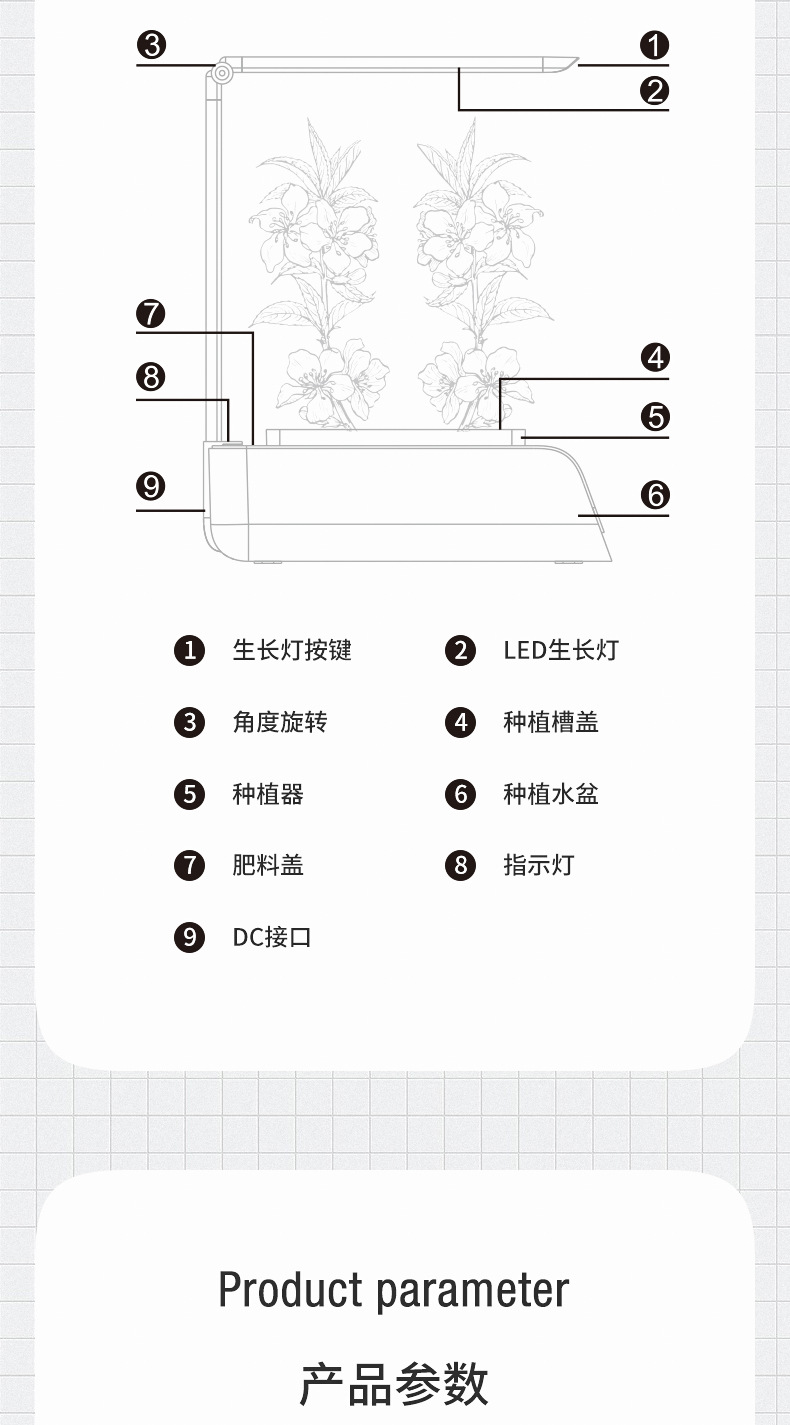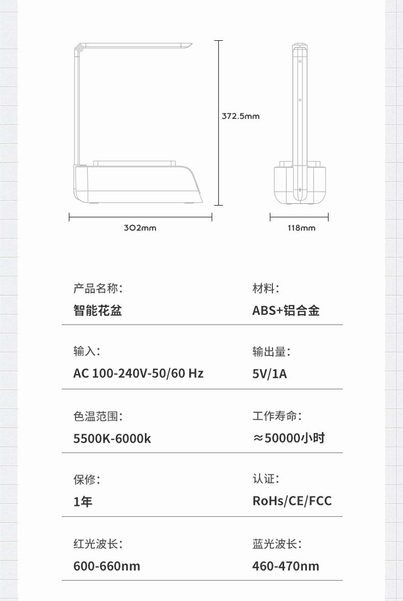 产品内配/Within the product distribution:花盆组装壳体*1、灯杆*1、Typ-C充电线*1、适配器*1、说明书*1、合格证*1、蛭石*1