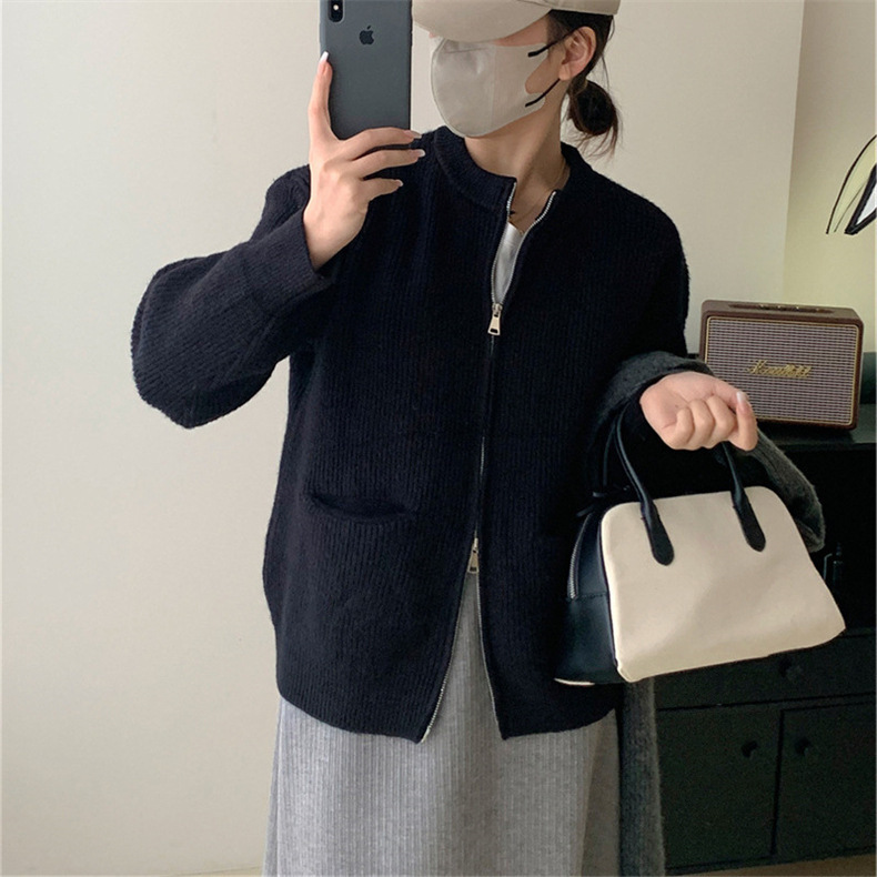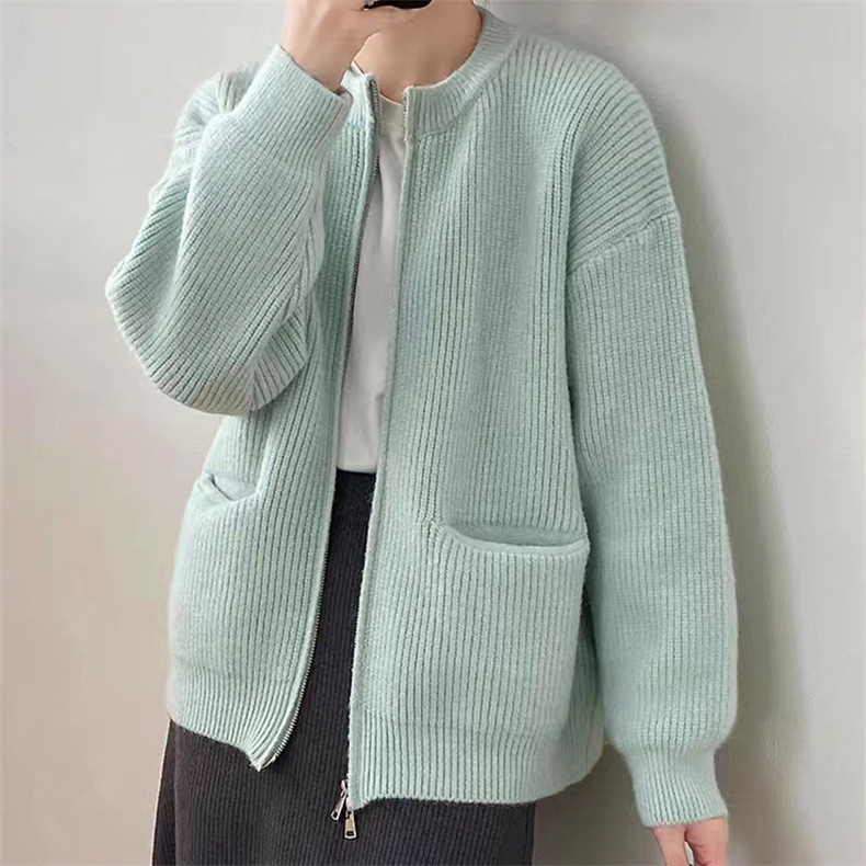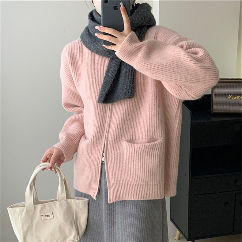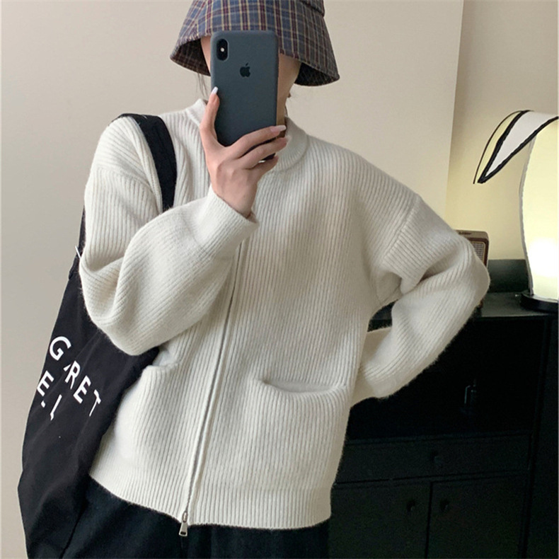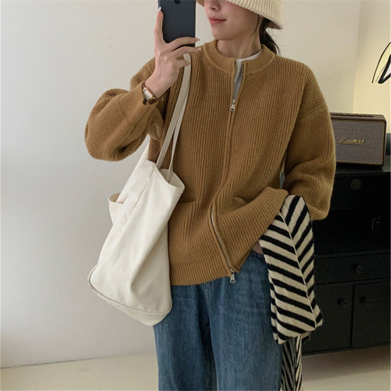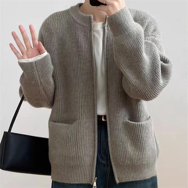 더블 지퍼 솔리드 컬러 디자인 스웨터 카디건 여성의 2023 가을 겨울 새로운 한국 스타일 느슨한 캐주얼 니트 스웨터스토어 가기