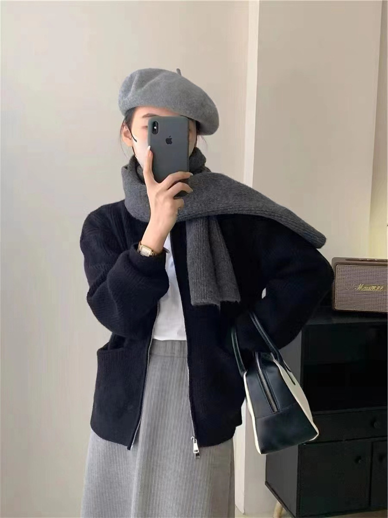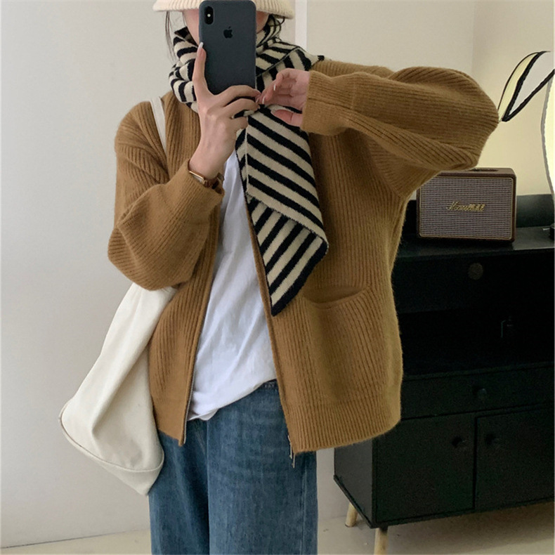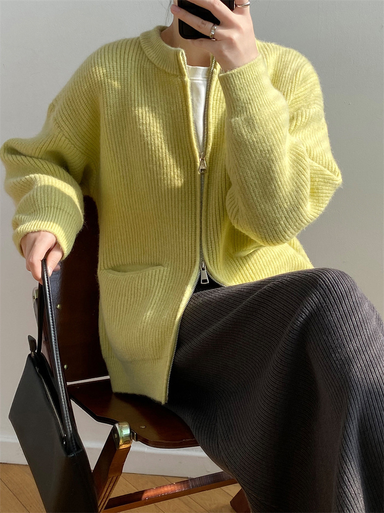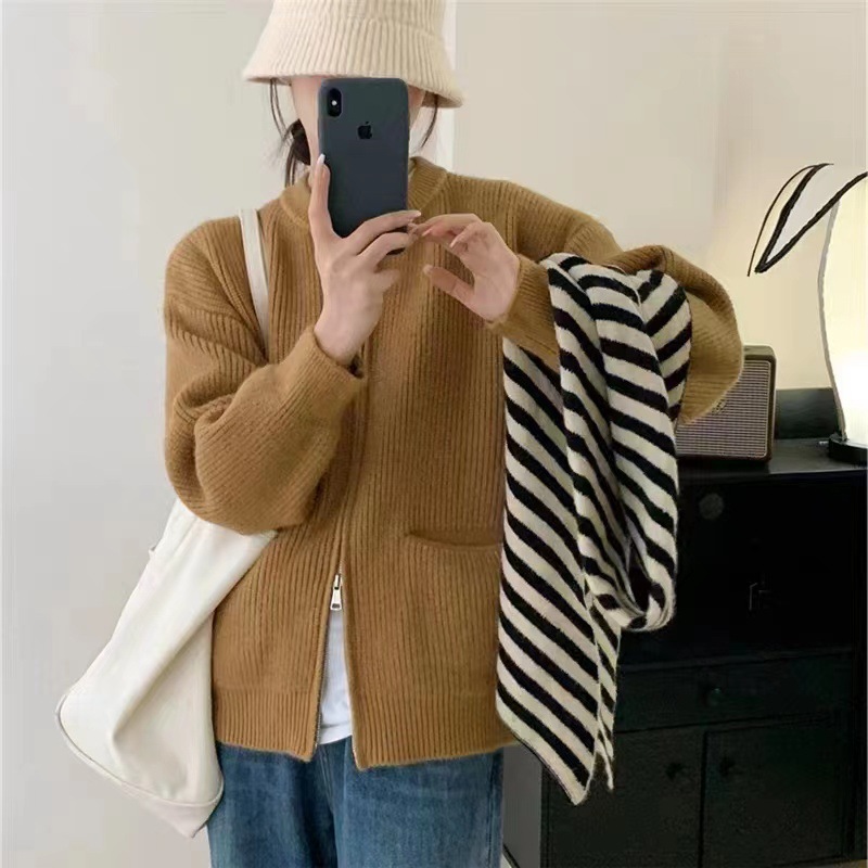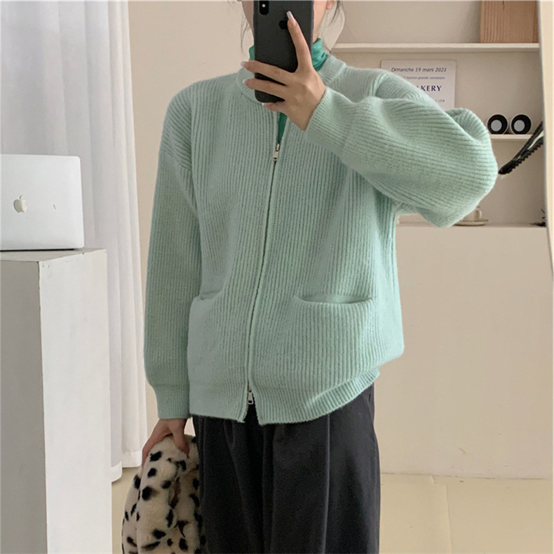 더블 지퍼 솔리드 컬러 디자인 스웨터 카디건 여성의 2023 가을 겨울 새로운 한국 스타일 느슨한 캐주얼 니트 스웨터스토어 가기