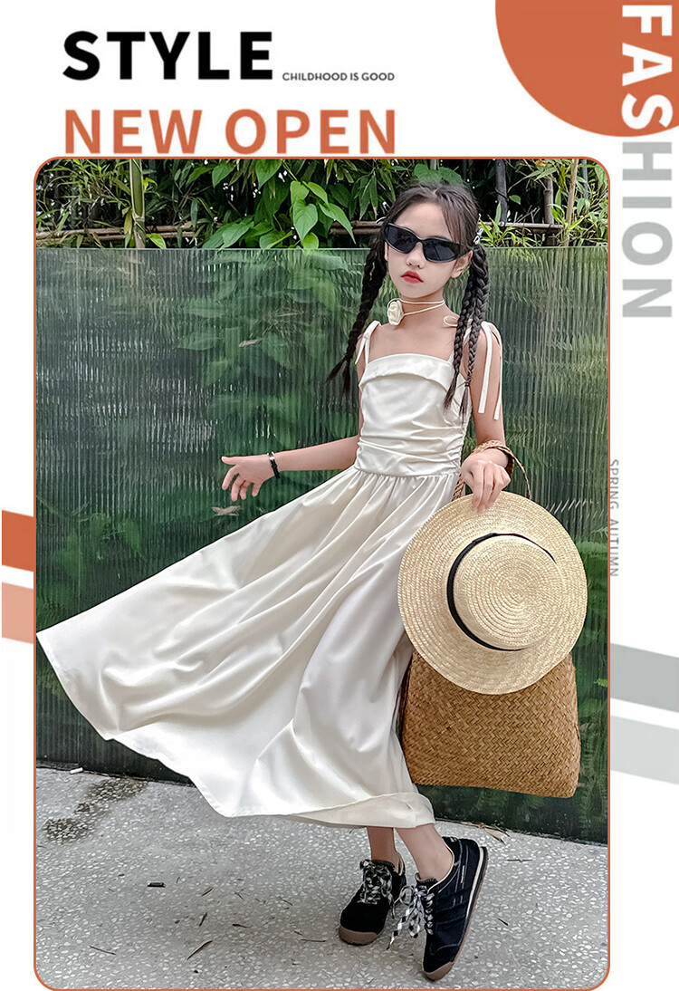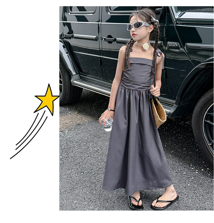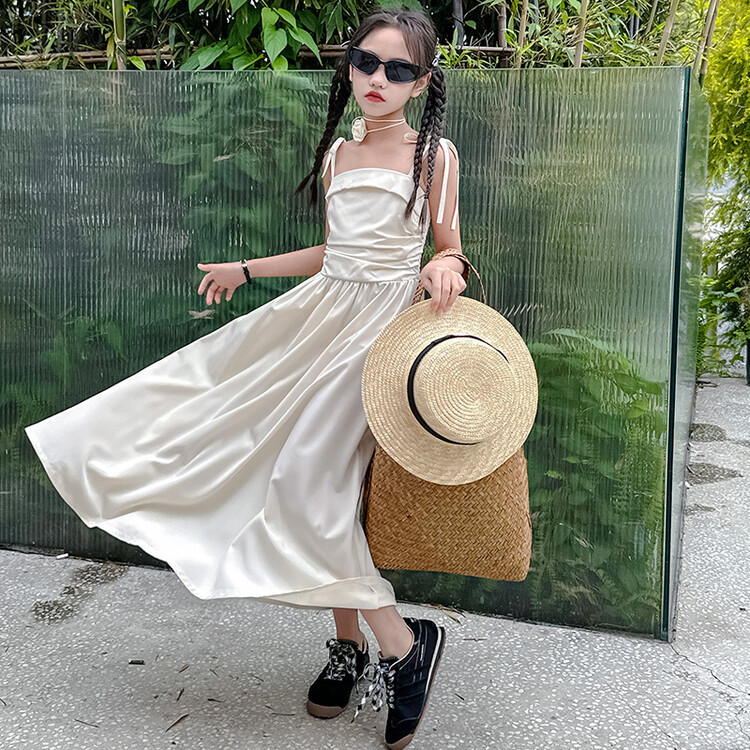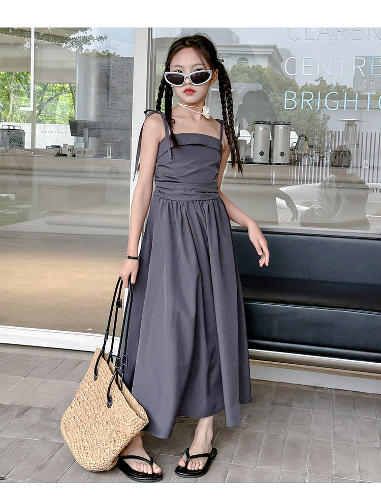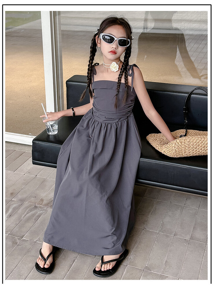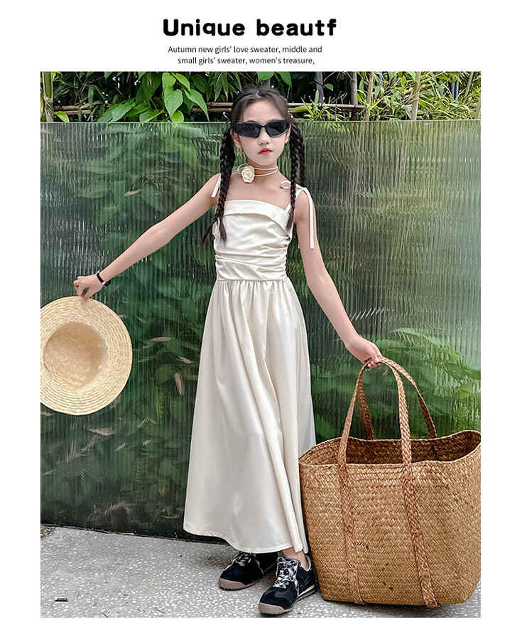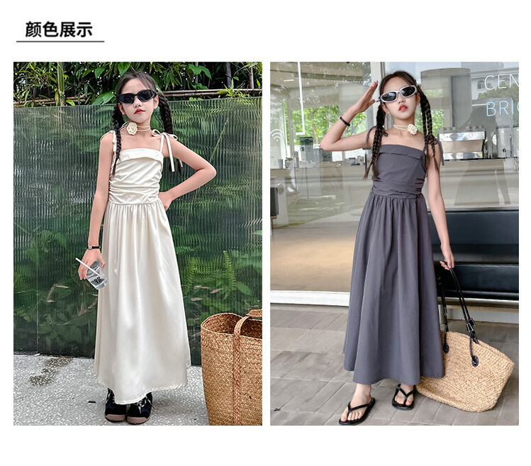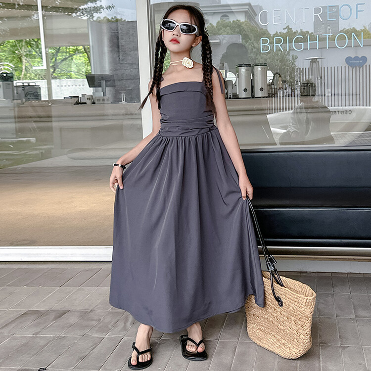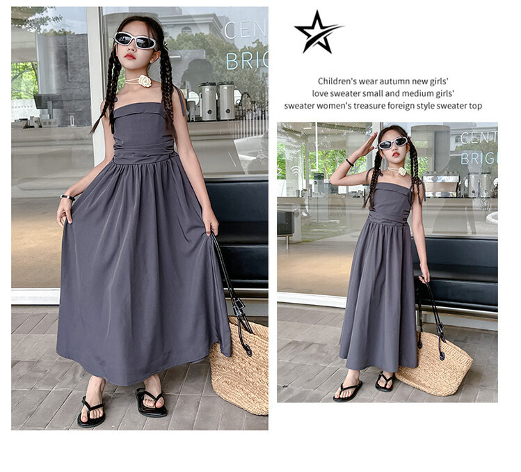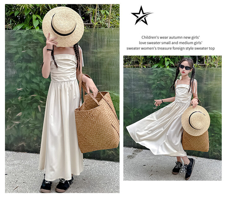 소녀들의 스트랩리스 원피스 여름 소녀들의 세련 된 슬링 스커트 2024 큰 아이들을위한 새로운 도착 한국식 롱 비치 스커트