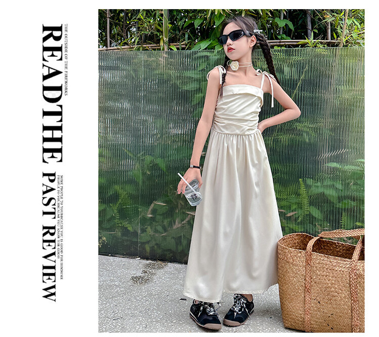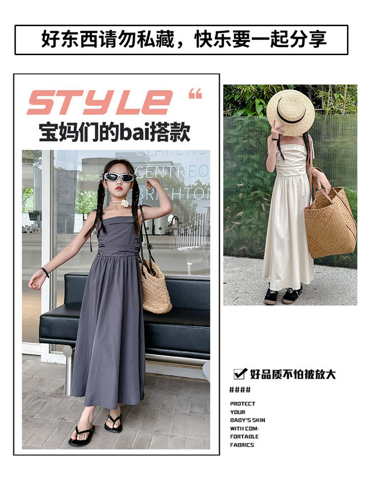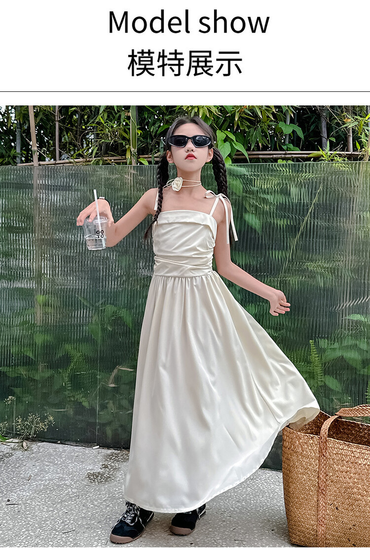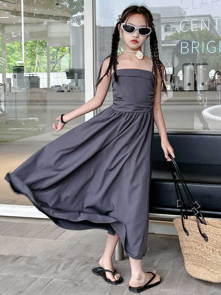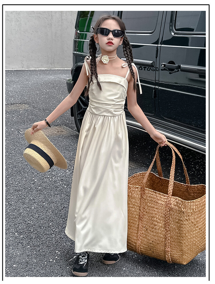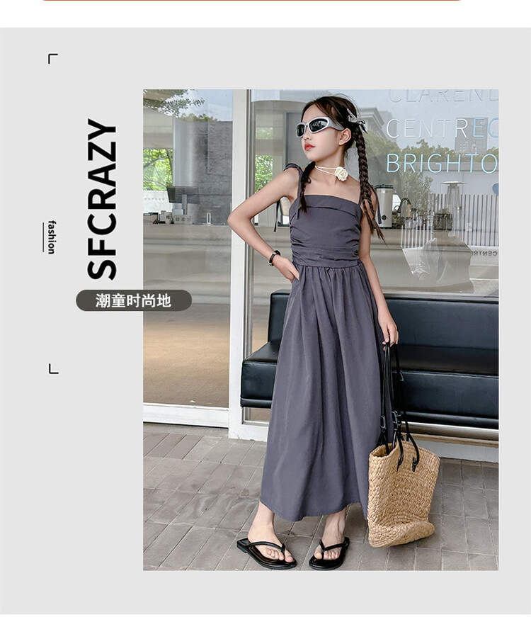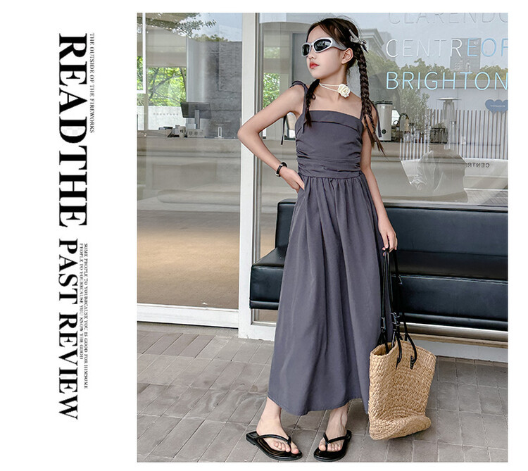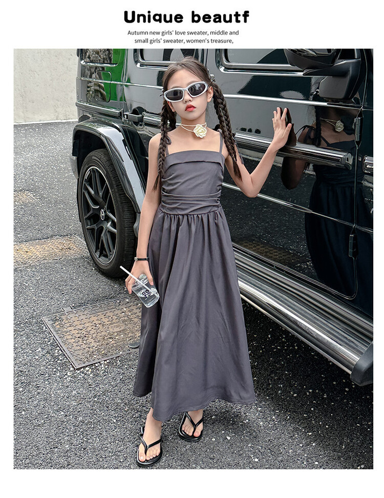 소녀들의 스트랩리스 원피스 여름 소녀들의 세련 된 슬링 스커트 2024 큰 아이들을위한 새로운 도착 한국식 롱 비치 스커트