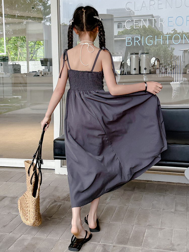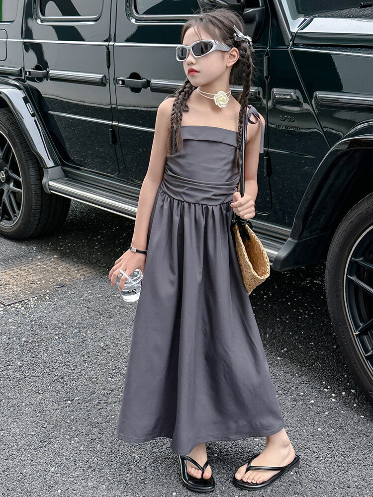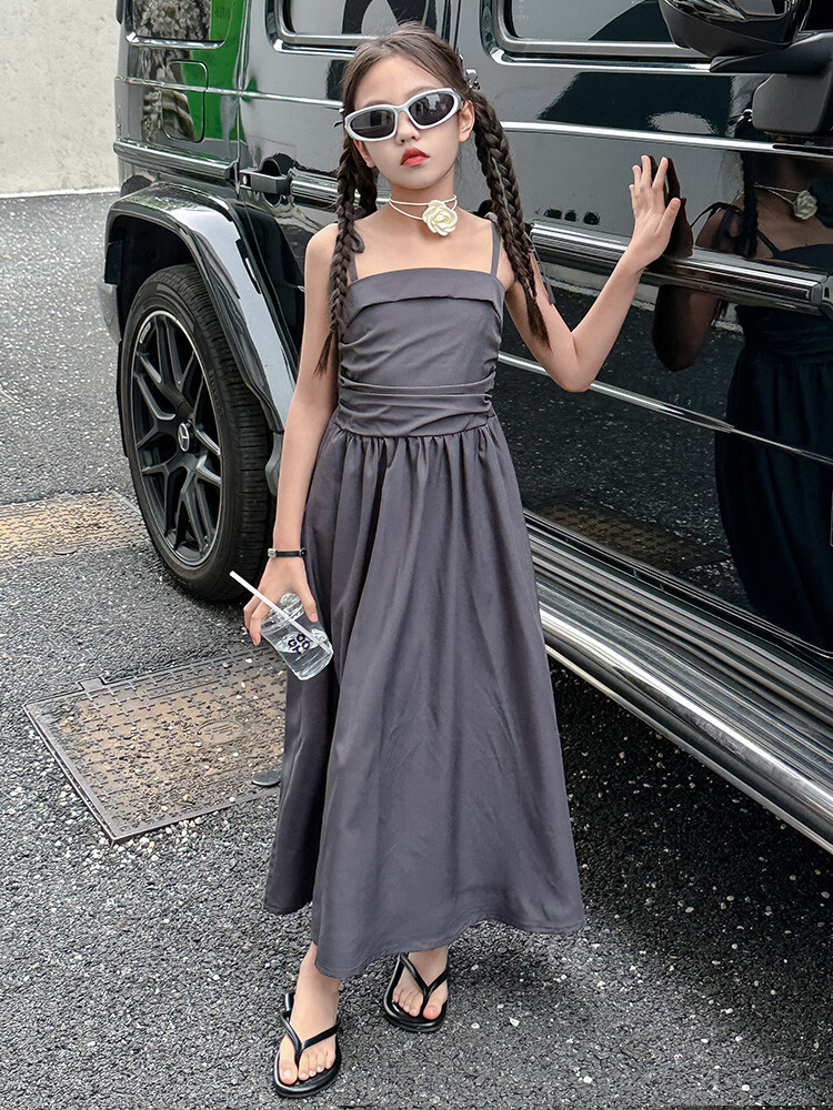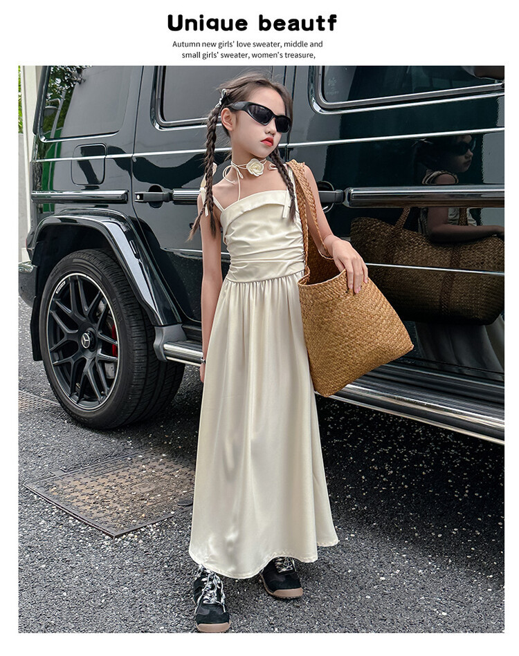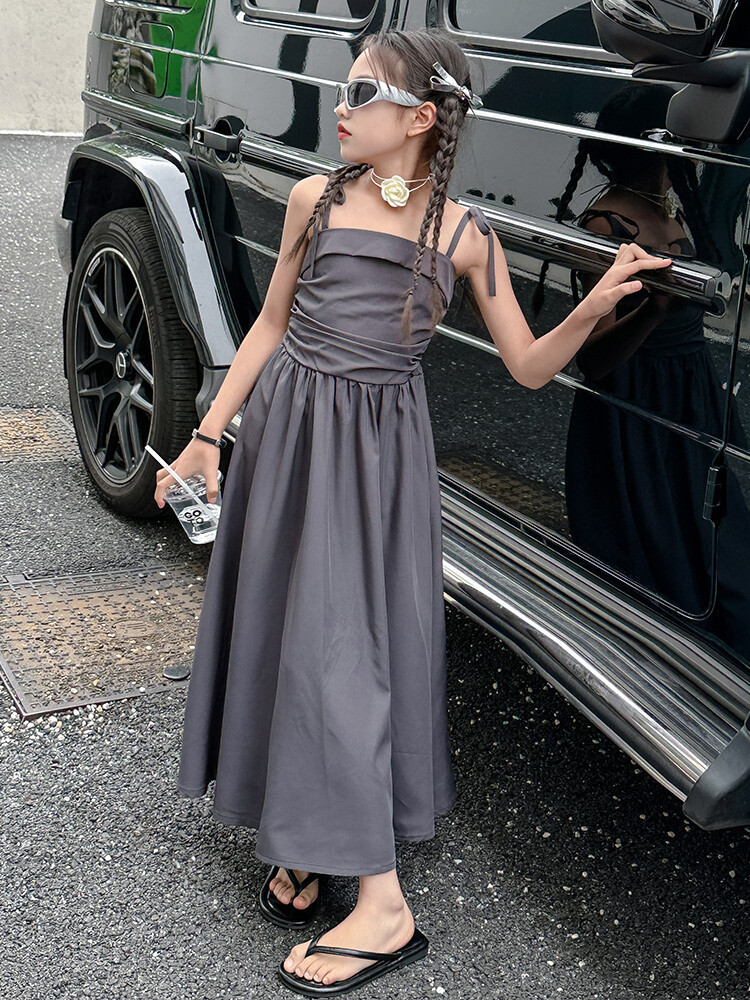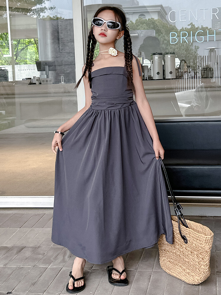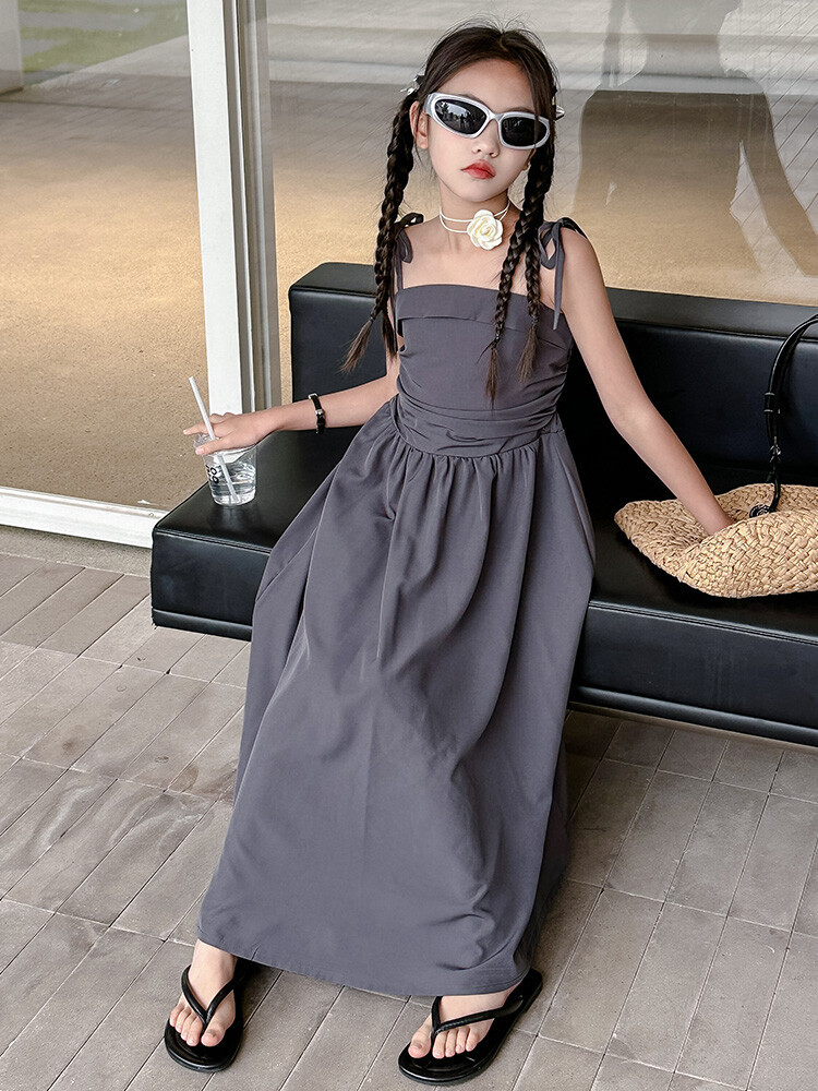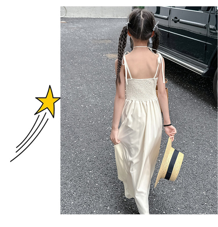 소녀들의 스트랩리스 원피스 여름 소녀들의 세련 된 슬링 스커트 2024 큰 아이들을위한 새로운 도착 한국식 롱 비치 스커트