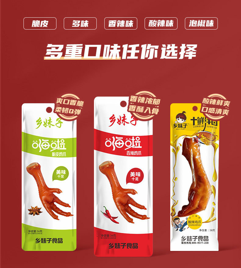 Xiangmeizi 멀티 맛 치킨 피트 오픈 백 인스턴트 진공 포장 절인 닭 발 캐주얼 요리 식품 절인 스낵 도매스토어 가기