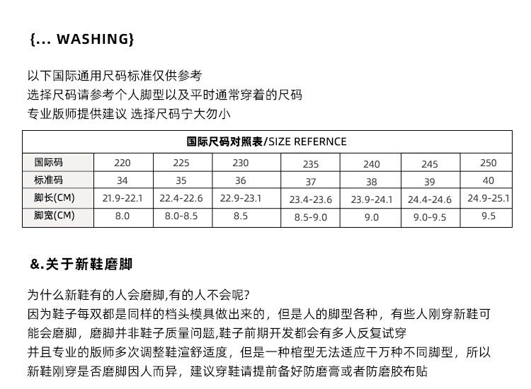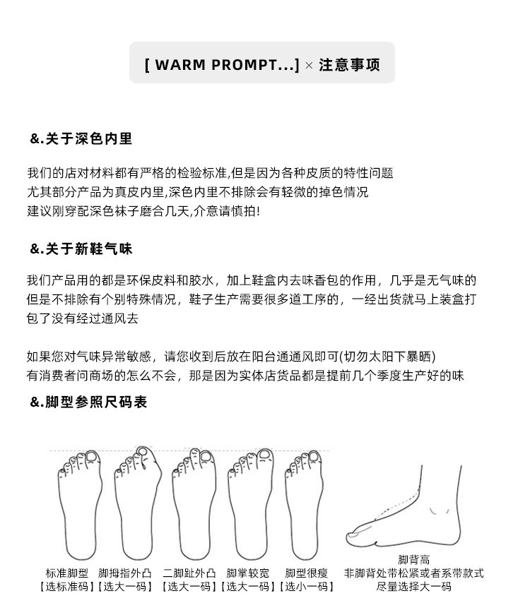 【关于尺码】是否偏小请关注颜色分类处有没有(偏小一码)的备注。如果没有均为标准码,按照平时的拍就可以了。脚肉的亲可以酌情往大一码拍