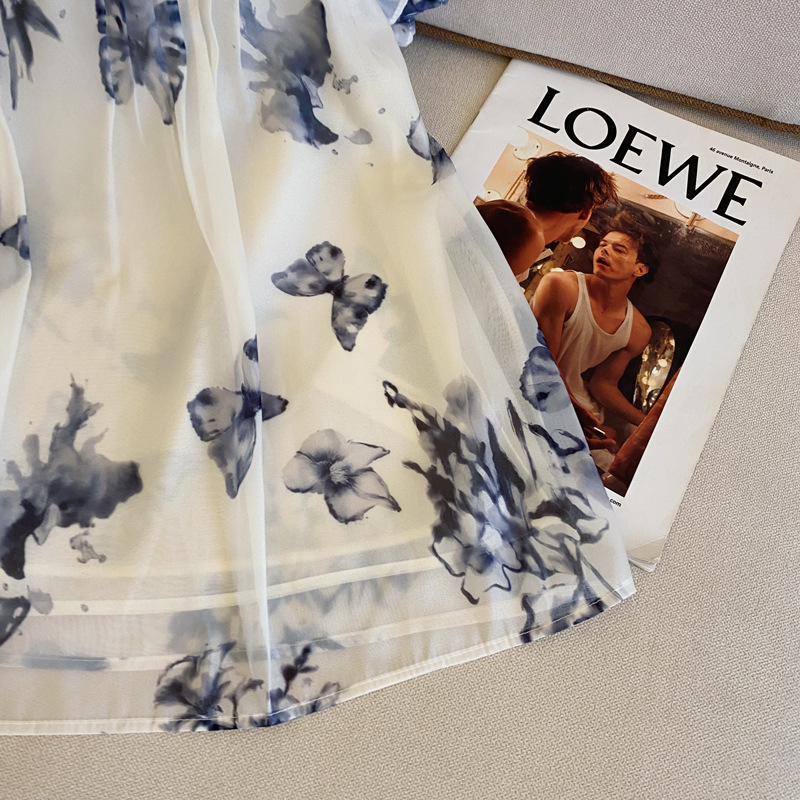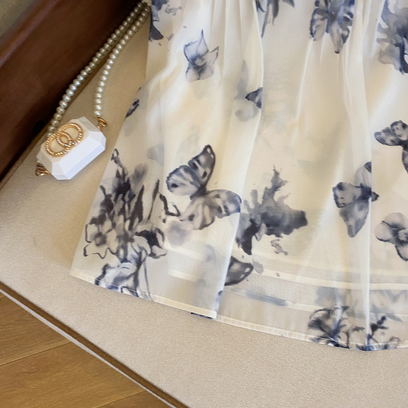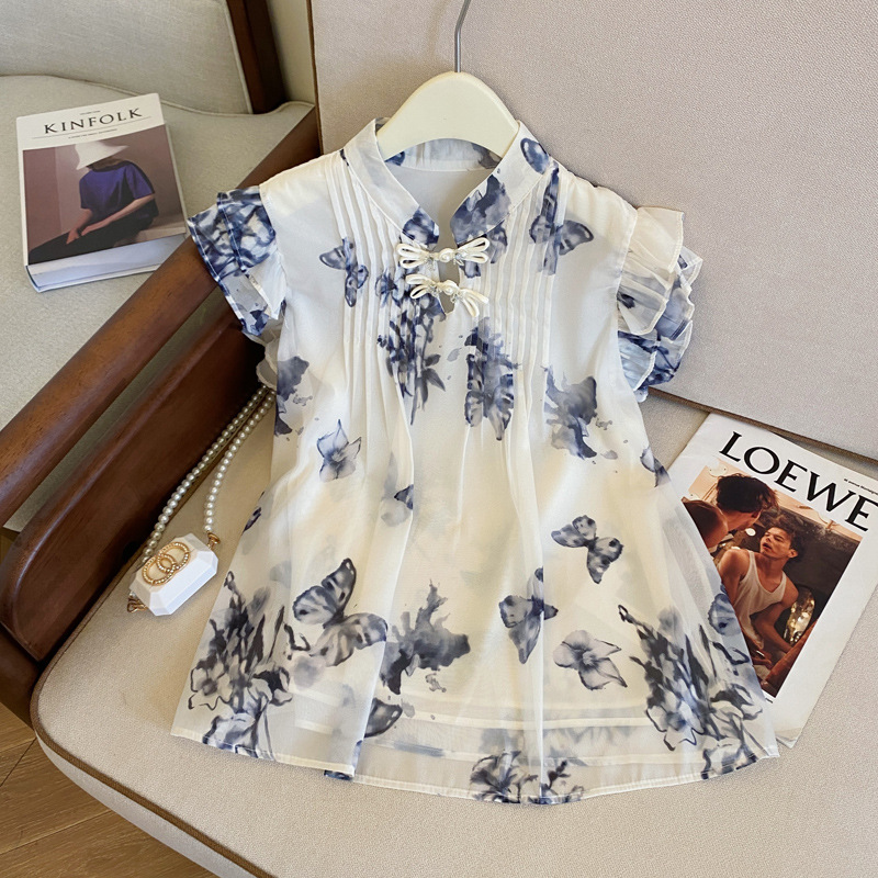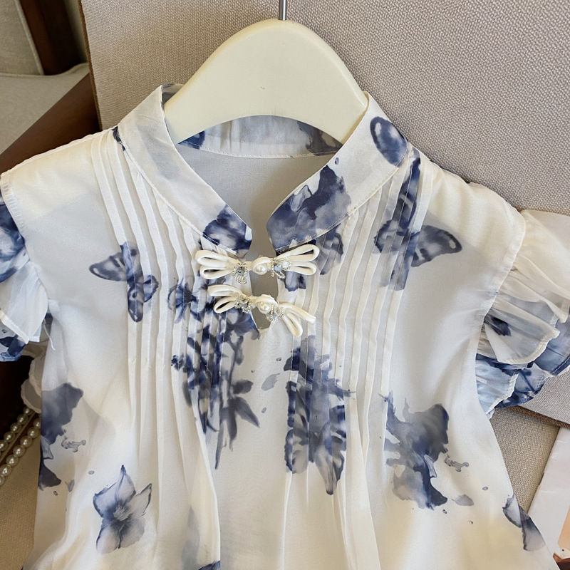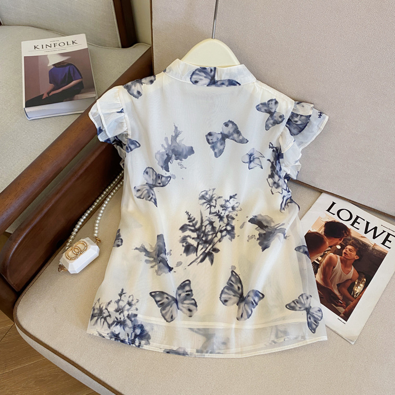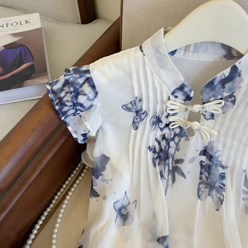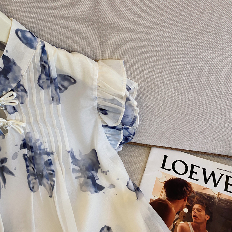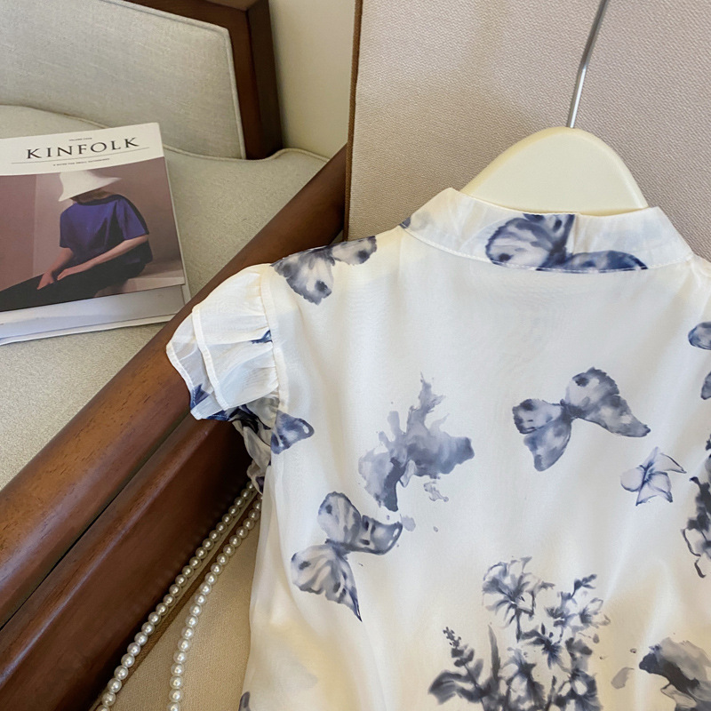 实拍水墨蝴蝶新中式国风晕染小飞袖衬衫女夏季新款盘扣雪纺衫上衣