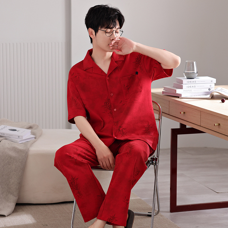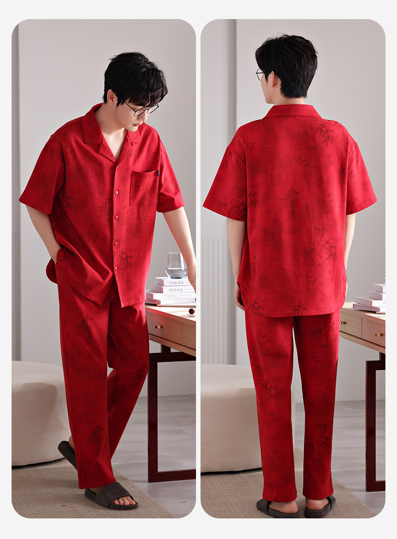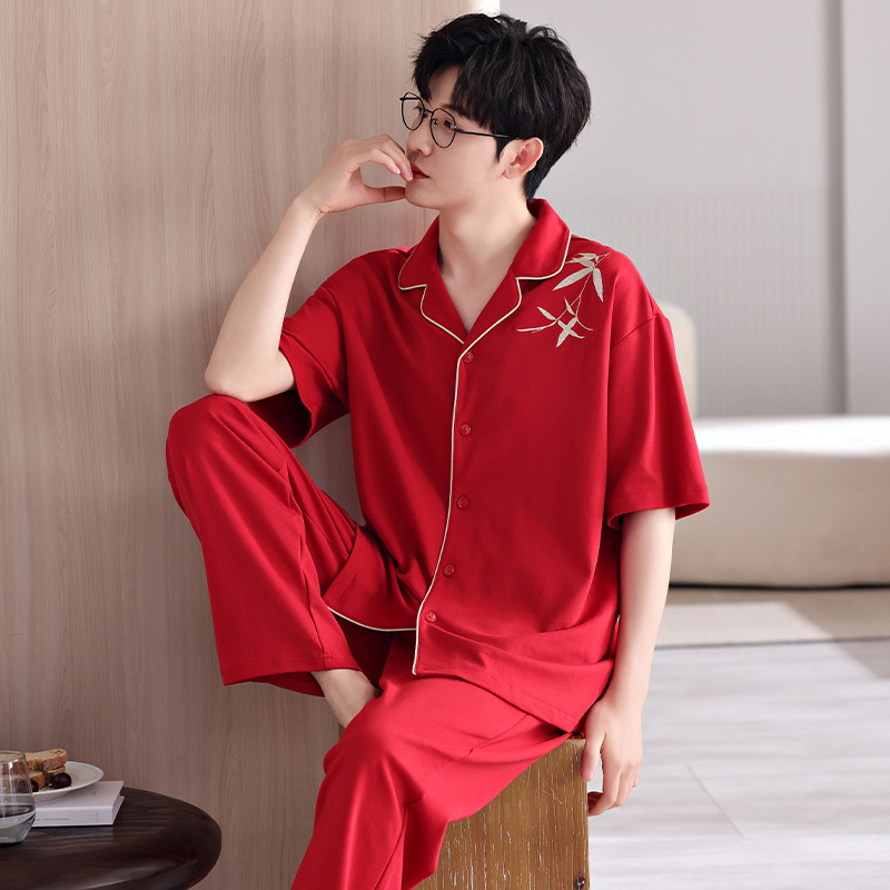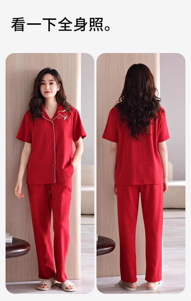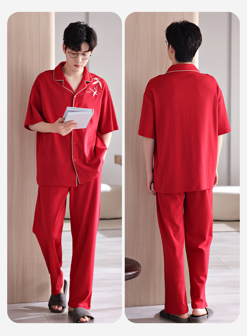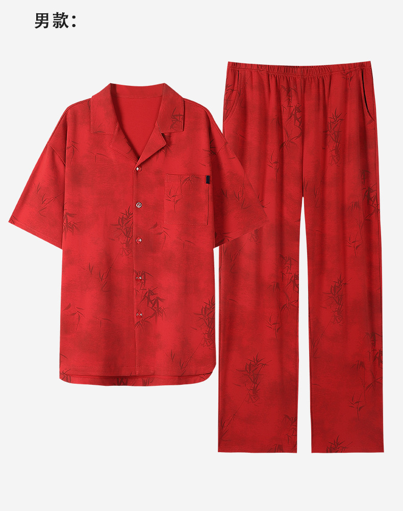 커플 잠옷 여름 새로운 순면 레드 반팔 바지 여성 결혼식 해 남자의 멋진 얇은 홈 옷