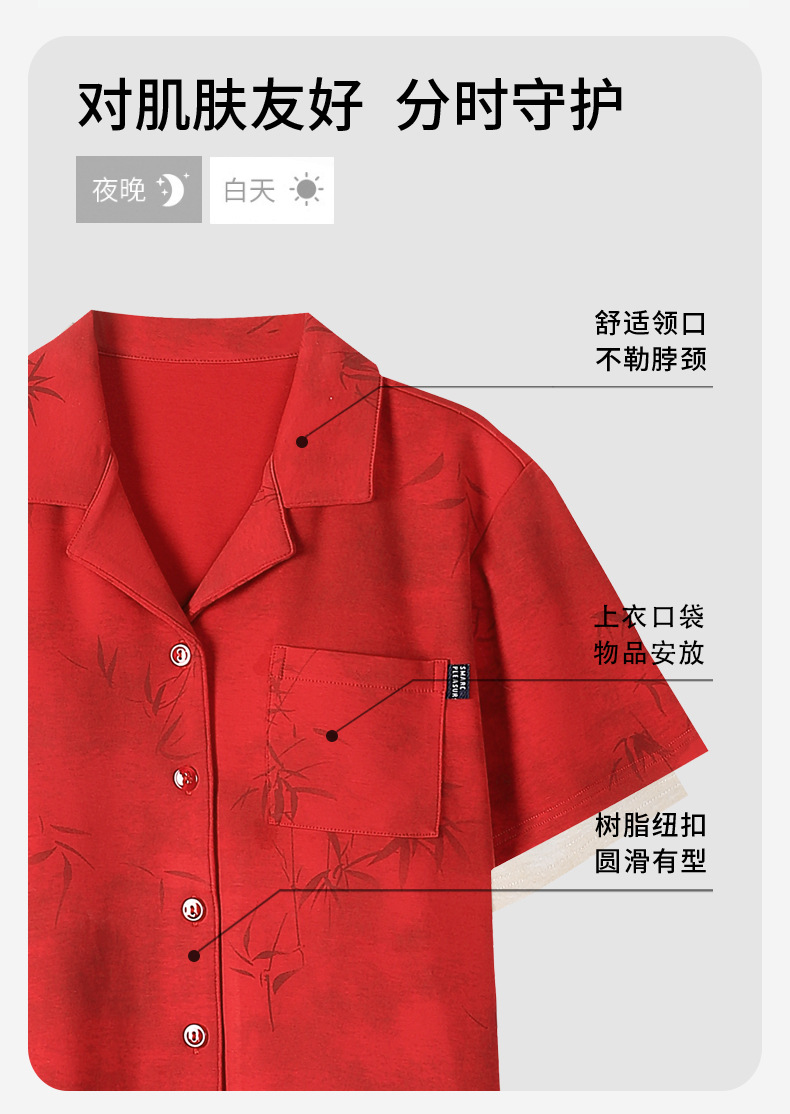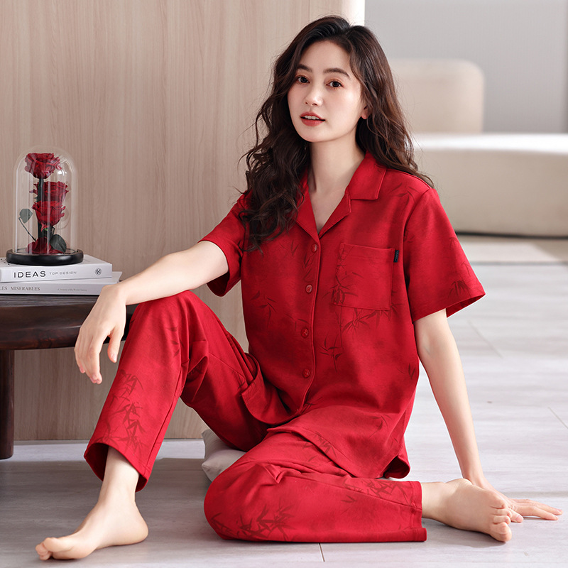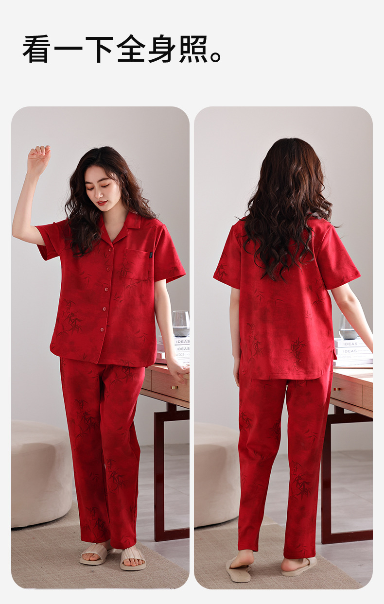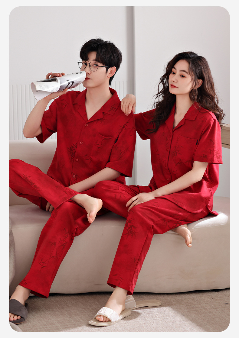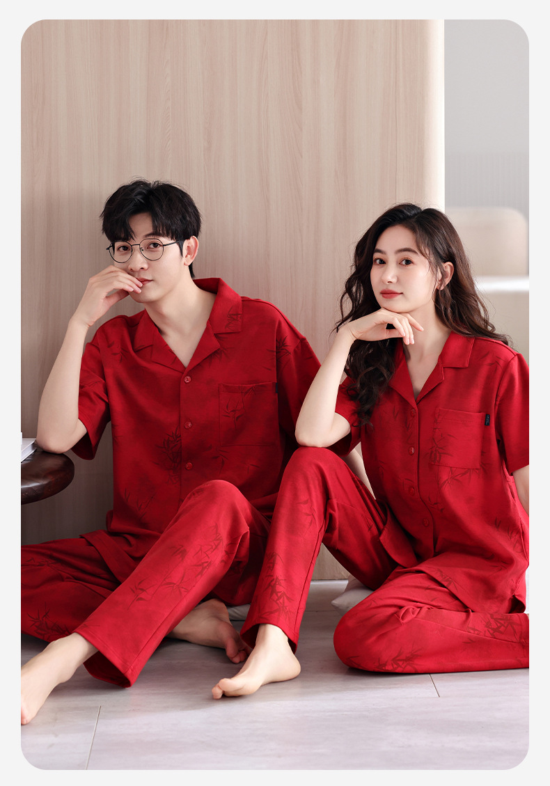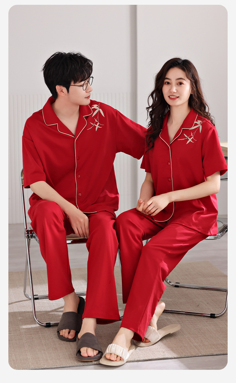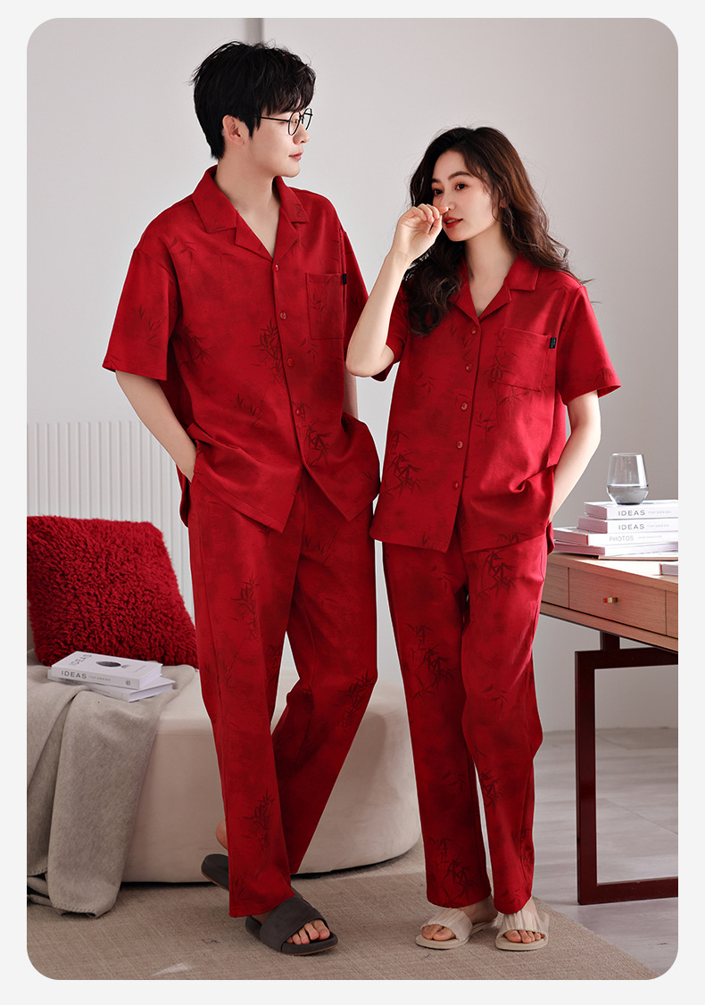 커플 잠옷 여름 새로운 순면 레드 반팔 바지 여성 결혼식 해 남자의 멋진 얇은 홈 옷스토어 가기