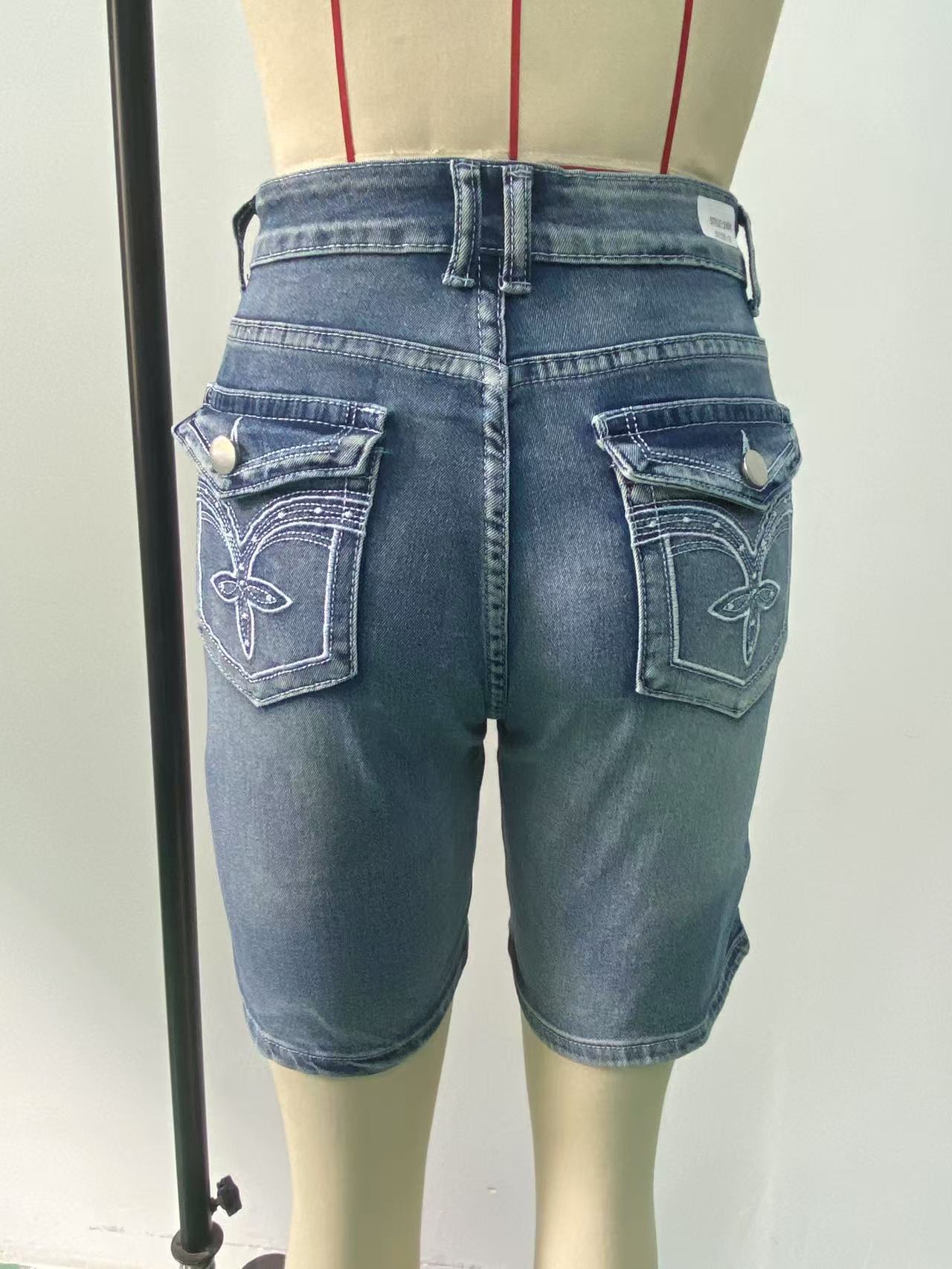 유럽과 미국 여성 청바지 국경 독점 데님 패션 슬림 스트레치 데님 중간 바지 자수 청바지