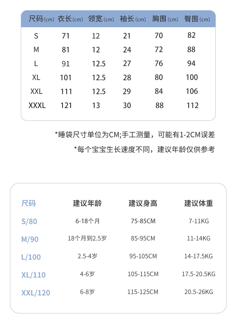 • 침낭 자체는 옷보다 크고 아기의 높이에 따라 구입하십시오.