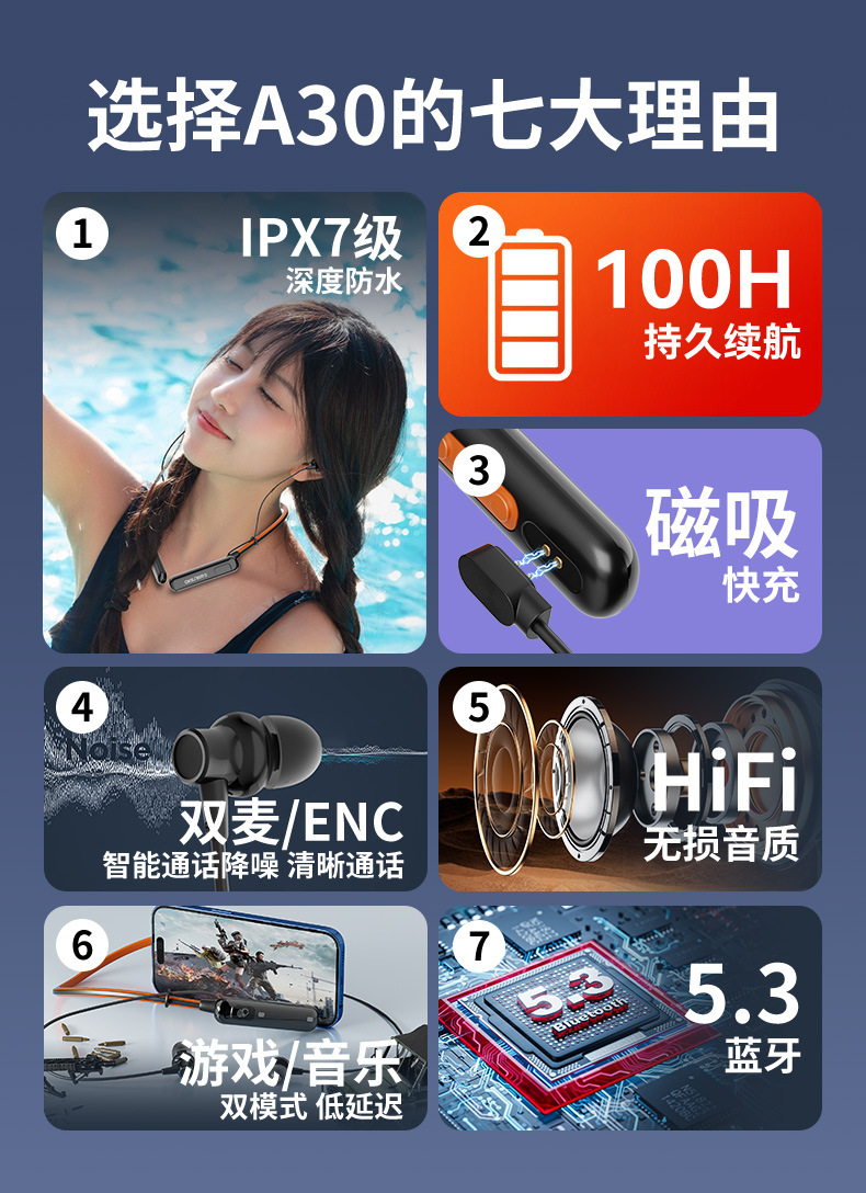 새로운 교수형 목 귀 무선 블루투스 헤드셋 IPX7 방수 ANC 소음 감소 긴 배터리 수명 스포츠 게임 헤드셋스토어 가기