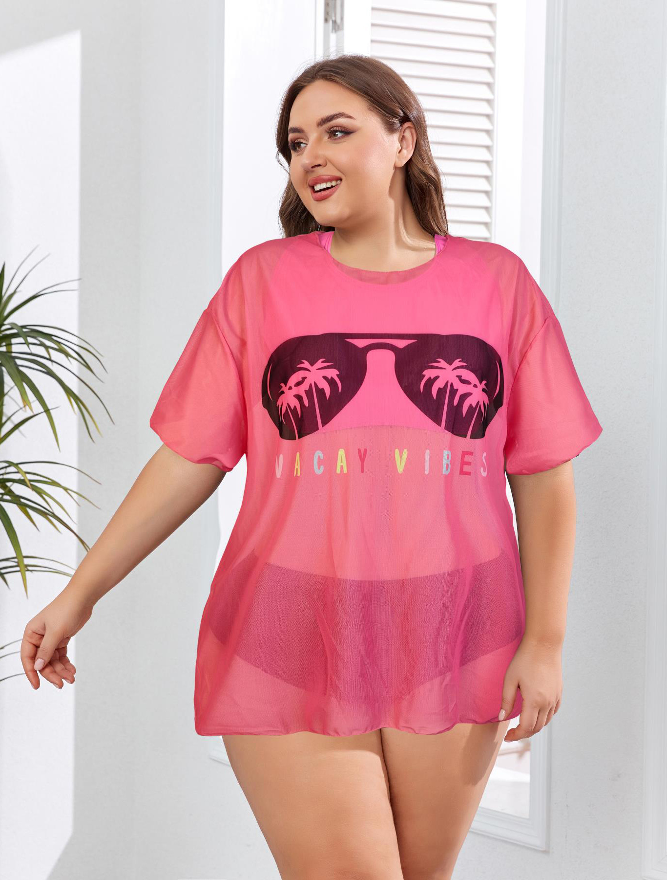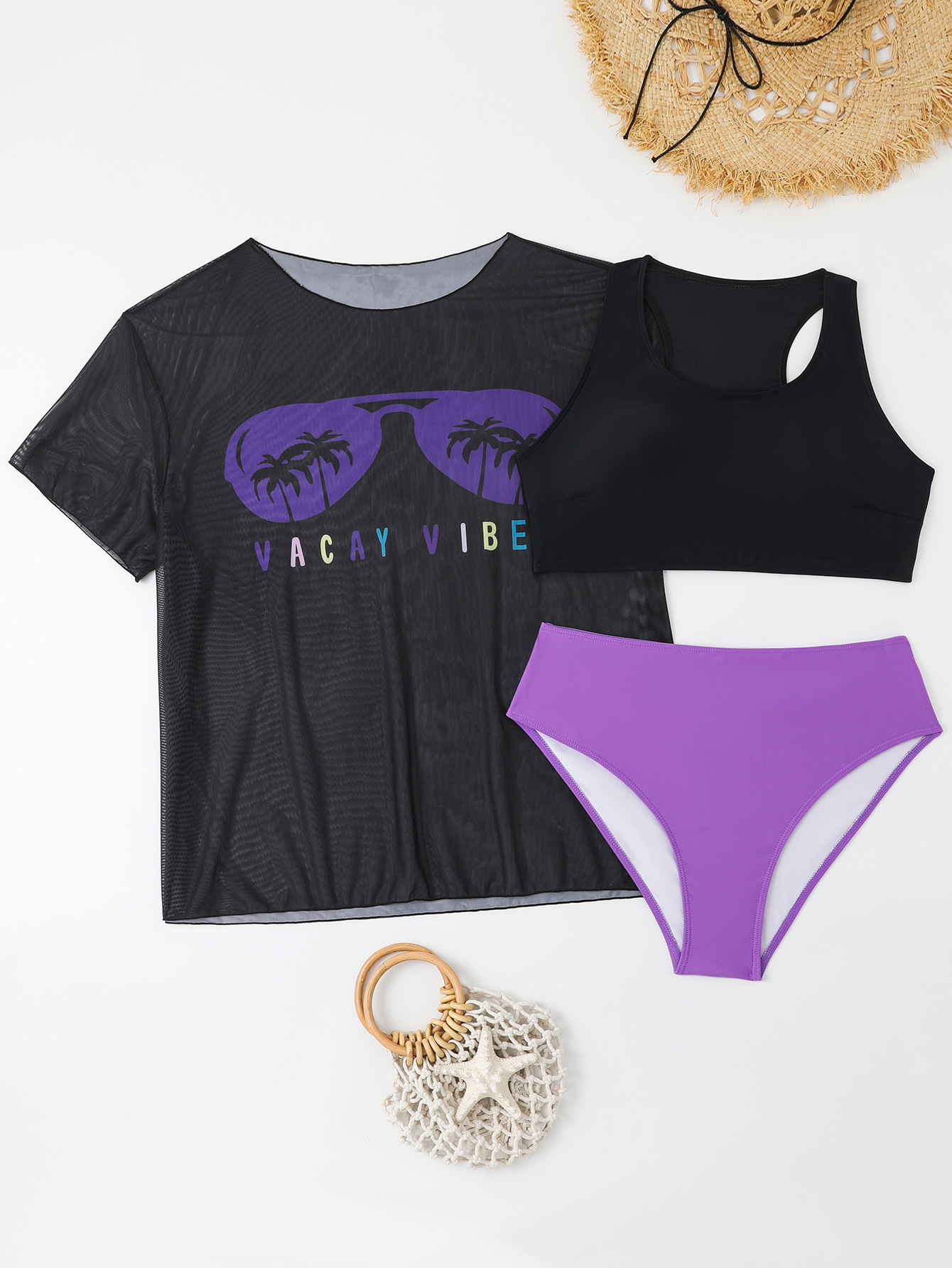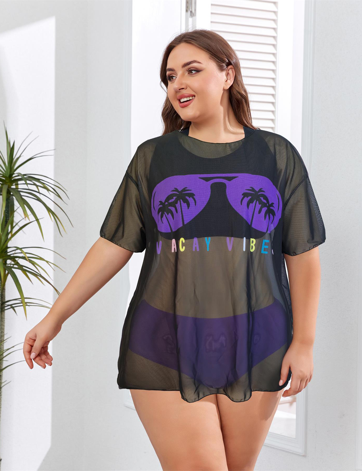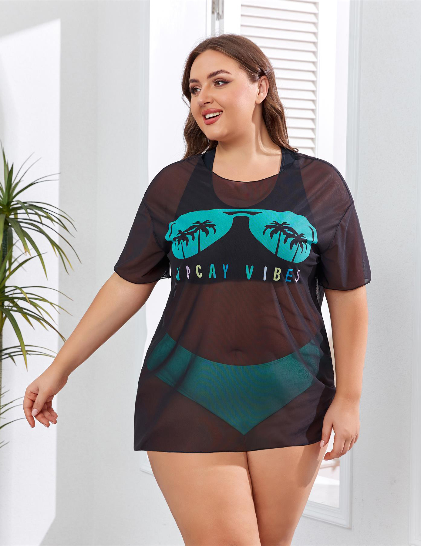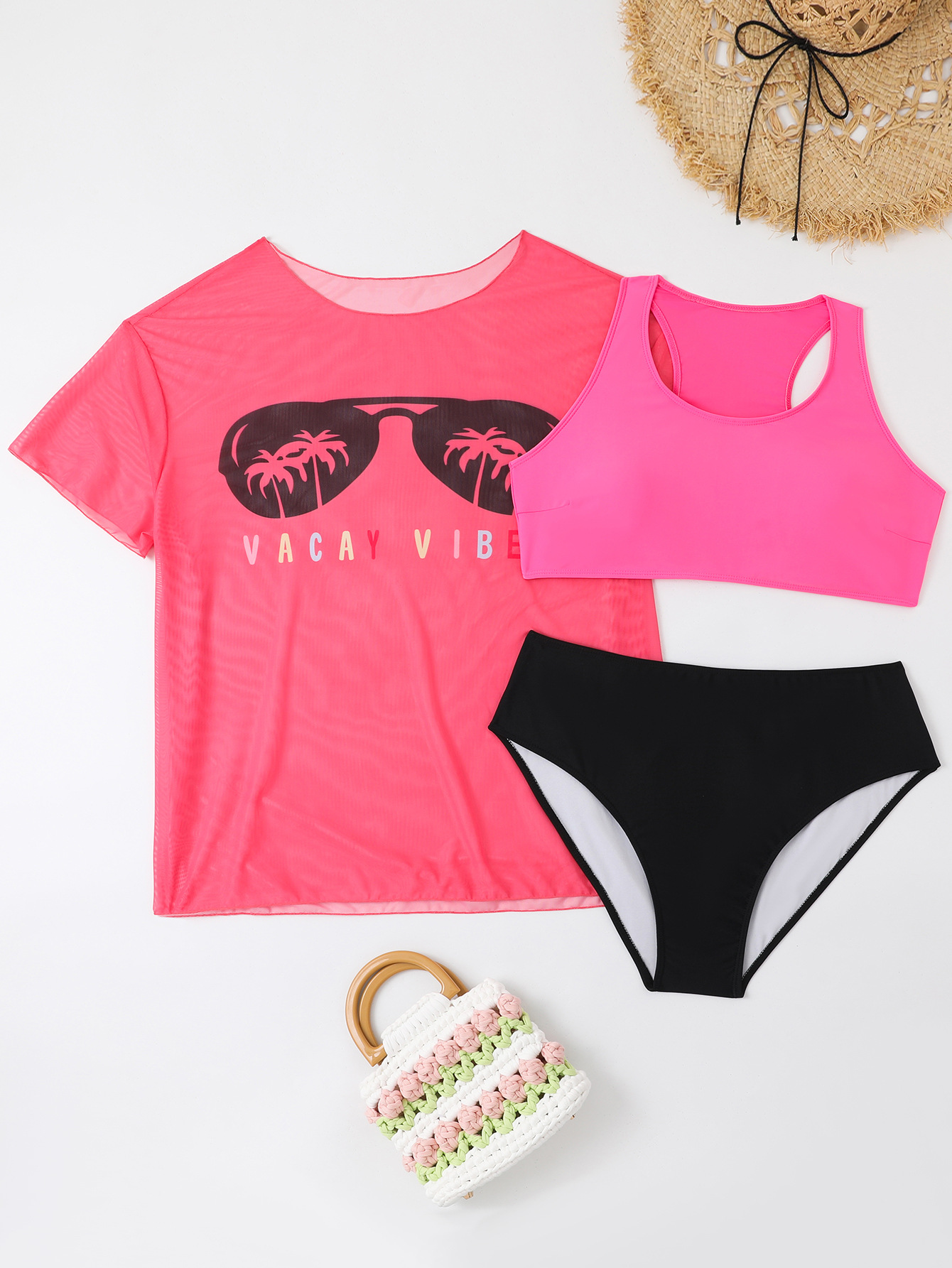 2024 유럽과 미국의 새로운 대외 무역 수영복 고정 판 인쇄 메쉬 관점 블라우스 플러스 사이즈 비키니 3 조각 수영복스토어 가기