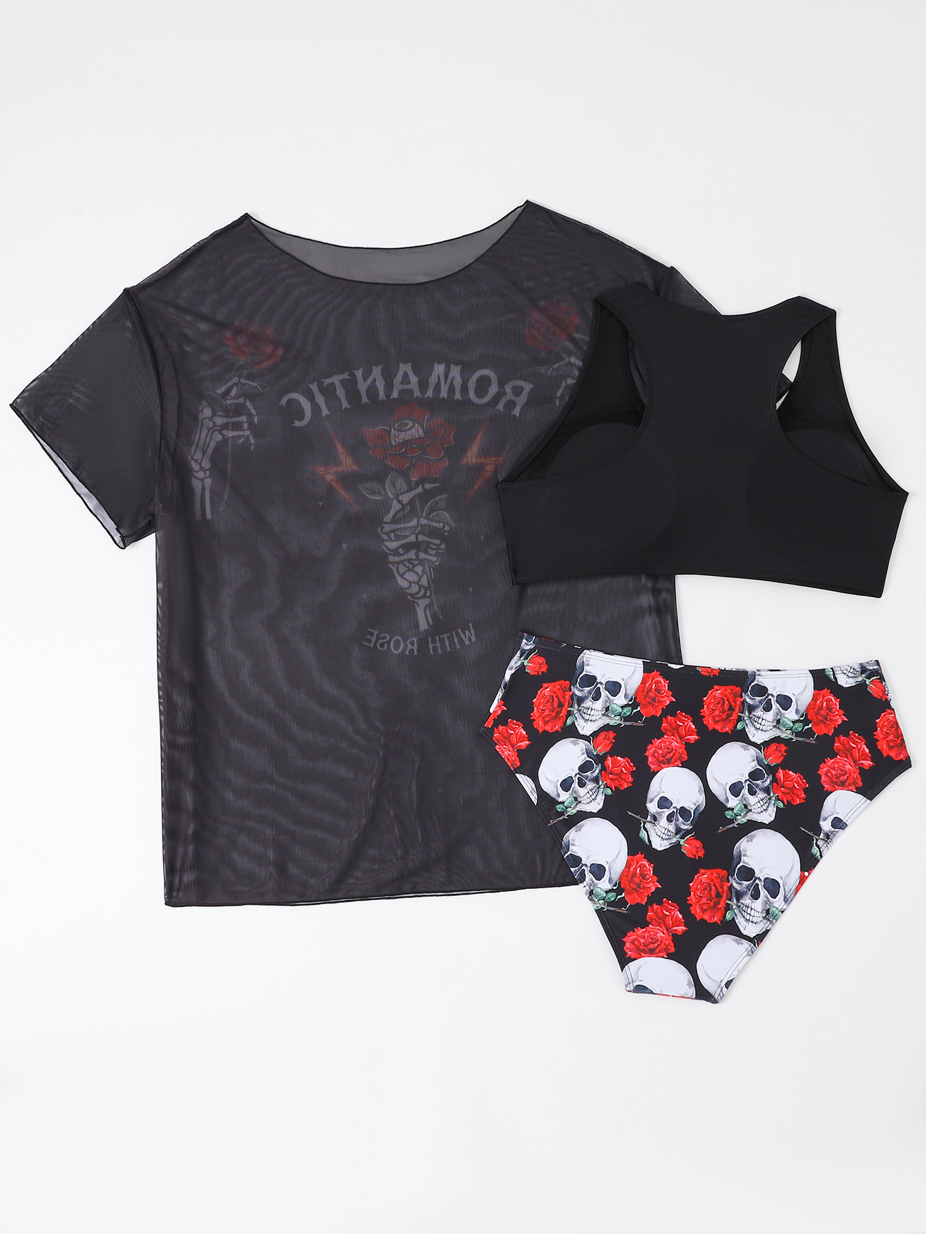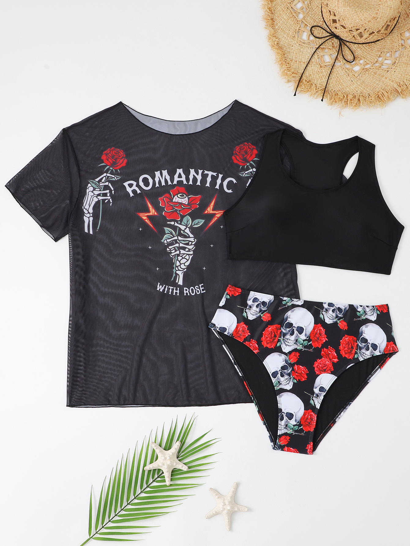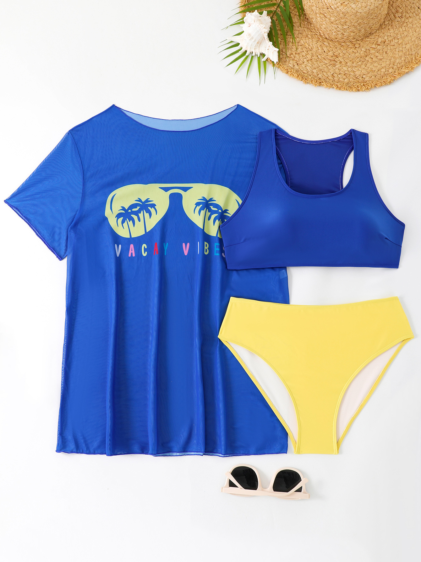 2024 유럽과 미국의 새로운 대외 무역 수영복 고정 판 인쇄 메쉬 관점 블라우스 플러스 사이즈 비키니 3 조각 수영복
