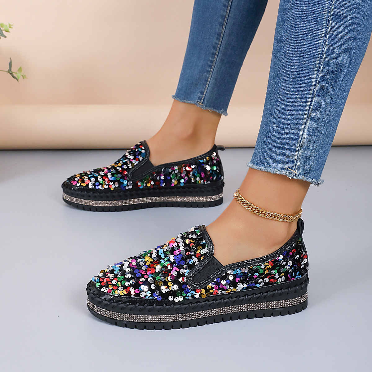 2024 국경 간 대외 무역 플러스 사이즈 여성 신발 봄 새로운 라운드 헤드 플랫 스팽글 컬러 매칭 패션 캐주얼 신발 여성스토어 가기