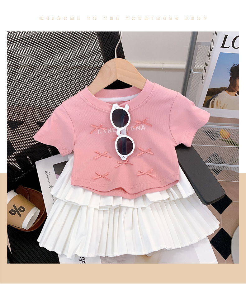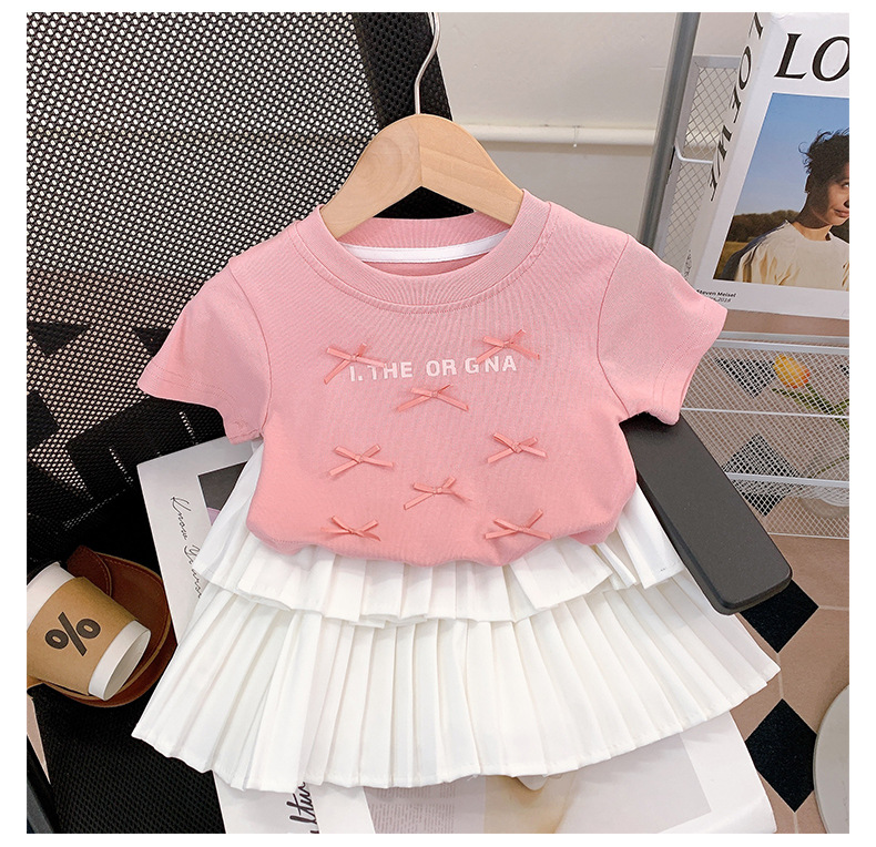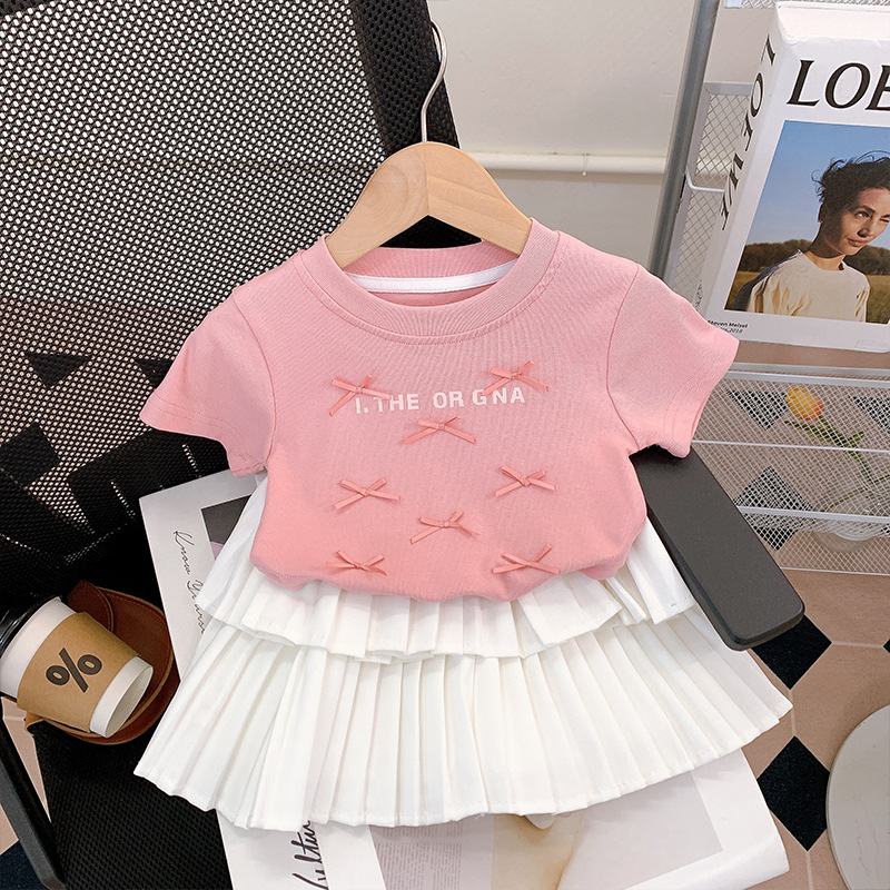 여름 옷 2025 여자 보우 반팔 티셔츠 + 주름 케이크 스커트 세트 편지 탑 스커트 투피스 세트스토어 가기