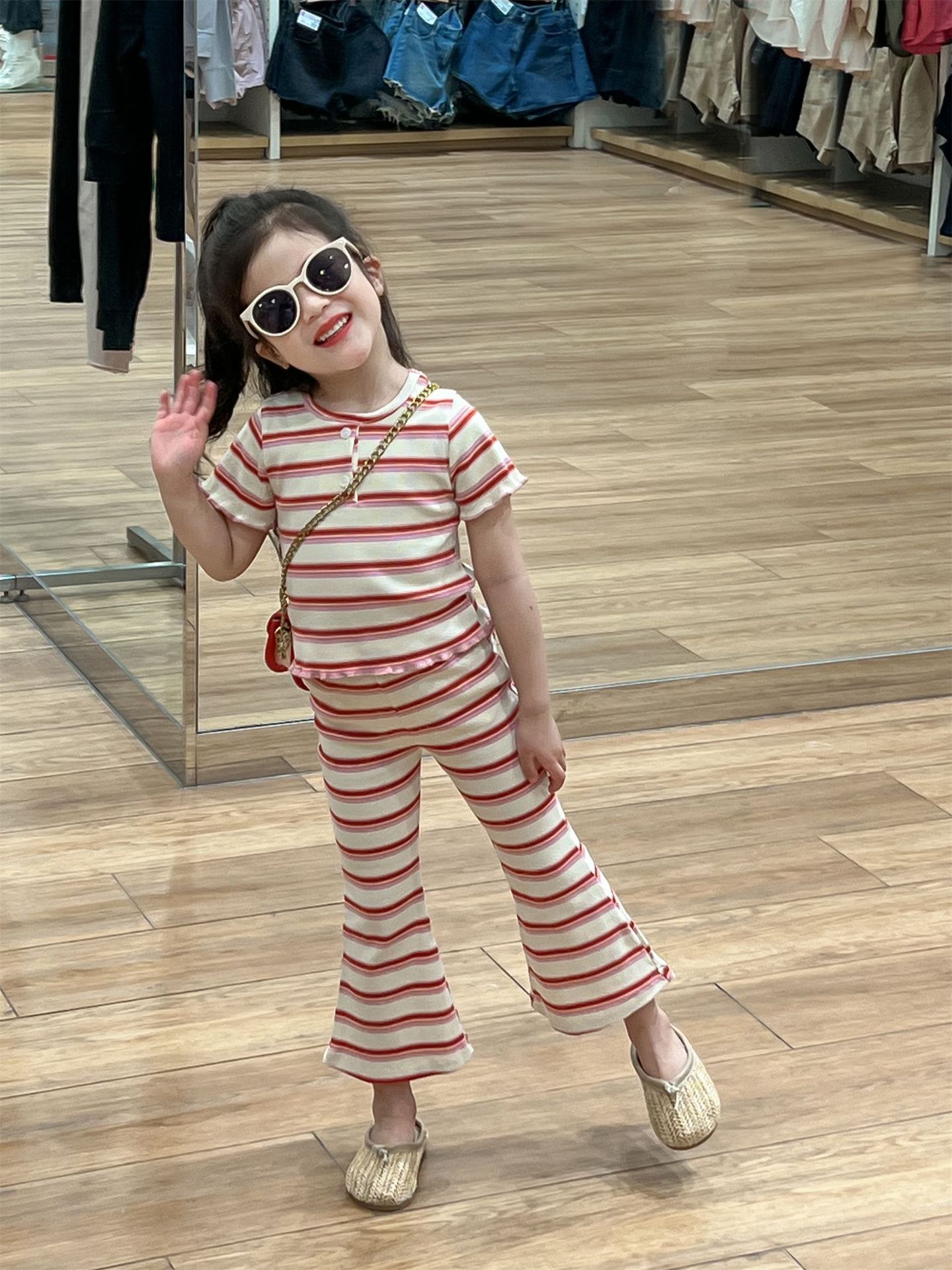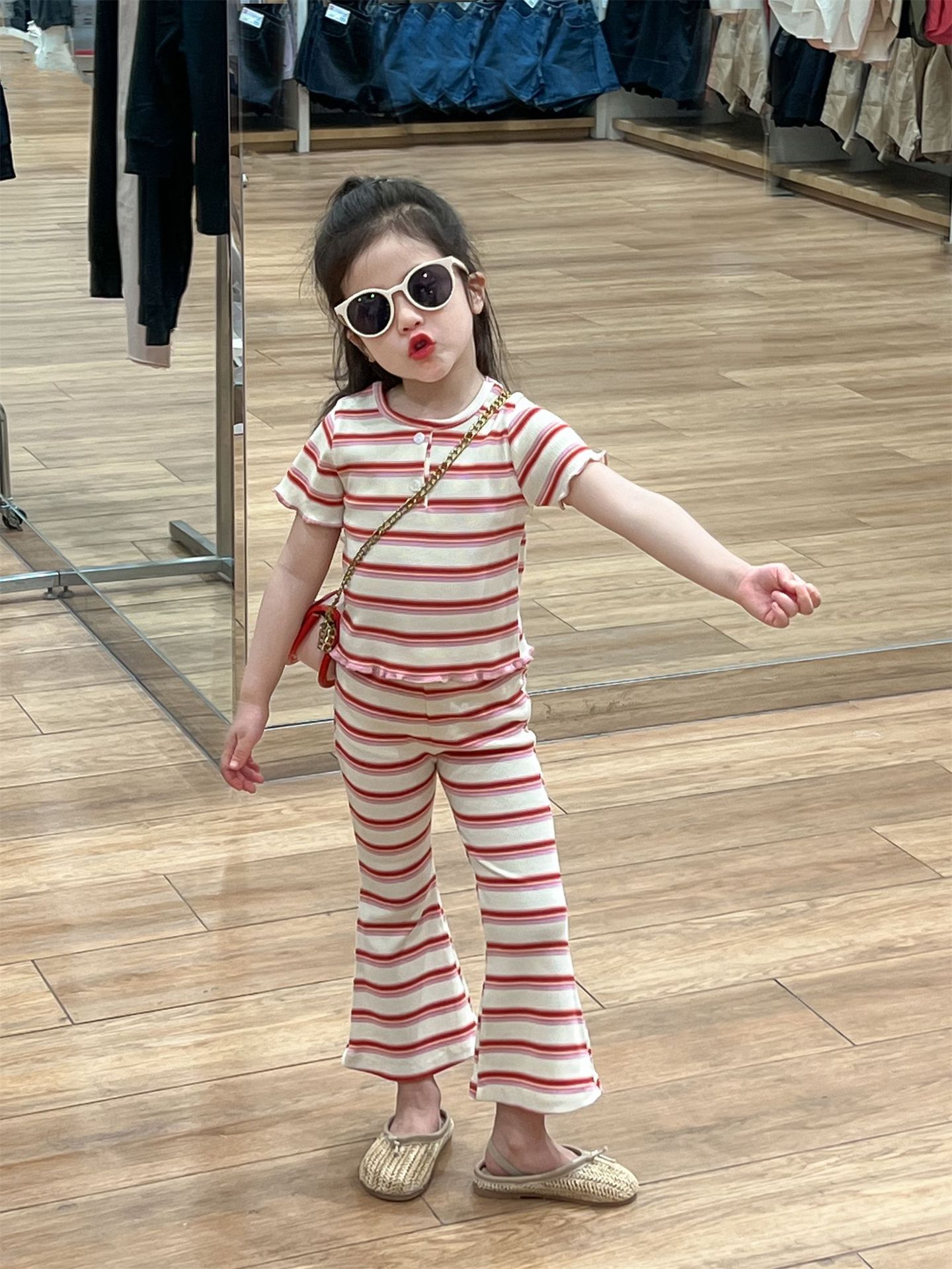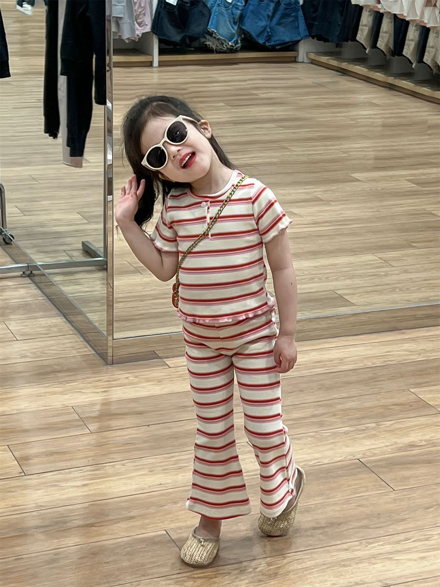 한국 아동복 소녀 2024 세트 여름 줄무늬 나무 귀 짧은 소매 티셔츠 플레어 바지 투피스 세트