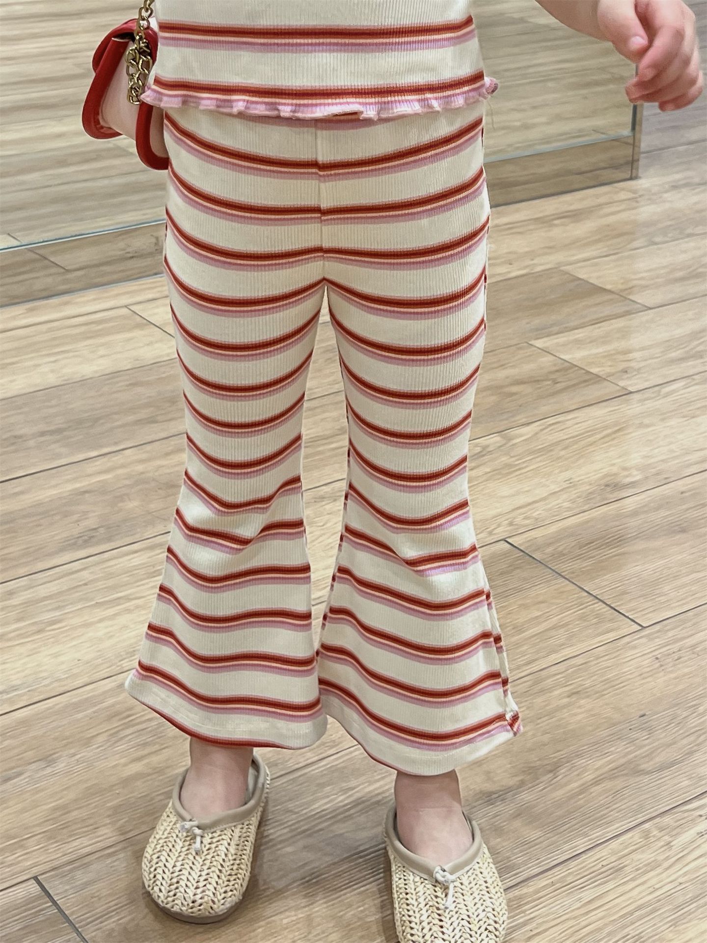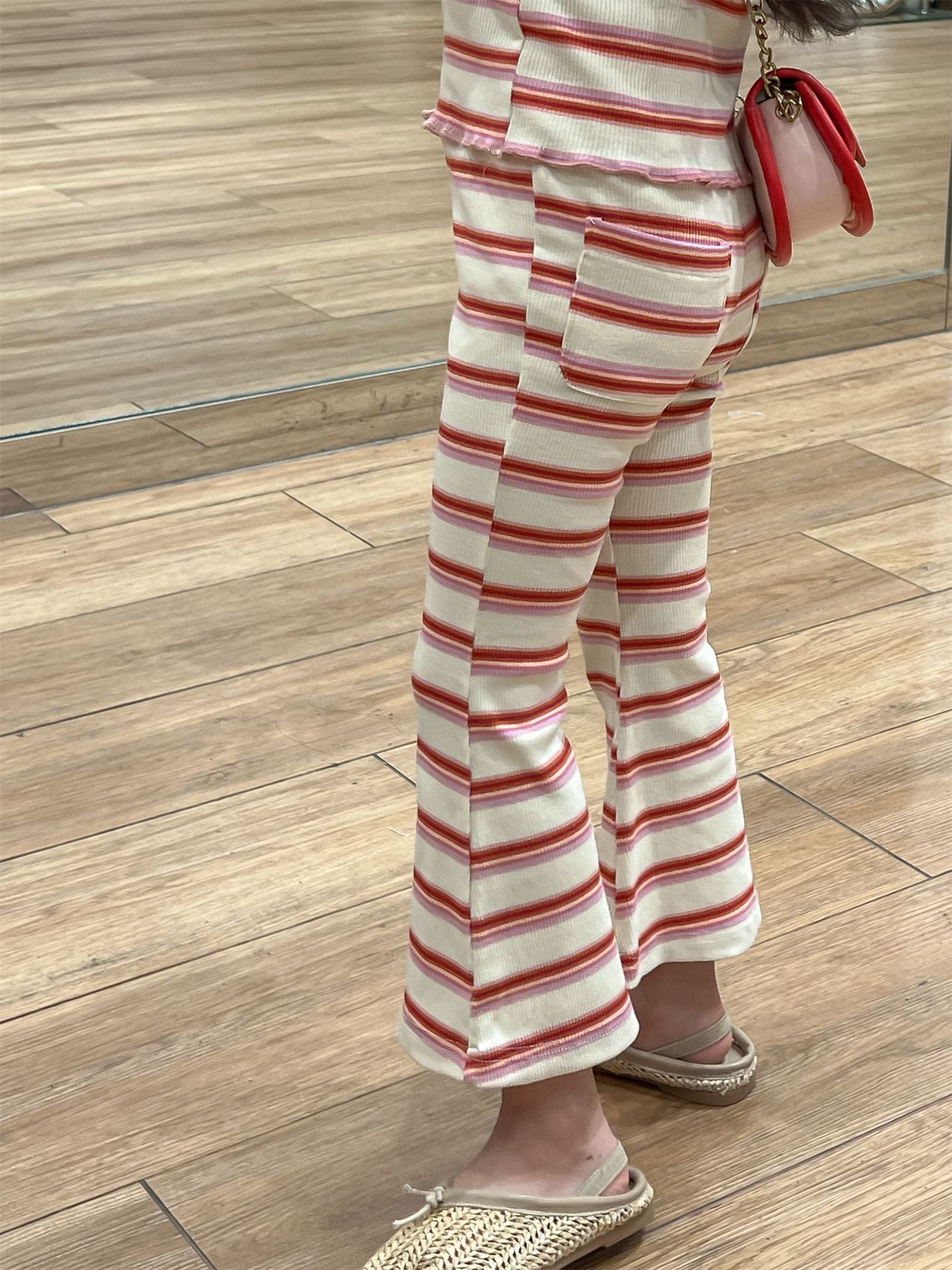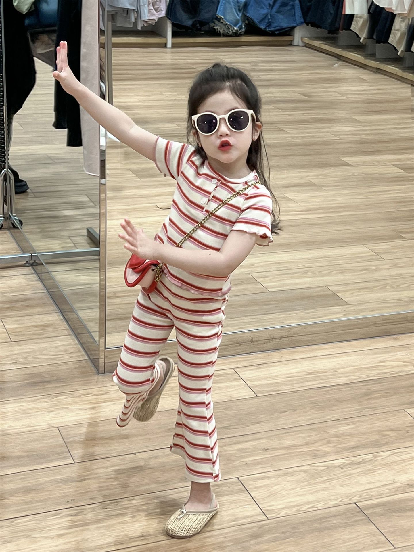 한국 아동복 소녀 2024 세트 여름 줄무늬 나무 귀 짧은 소매 티셔츠 플레어 바지 투피스 세트
