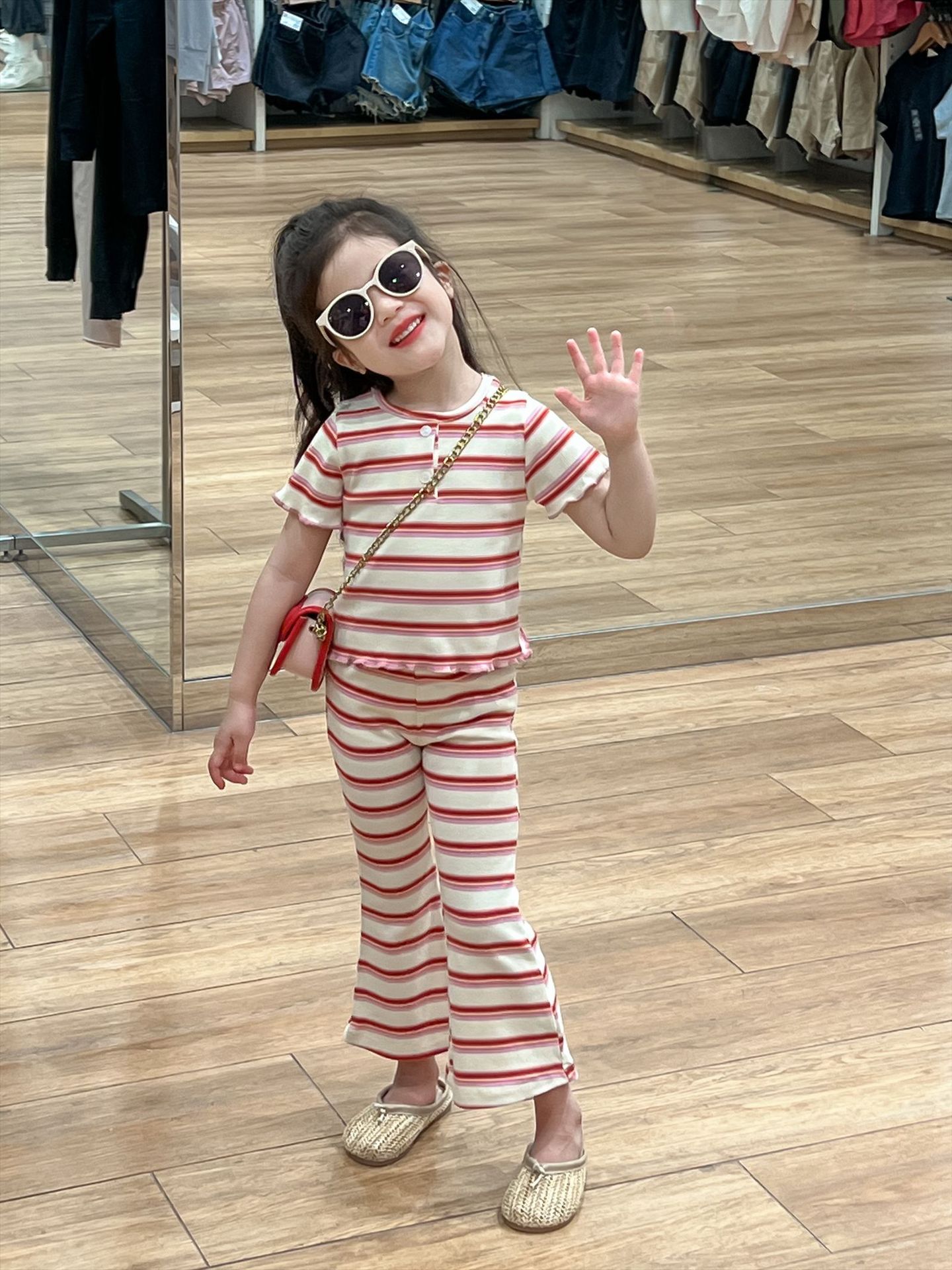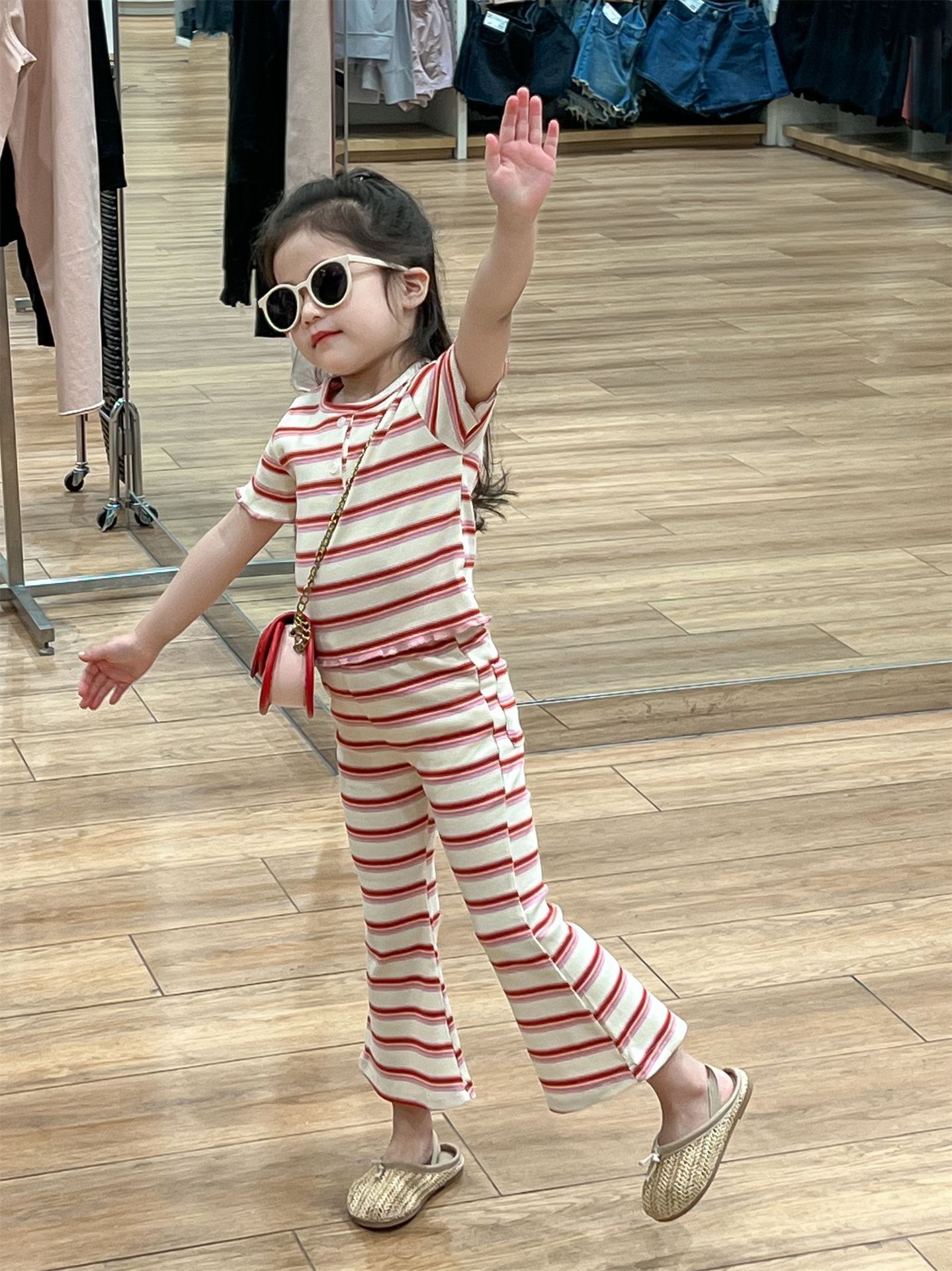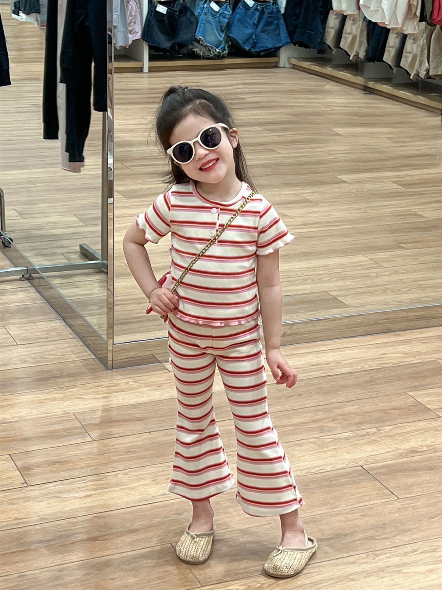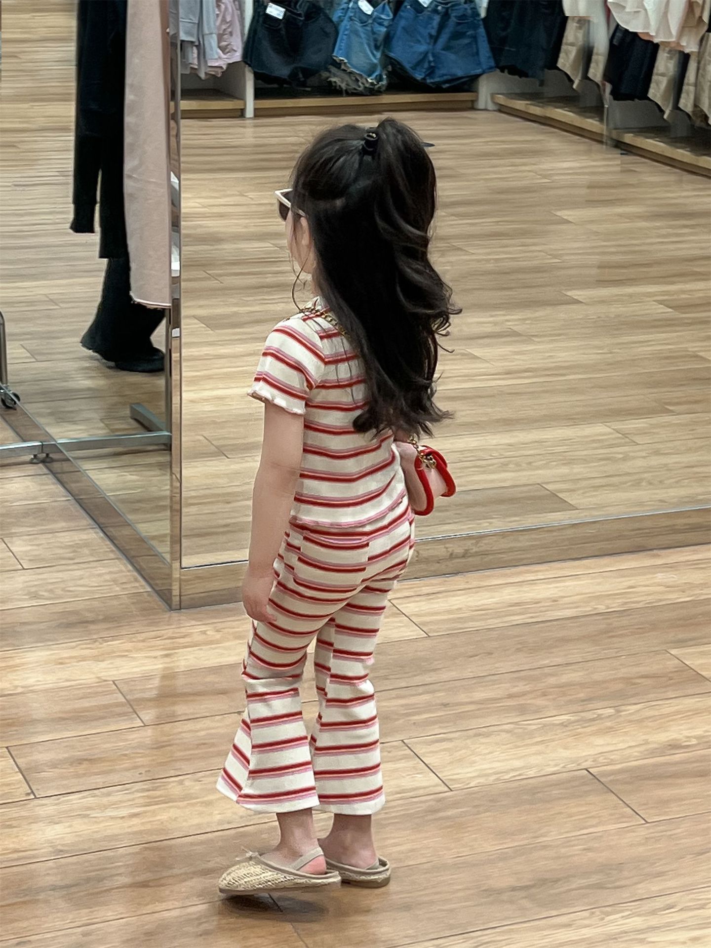 한국 아동복 소녀 2024 세트 여름 줄무늬 나무 귀 짧은 소매 티셔츠 플레어 바지 투피스 세트스토어 가기