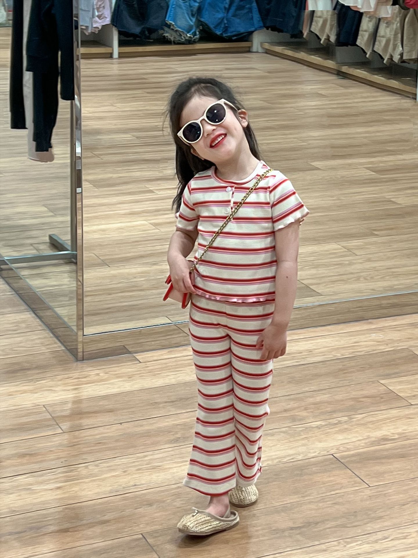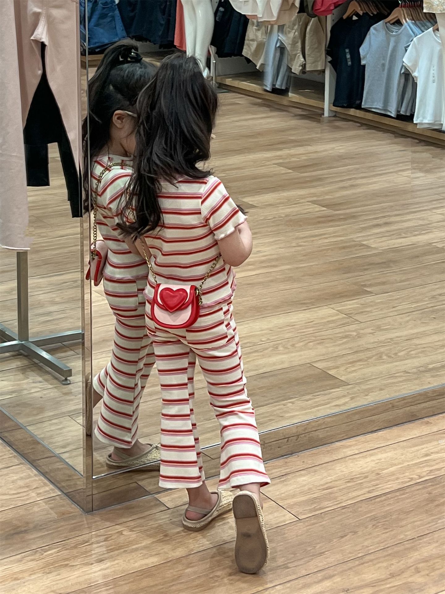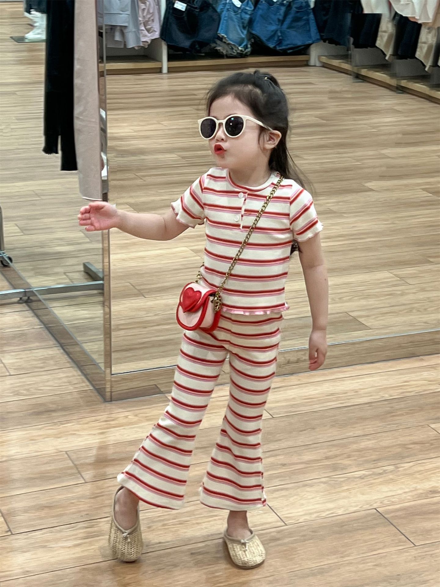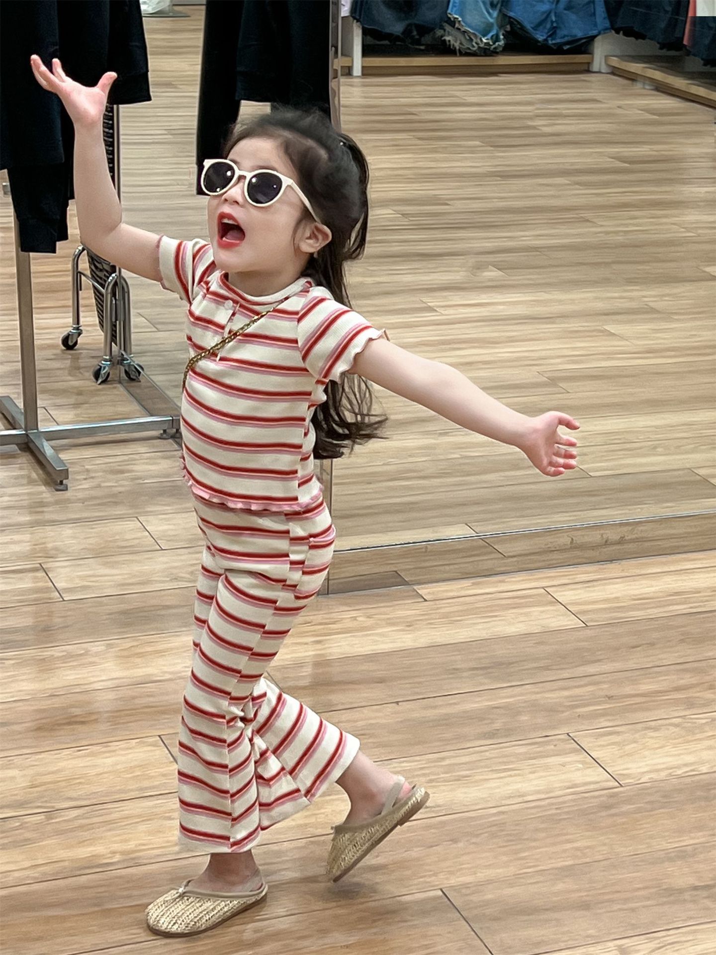 한국 아동복 소녀 2024 세트 여름 줄무늬 나무 귀 짧은 소매 티셔츠 플레어 바지 투피스 세트스토어 가기