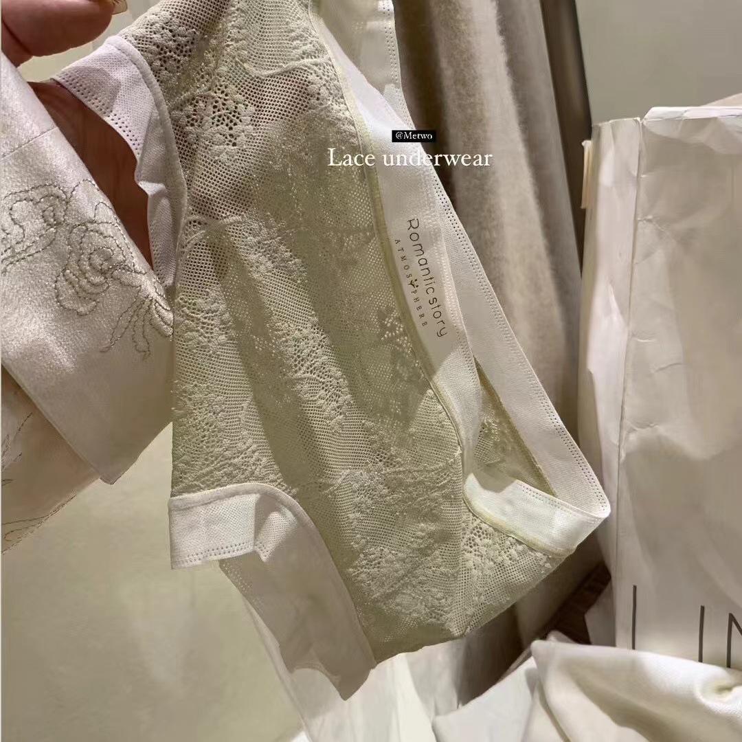 프랑스 자카드 레이스 속옷 여성용 미드 웨이스트 퓨어 반투명 자카드 메시 섹시 코튼 크로치 브리프