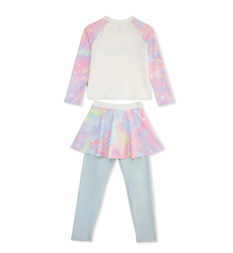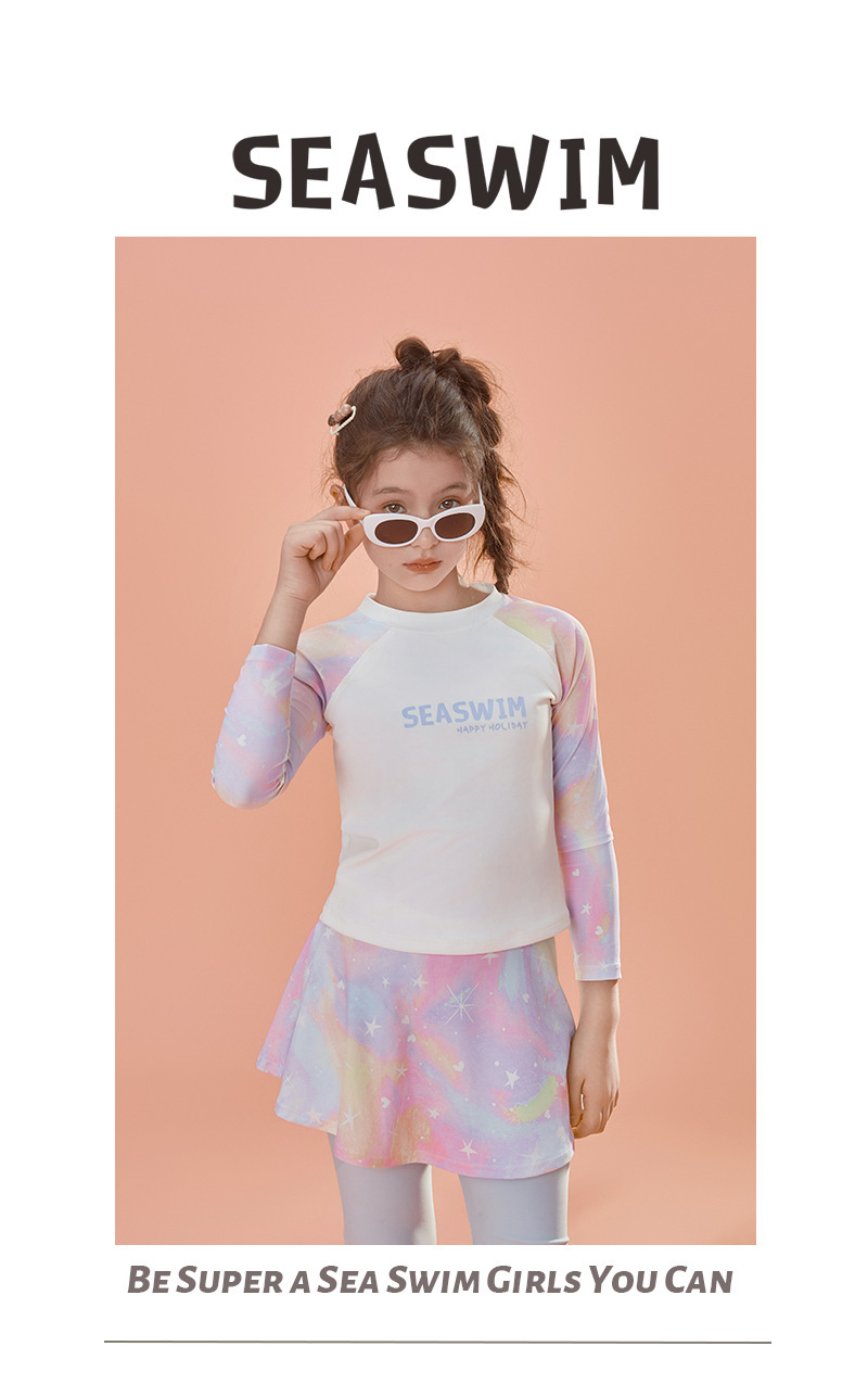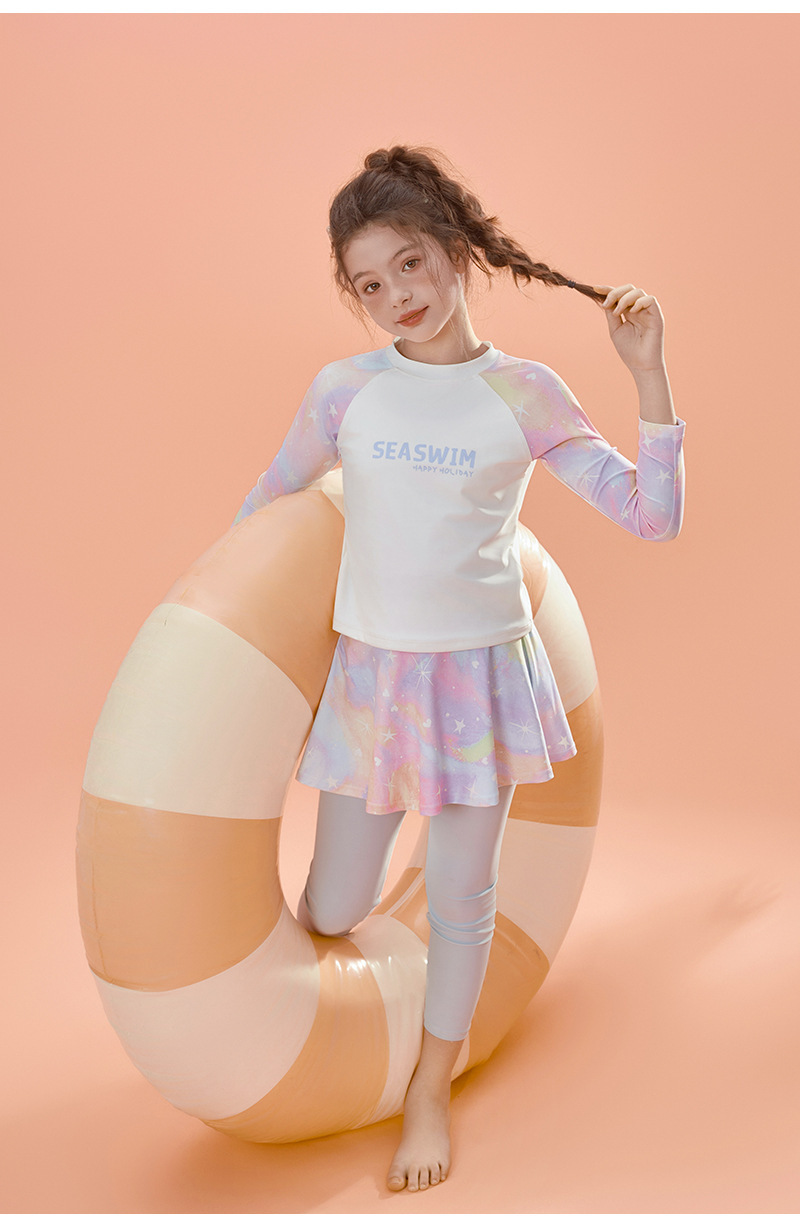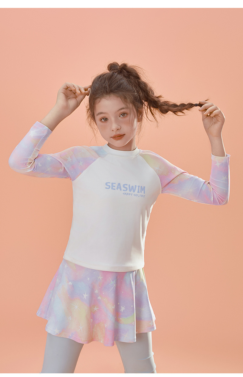 2024 여름 새로운 여자 수영복 레저 스포츠 긴 소매 분할 가짜 두 큰 어린이 자외선 차단제 빠른 건조 도매스토어 가기