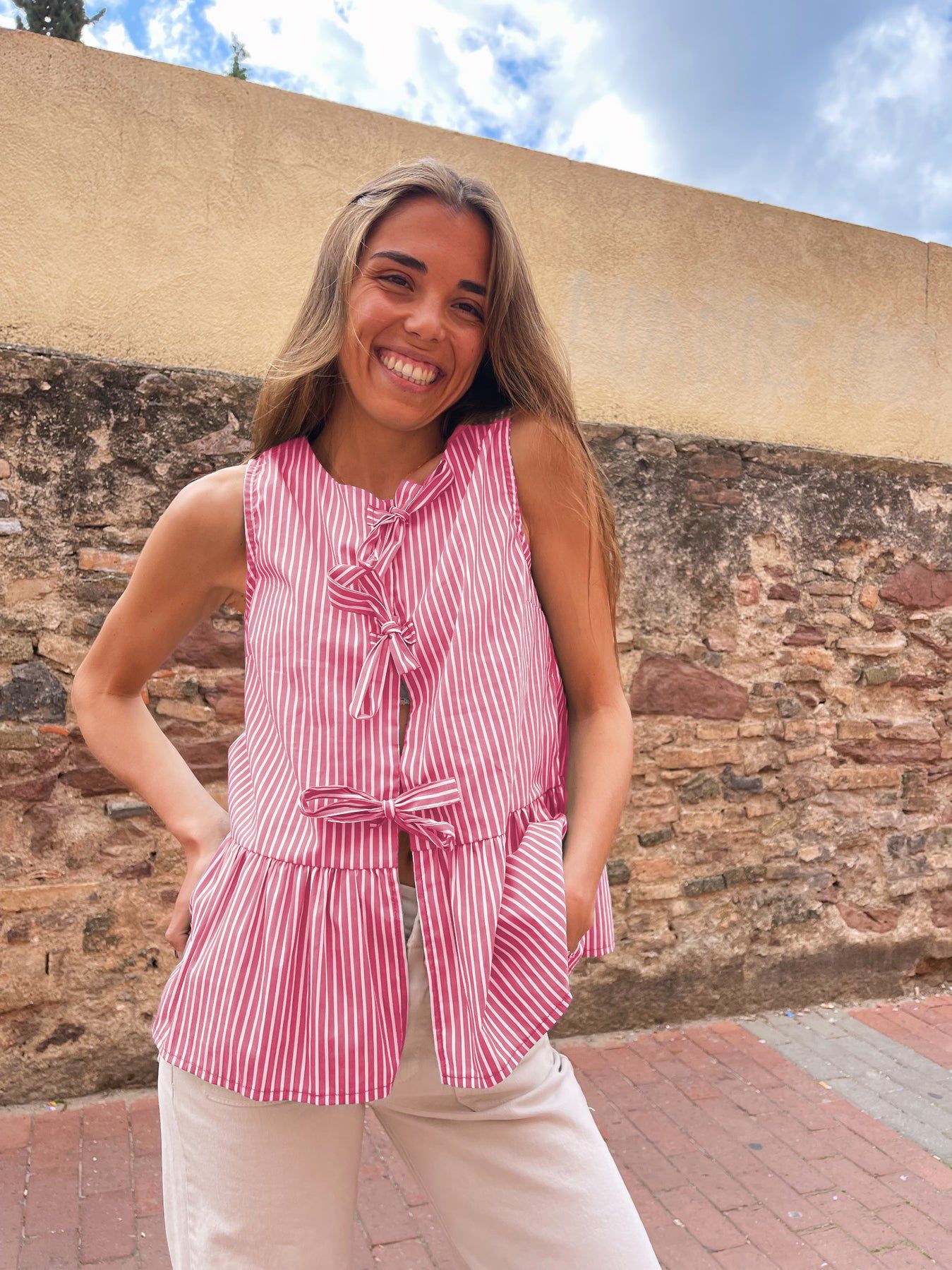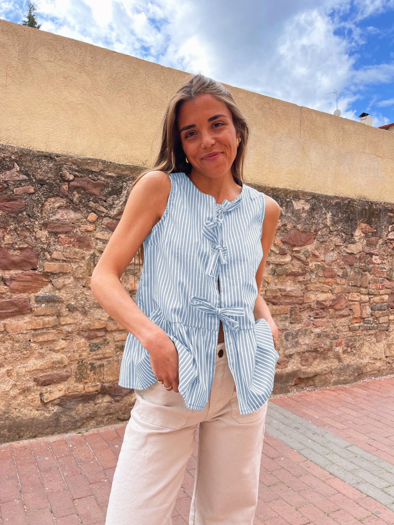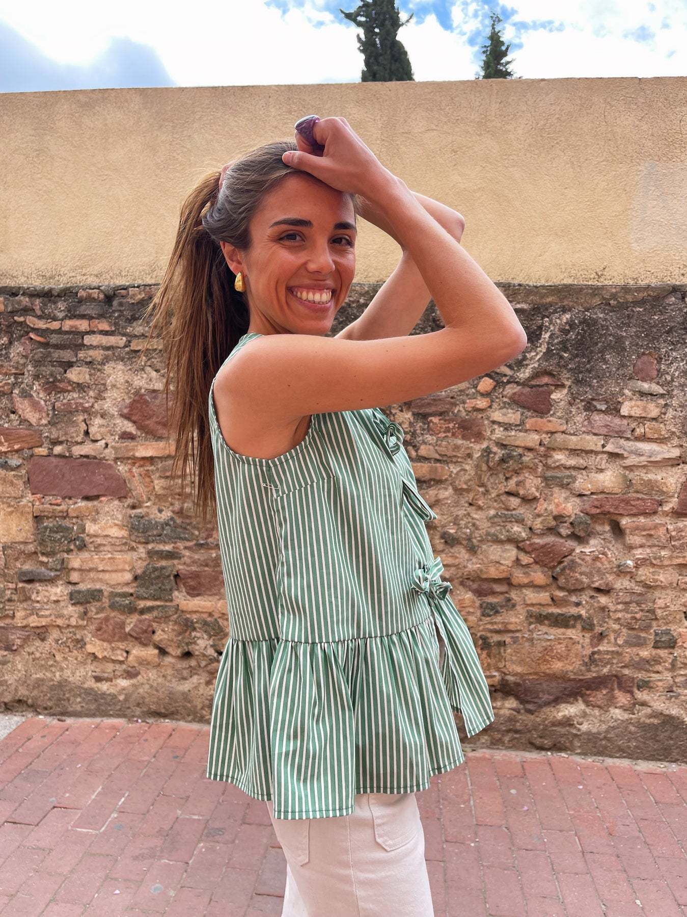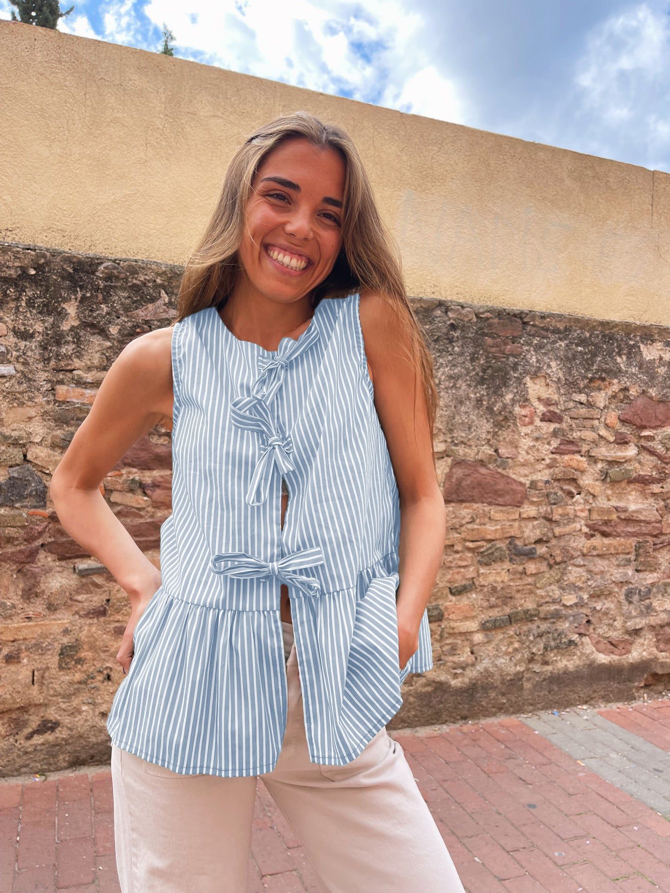 2024 새로운 아마존 유럽과 미국의 스트라이프 여성 톱 테더 민소매 인쇄 주름 봄과 여름 조끼 셔츠 여성 의류스토어 가기