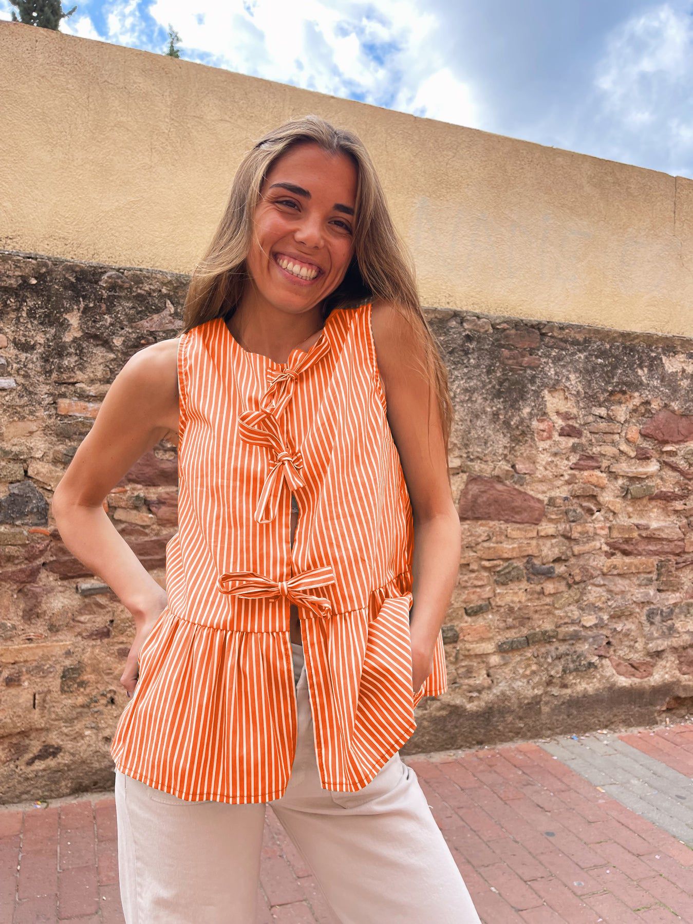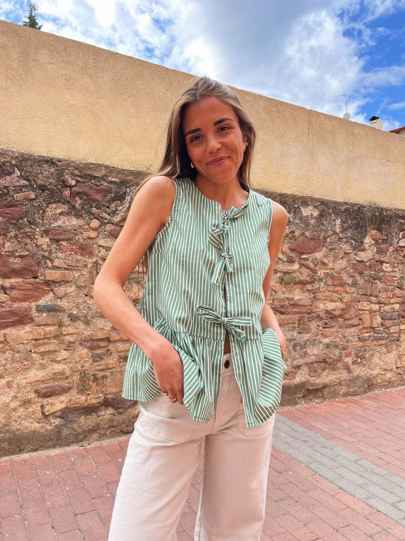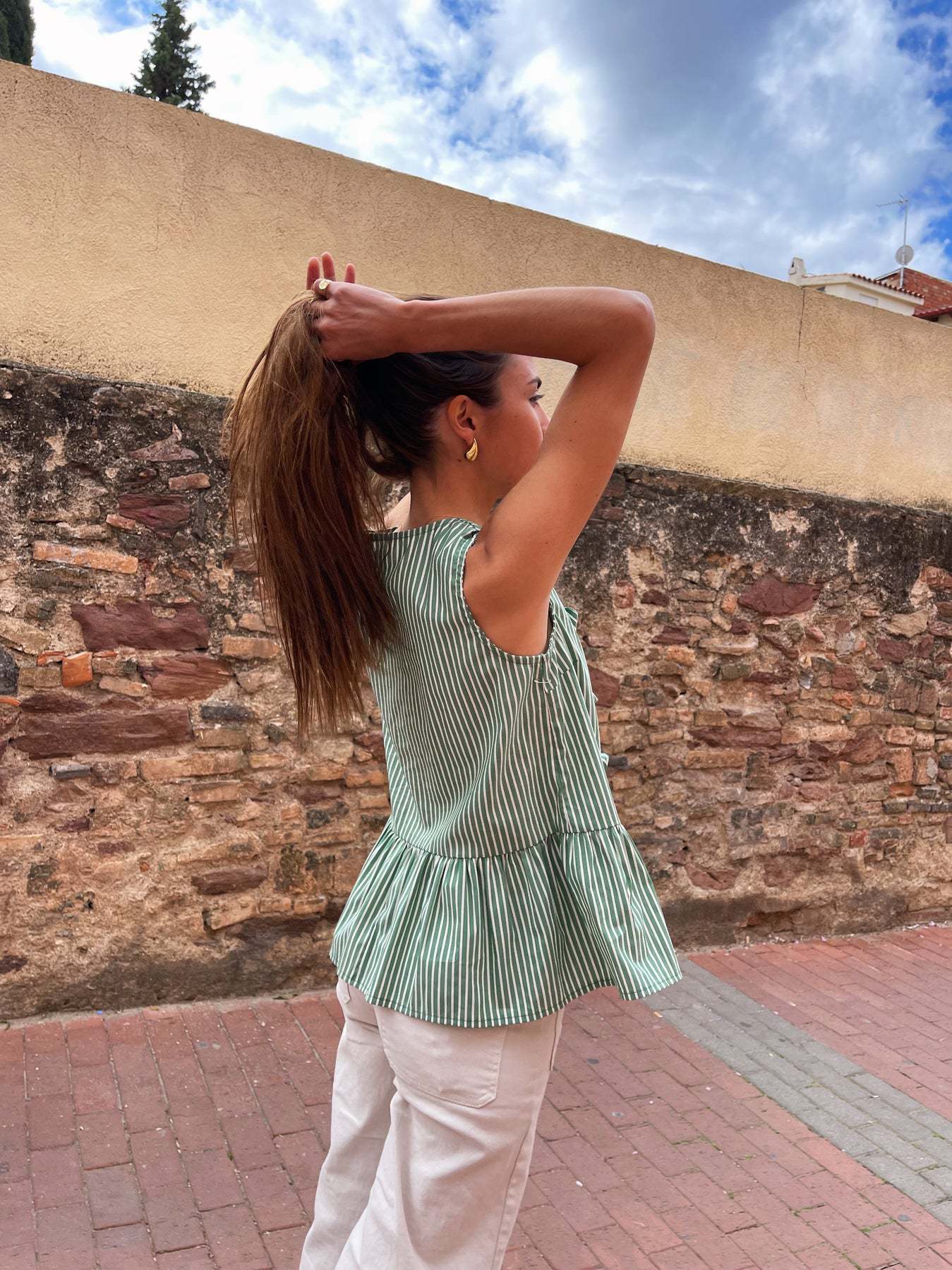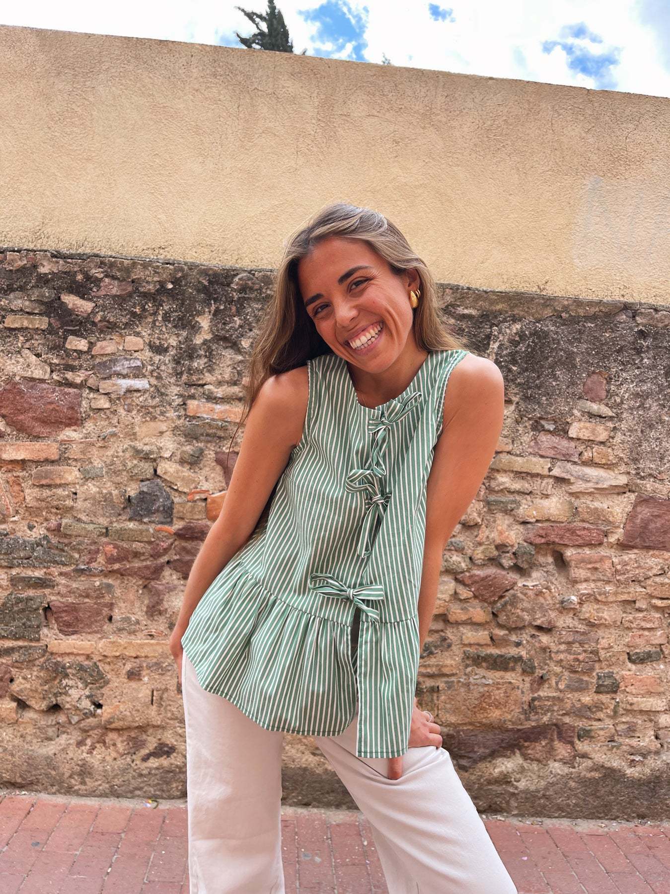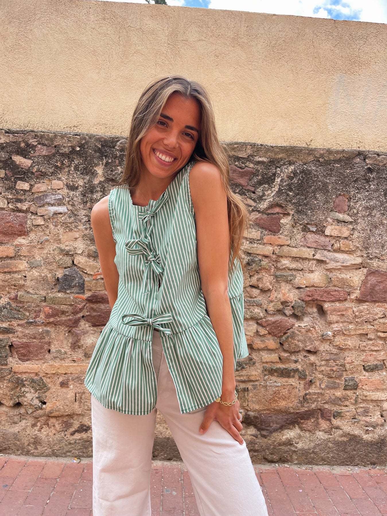 2024 새로운 아마존 유럽과 미국의 스트라이프 여성 톱 테더 민소매 인쇄 주름 봄과 여름 조끼 셔츠 여성 의류스토어 가기