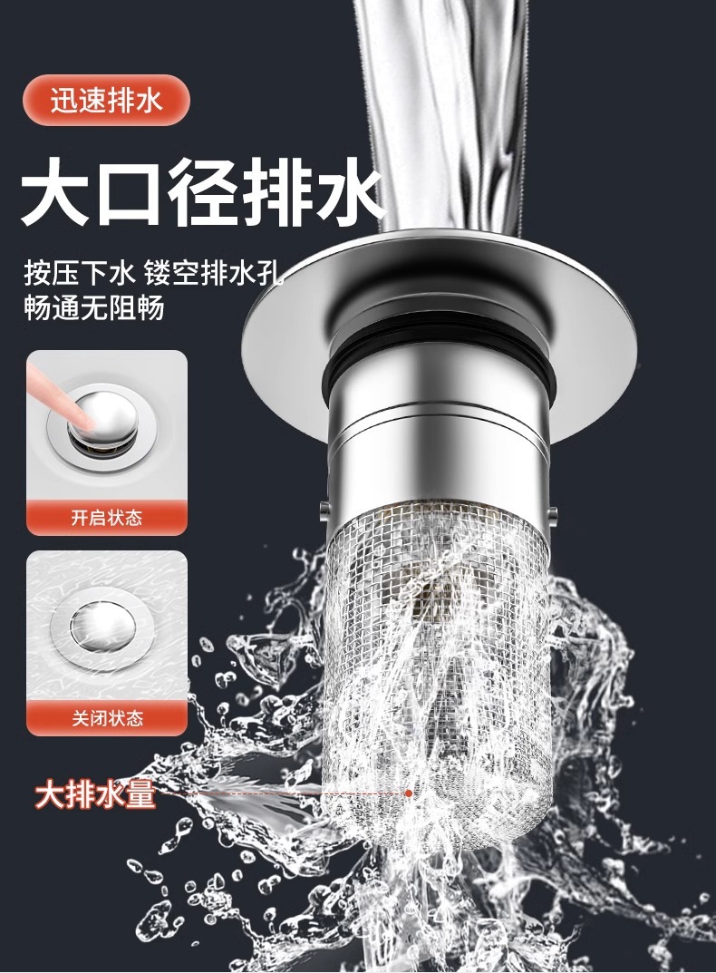 유니버설 세면대 싱크 누출 플러그 프레스 타입 스테인레스 스틸 필터 바운스 코어 반사 방지 냄새 물 유물