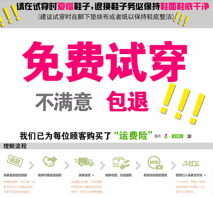 【关于退换】如买家个人原因(不喜欢、不合适、尺码拍错)往返运费均由买家承担!退换货要求具备商品收到时完整的外包装、配件、吊牌等;购买物品被洗