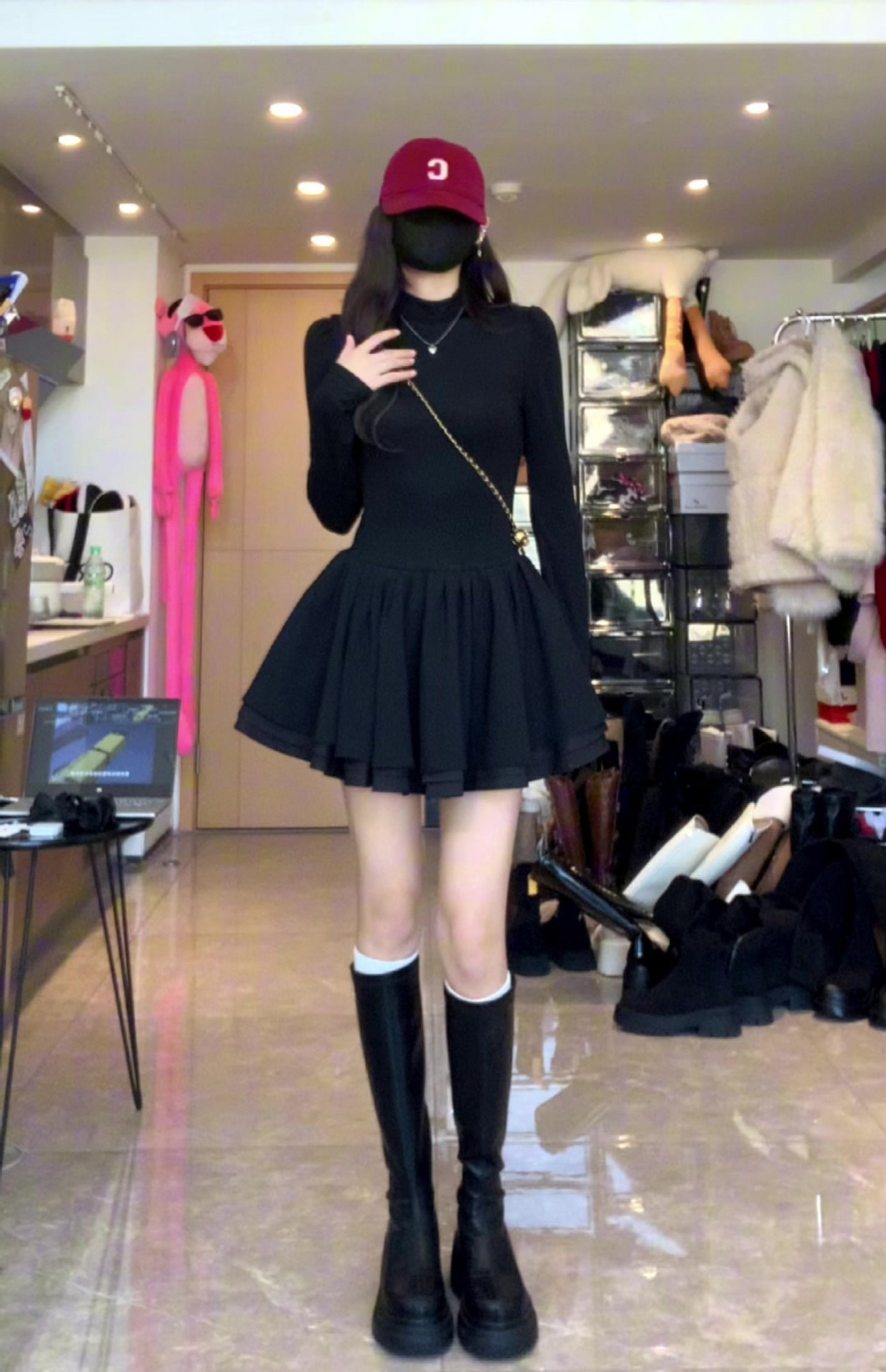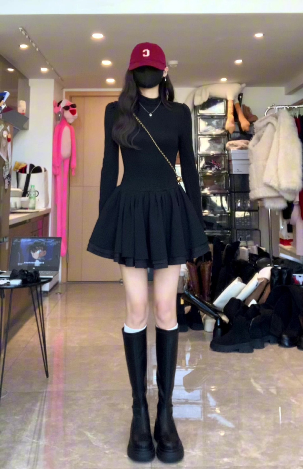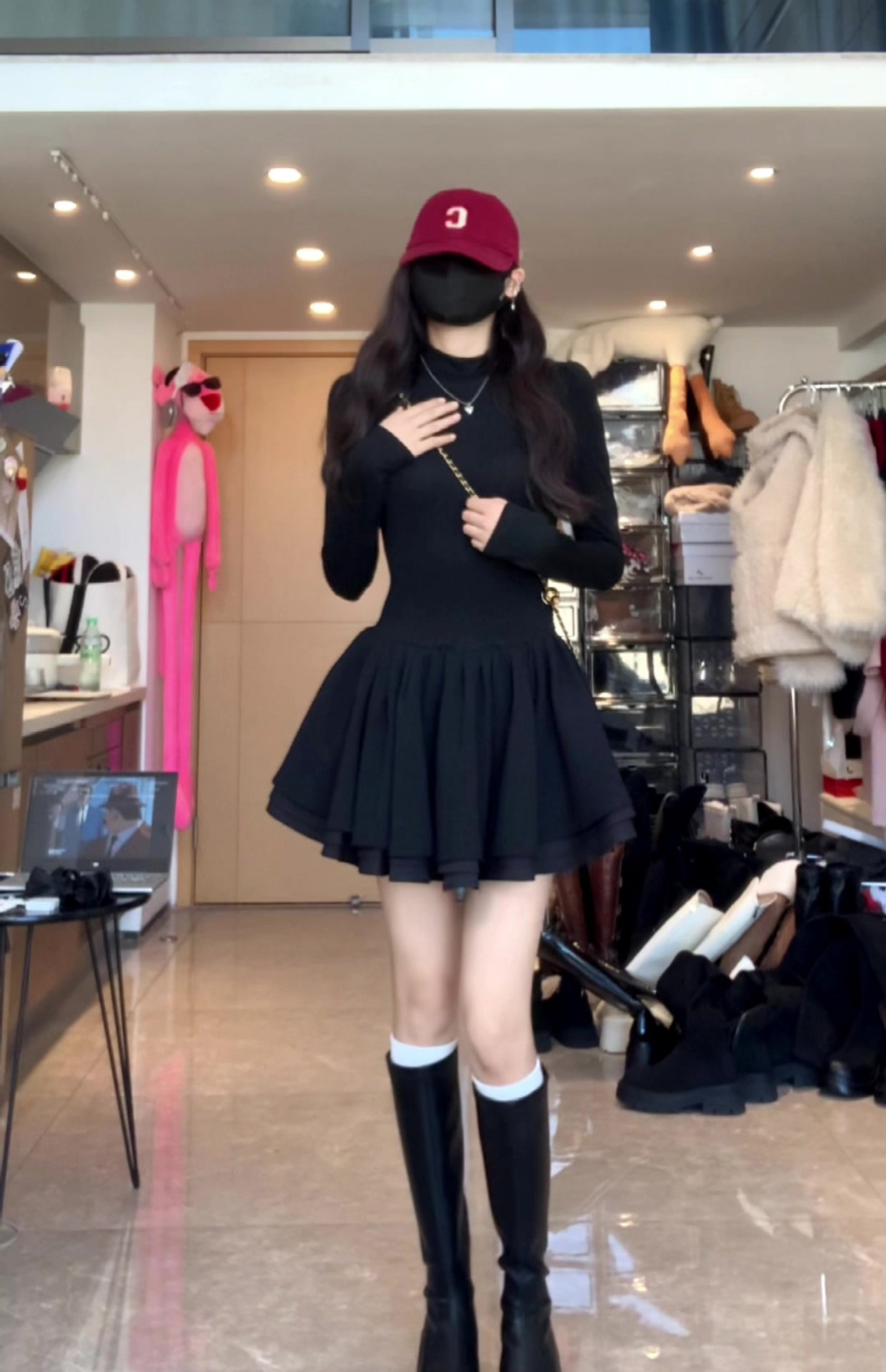 검은 반 높이 칼라 긴 소매 푹신한 짧은 치마 여성의 가을과 겨울 작은 그림을위한 우아한 허리 공주 원피스스토어 가기