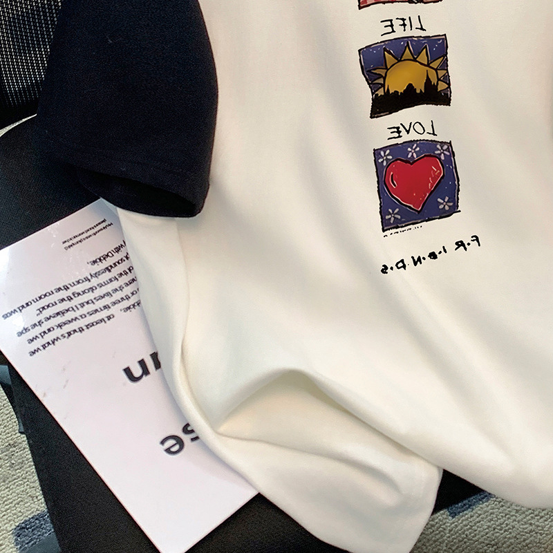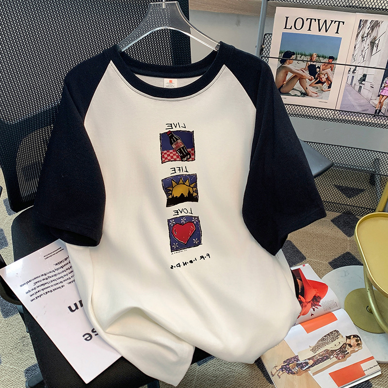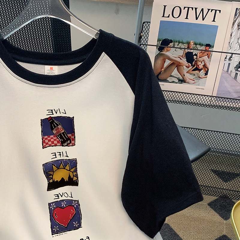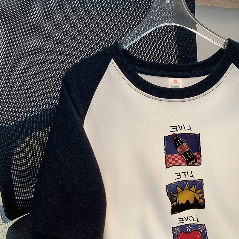 2024 년 여름 뉴 숄더 콘트라스트 컬러 코튼 반팔 티셔츠 여성 Ins 패셔너블 올 매치 에이지 감소 슬림 핏 숄더 탑스토어 가기