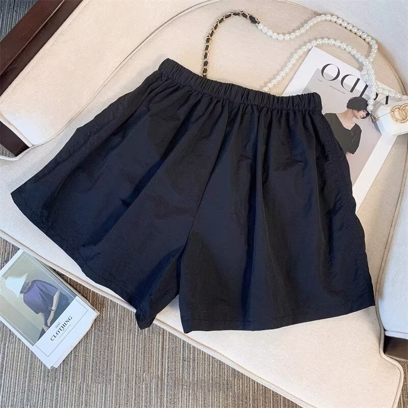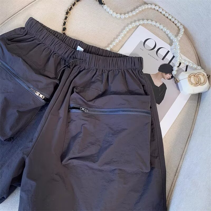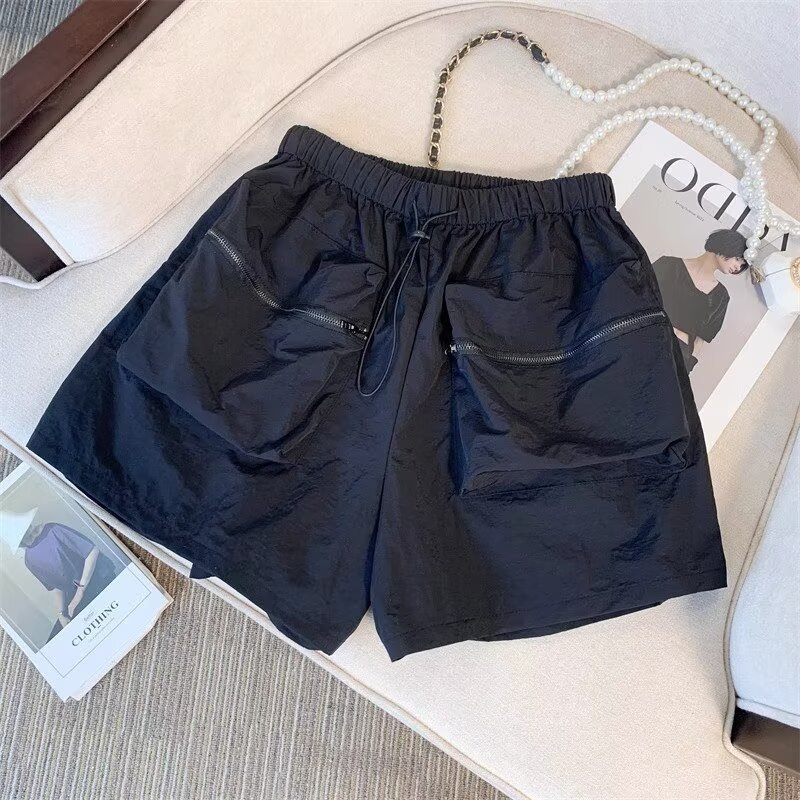 여름 여성용 블랙 카고 반바지, 얇고 작은 사이즈, 루즈한 A라인 속건 스포츠 팬츠, 아메리칸 와이드 팬츠