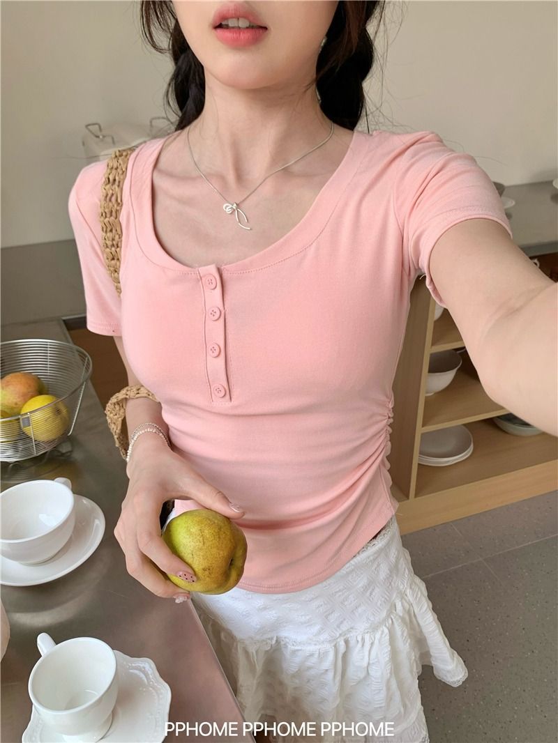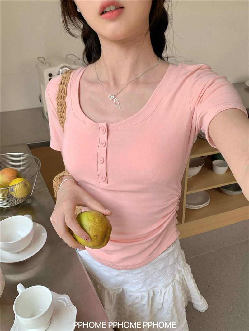 순수한 욕망 스타일 U 넥 반팔 어깨 티셔츠 소녀의 여름 불규칙한 탄성 슬리밍 짧은 올 매치 그린 탑스토어 가기