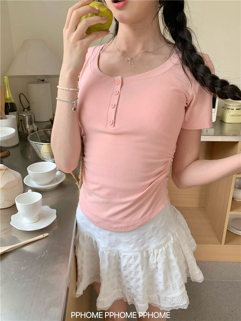 순수한 욕망 스타일 U 넥 반팔 어깨 티셔츠 소녀의 여름 불규칙한 탄성 슬리밍 짧은 올 매치 그린 탑