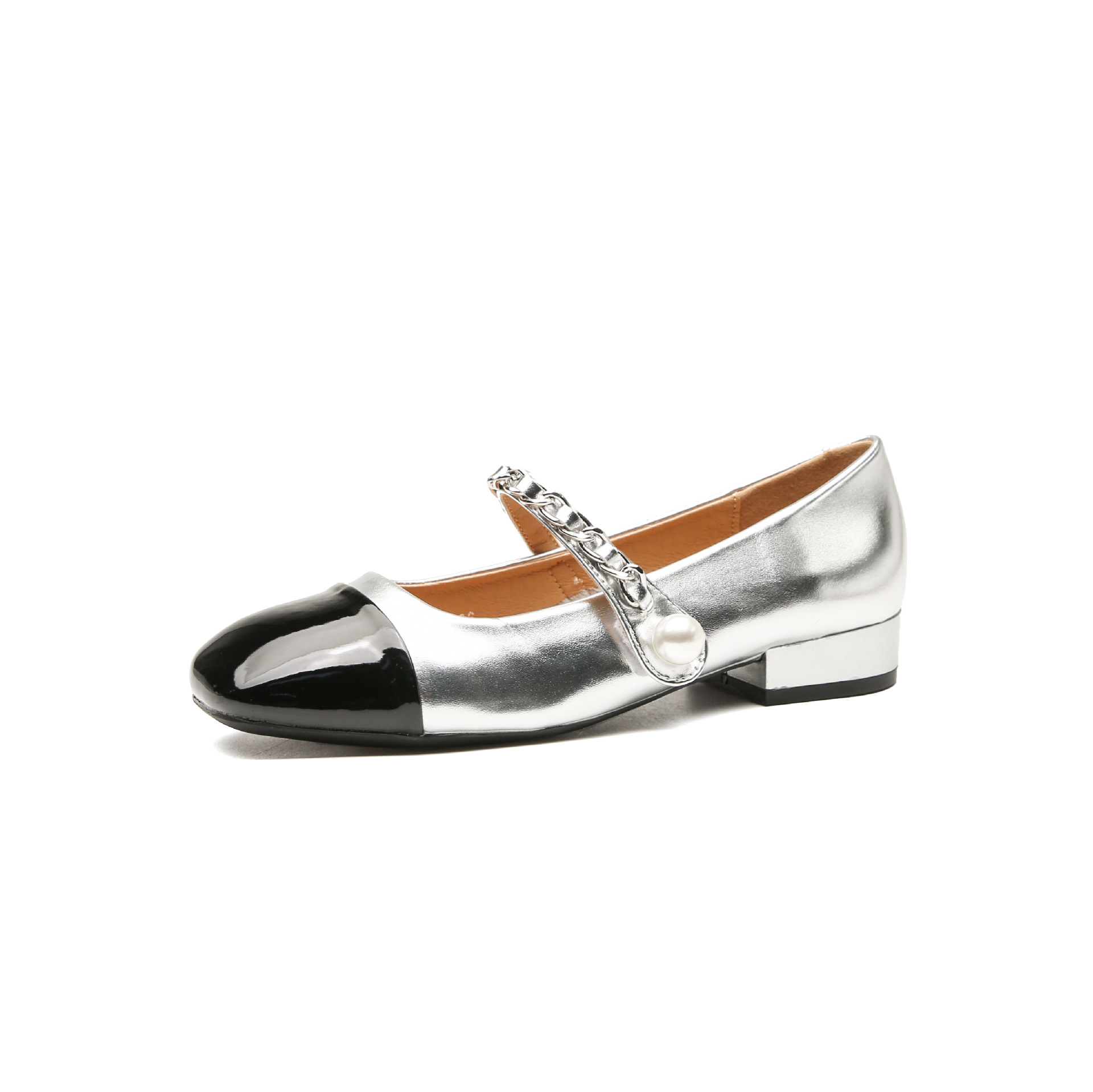 2024 새로운 밝은 얼굴 사각형 발가락 작은 가죽 신발 여성 실버 두꺼운 뒤꿈치 신발 프랑스 색 매칭 진주 메리 제인 신발