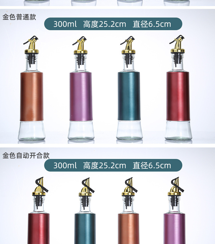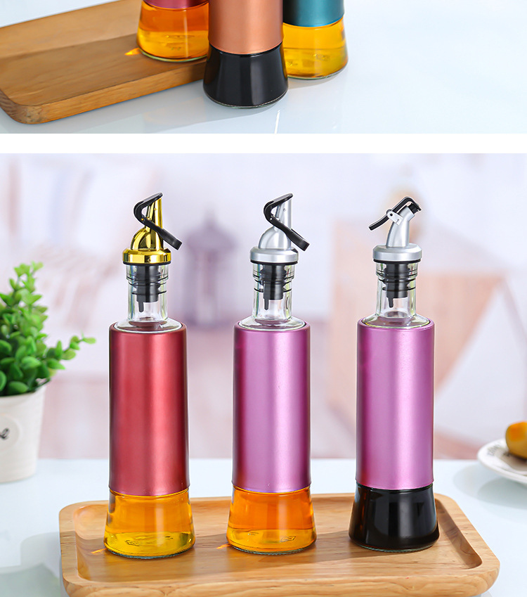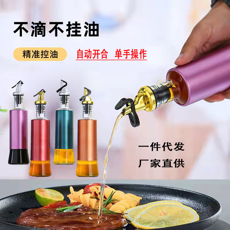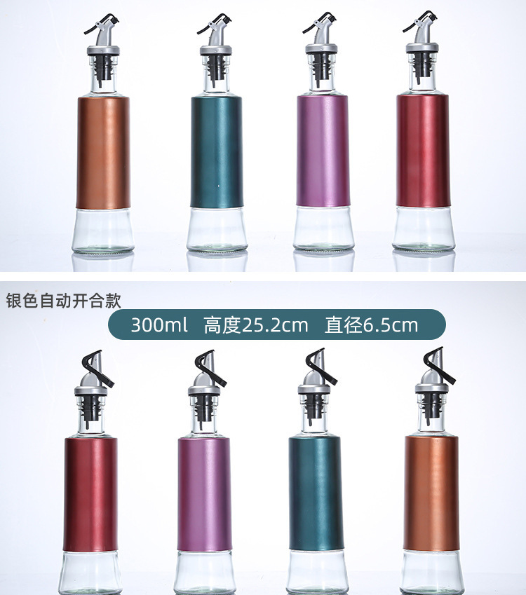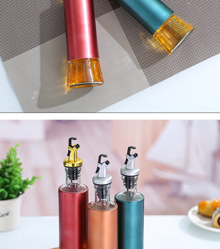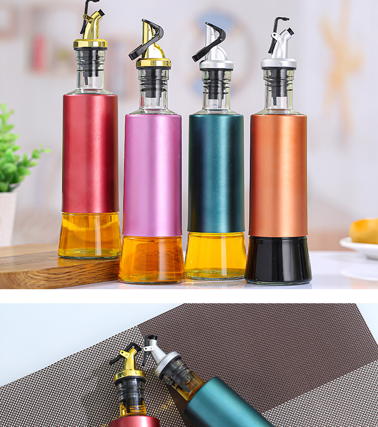 새로운 도매 가죽 봉인 누출 방지 오일 주전자 병 컬러 유리 조미료 병 프레스 스위치 오일 및 식초 조미료 병스토어 가기