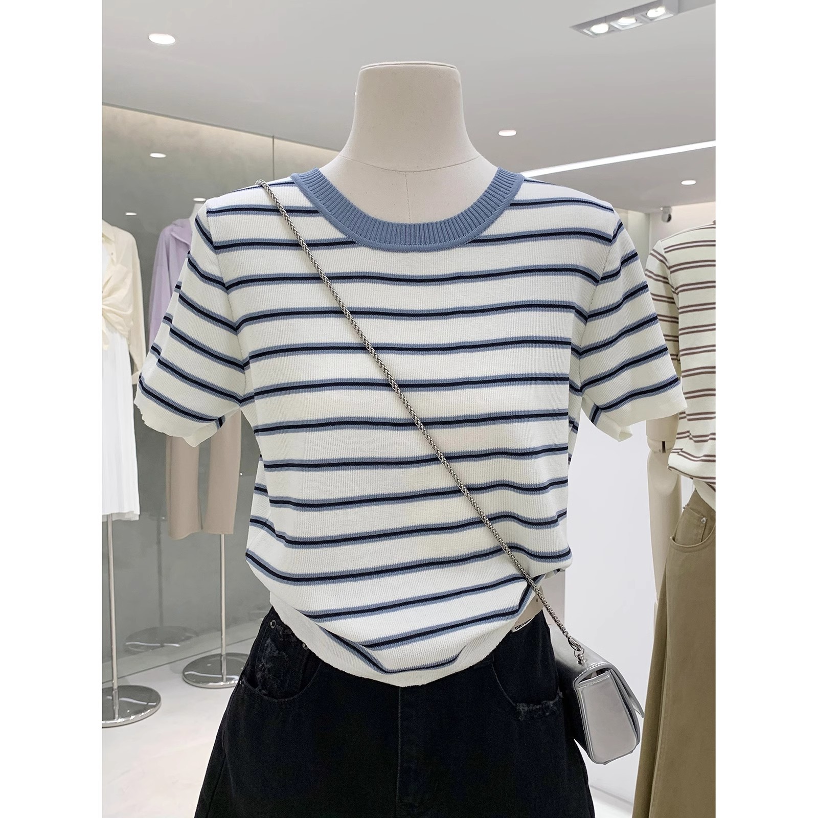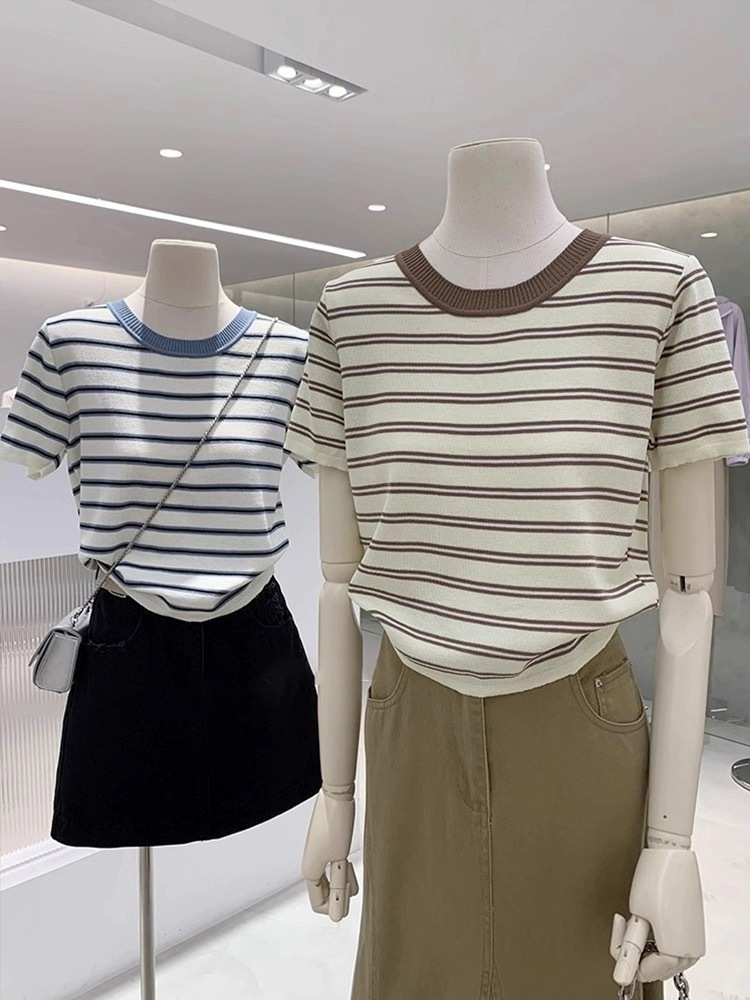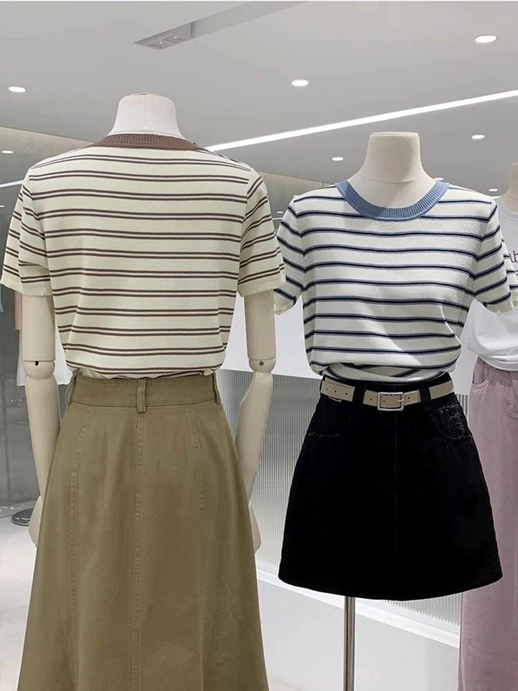 한국식 신선한 콘트라스트 스트라이프 반팔 스웨터 여자 여름 캐주얼 올매치 라운드 넥 탑 여자 티셔츠스토어 가기