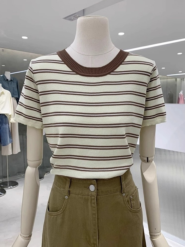 한국식 신선한 콘트라스트 스트라이프 반팔 스웨터 여자 여름 캐주얼 올매치 라운드 넥 탑 여자 티셔츠