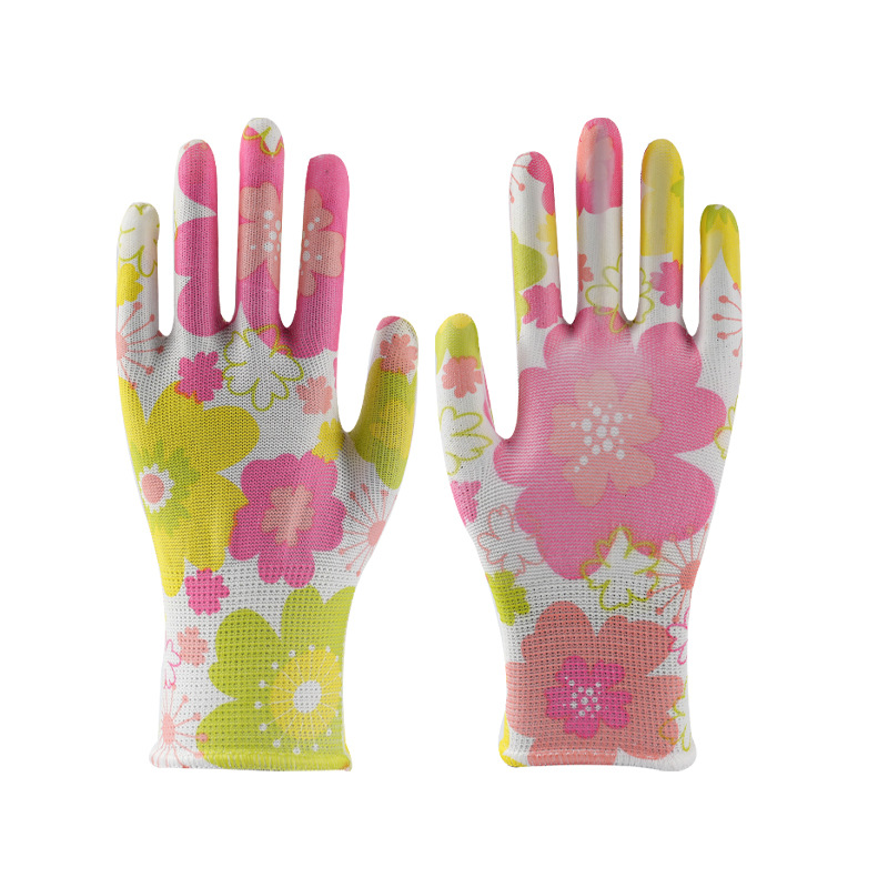 인쇄 된 PU 팜 코팅 작업 장갑 미끄럼 방지 여성용 손 보호 장갑 통기성 편안한 작업 장갑스토어 가기