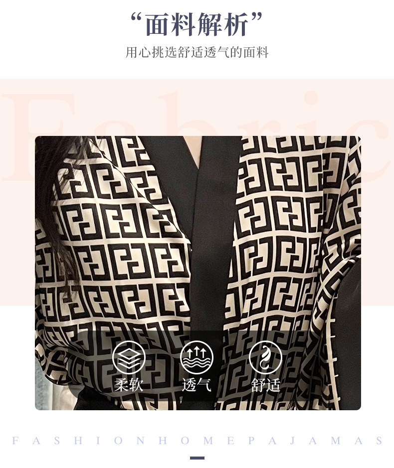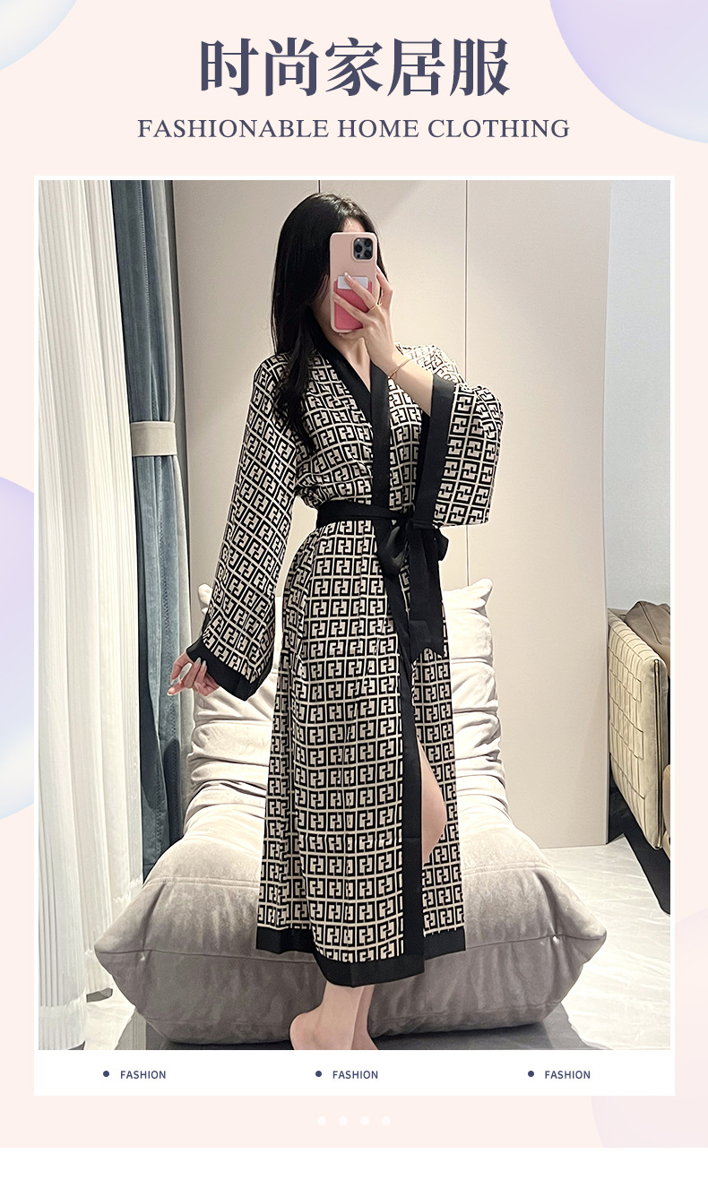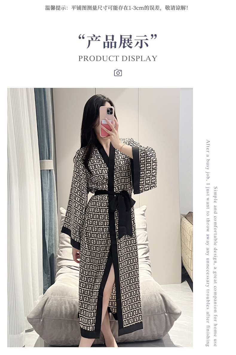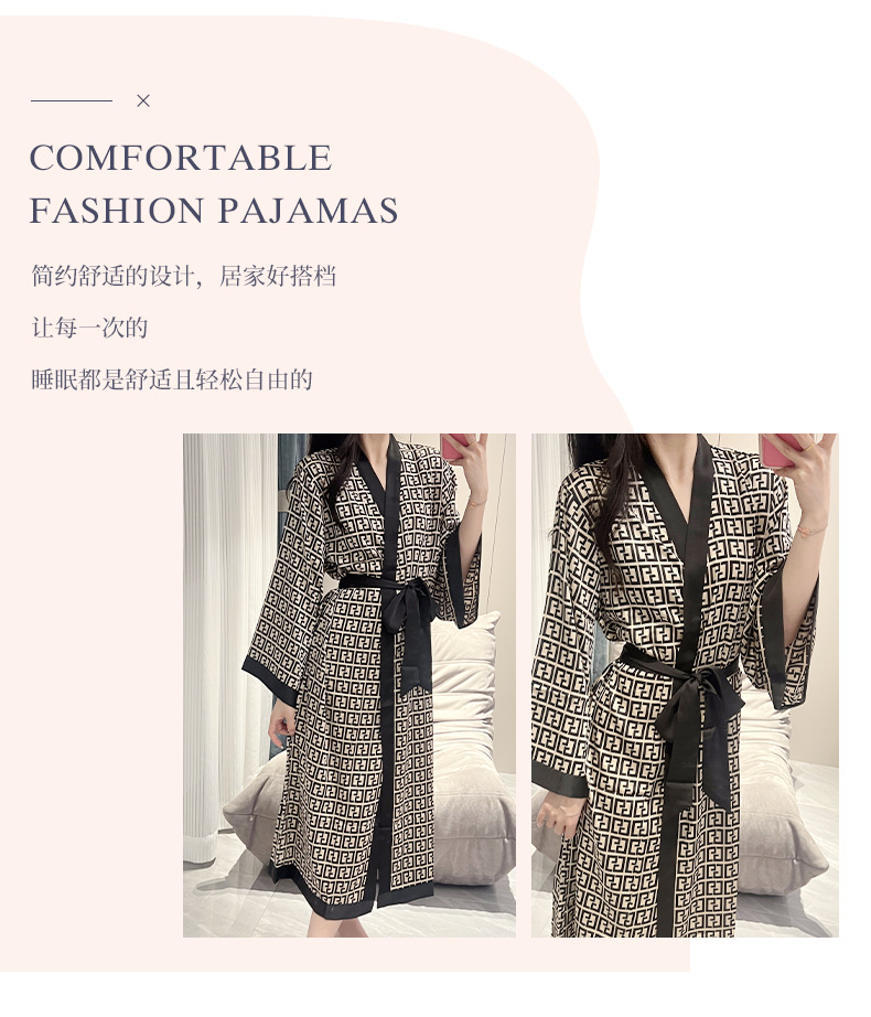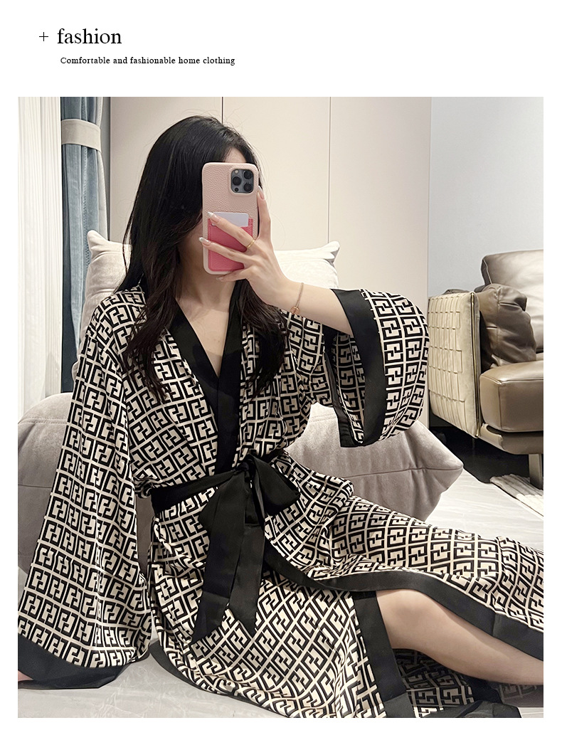 나이트가운 여성의 봄과 여름 새로운 아이스 실크 긴팔 느슨한 레이스 업 긴 잠옷 하이 엔드 인쇄 홈 의류스토어 가기