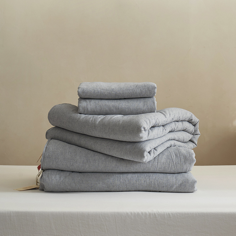 靛蓝染纱后织布,有着牛仔的蓝中带灰的隽永色调,