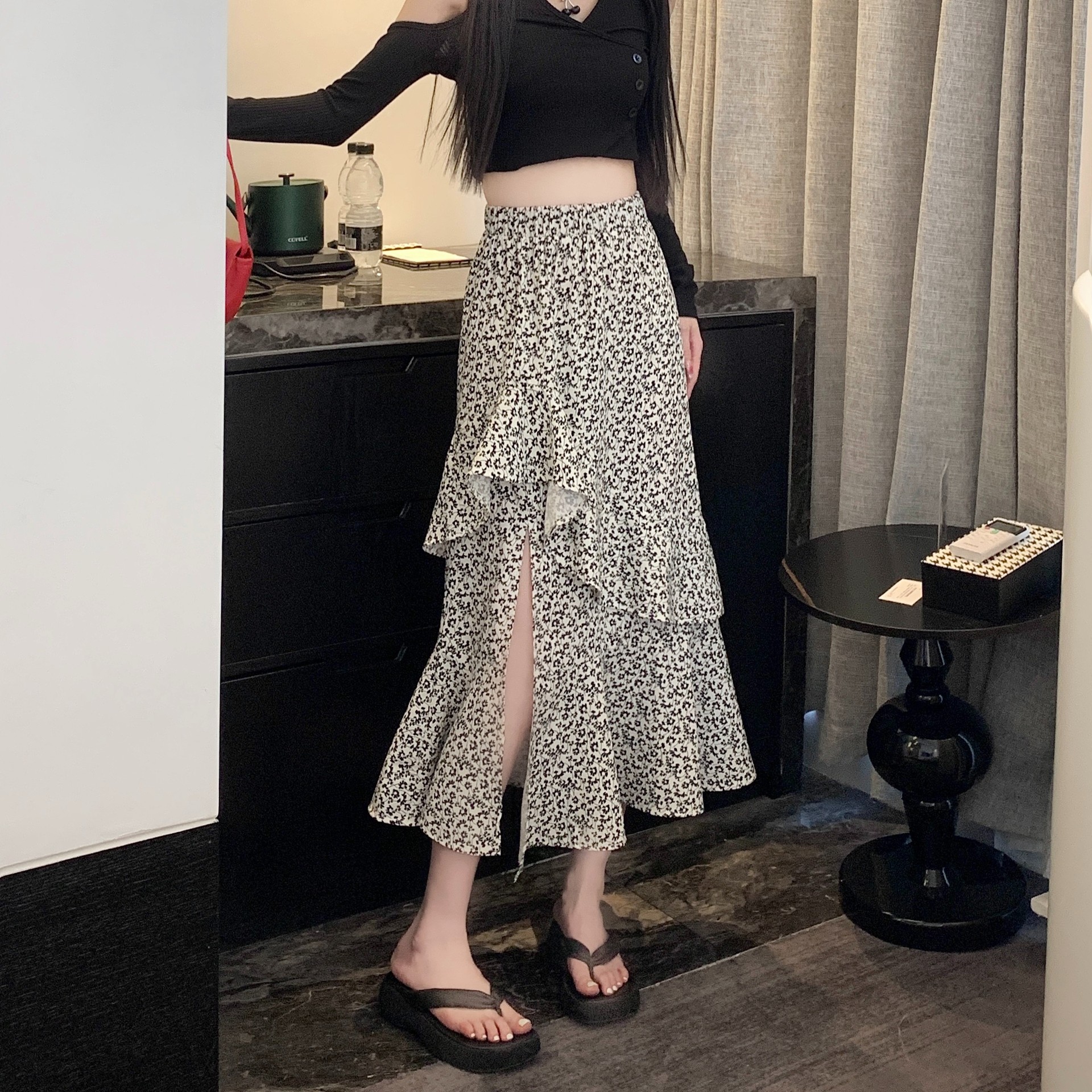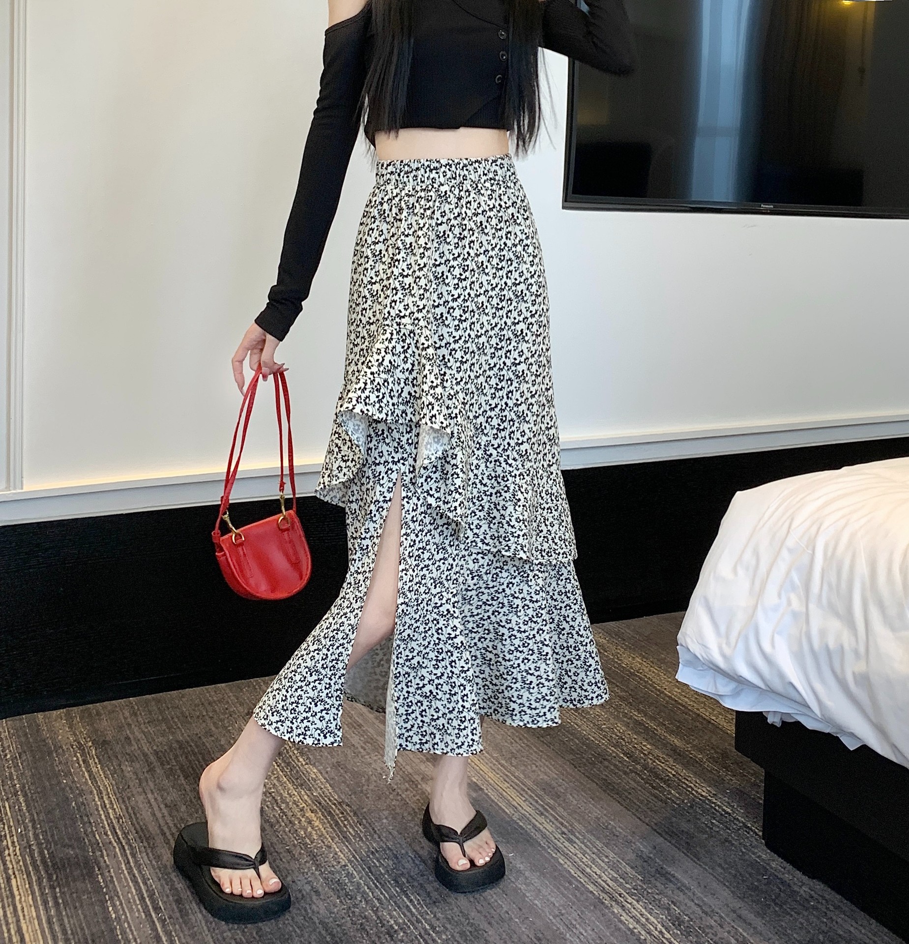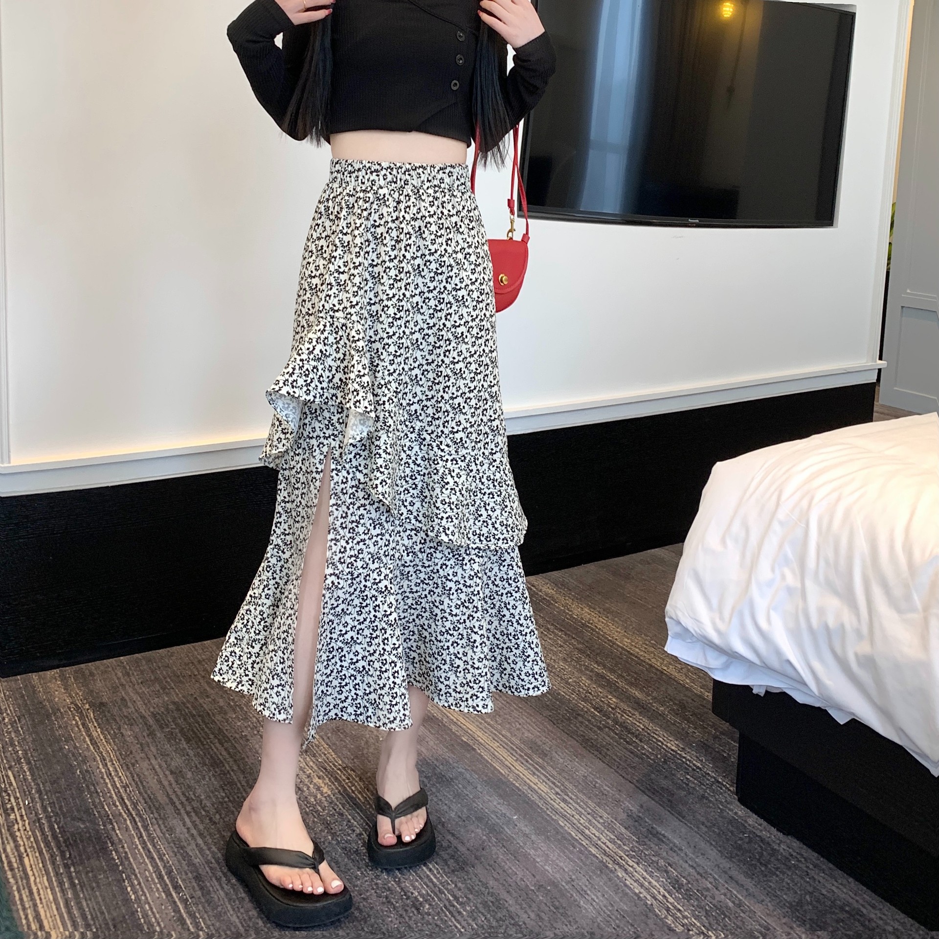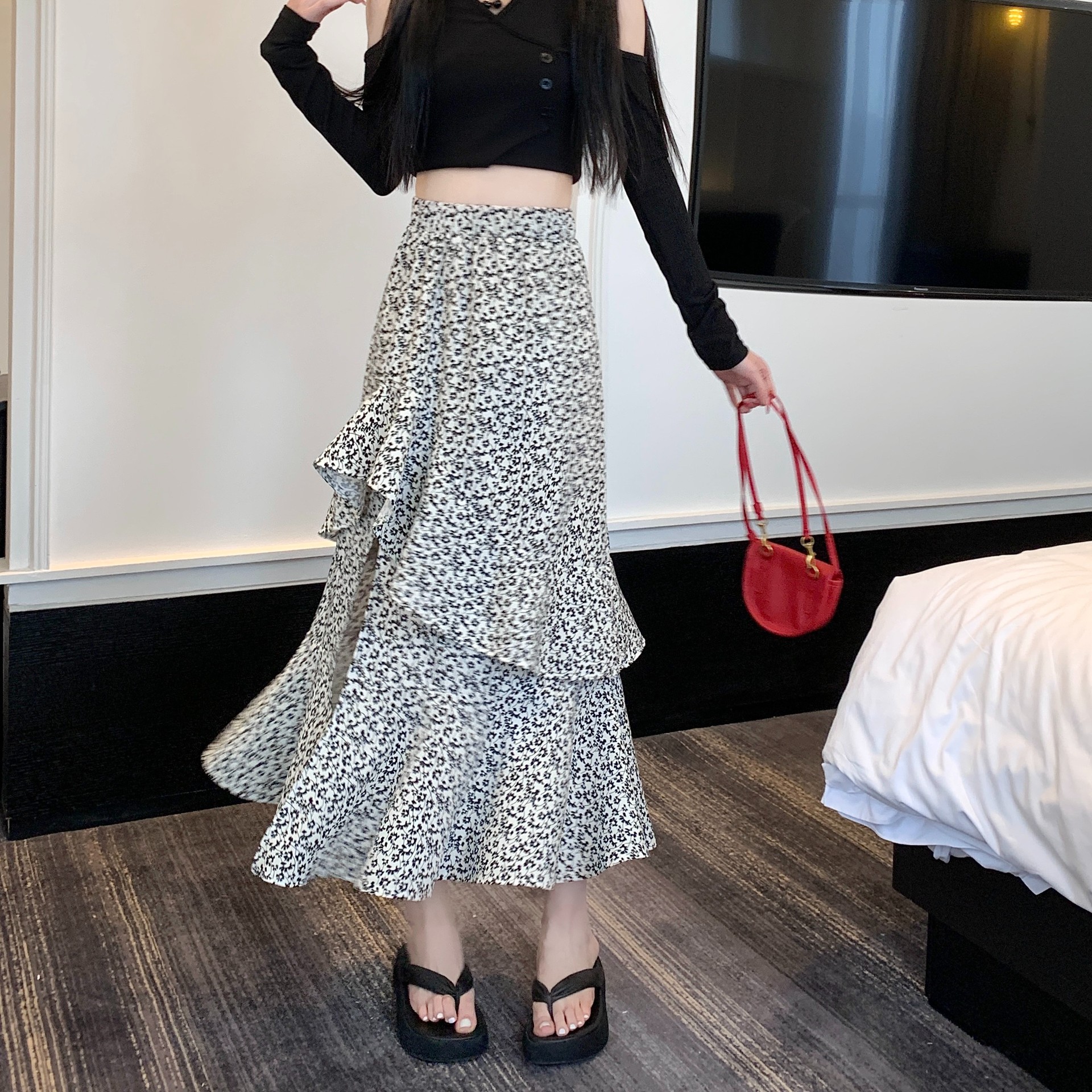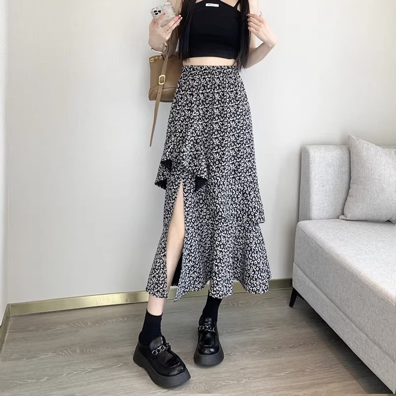 2024 봄/여름 높은 허리 슬리밍 중간 길이 불규칙한 러플 꽃 스플릿 하프 A 라인 피쉬 테일 스커트
