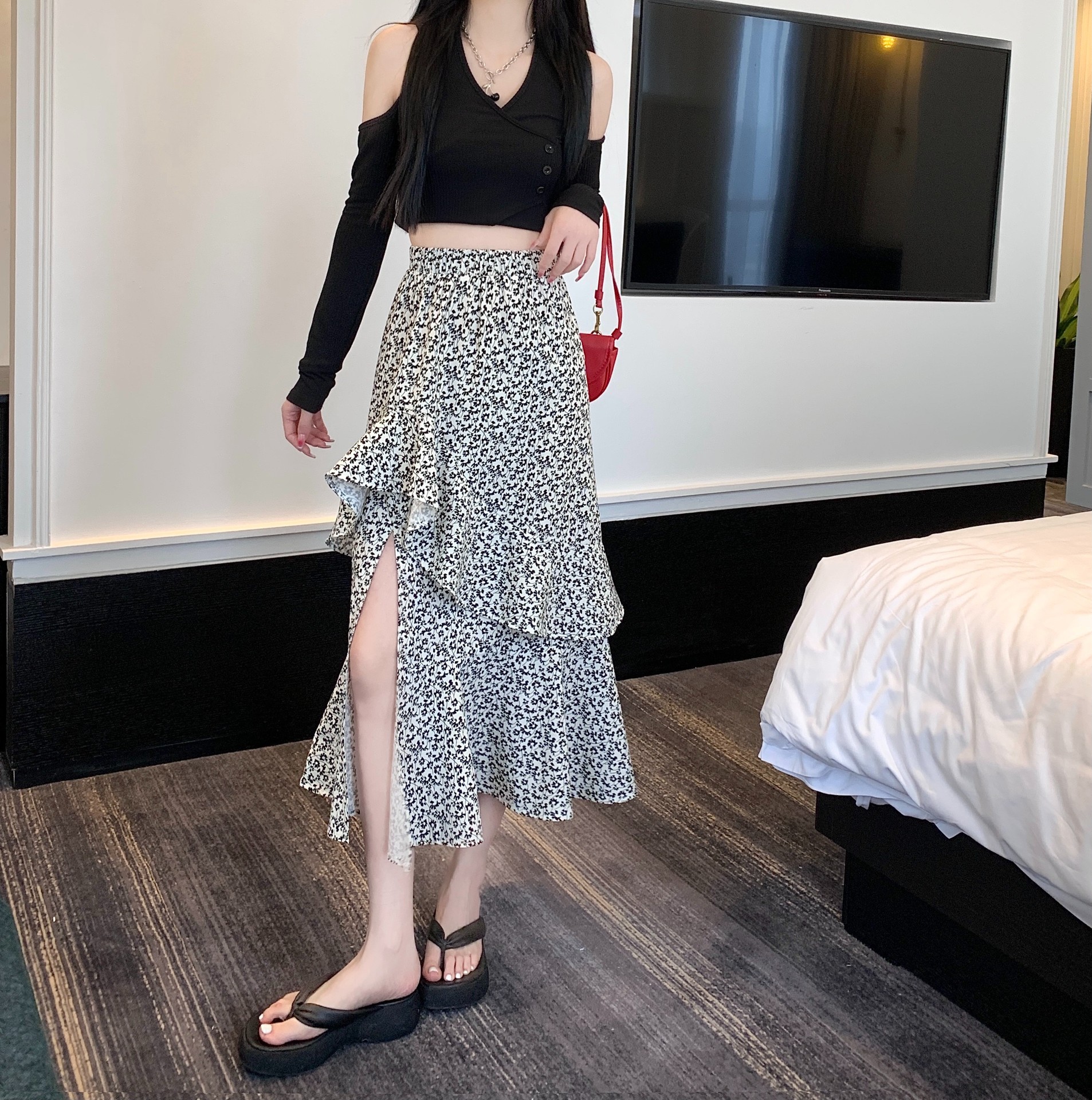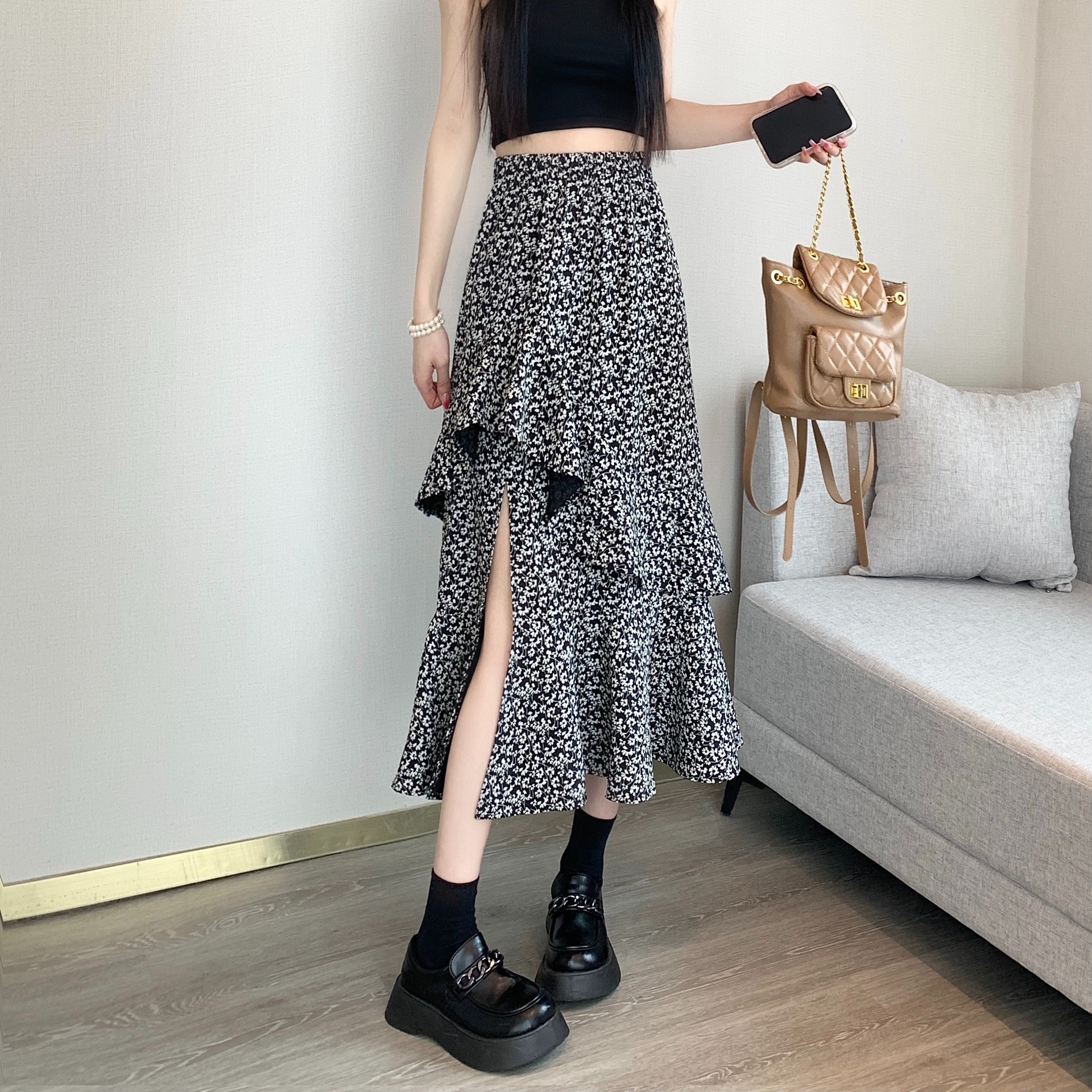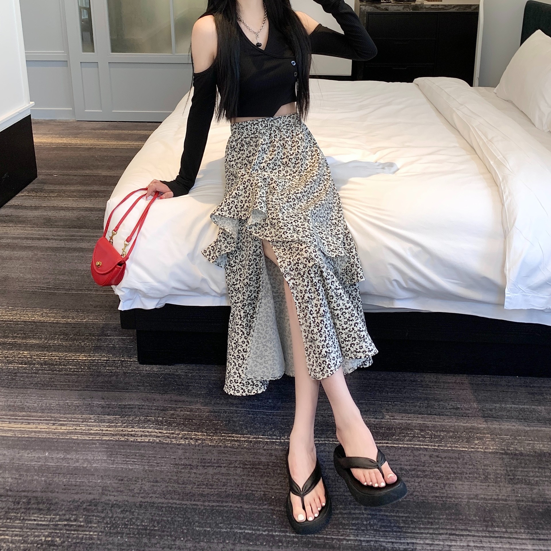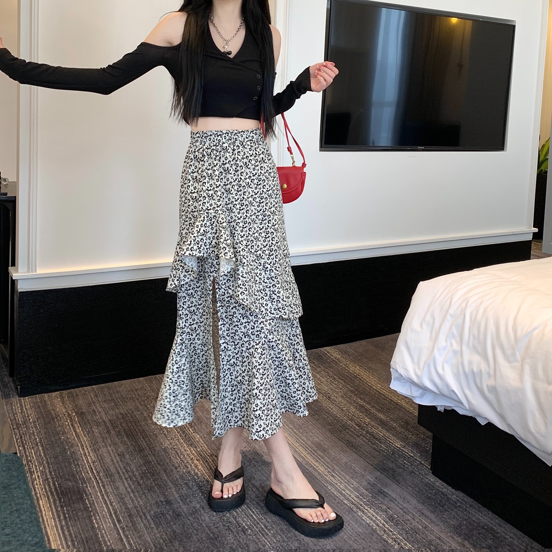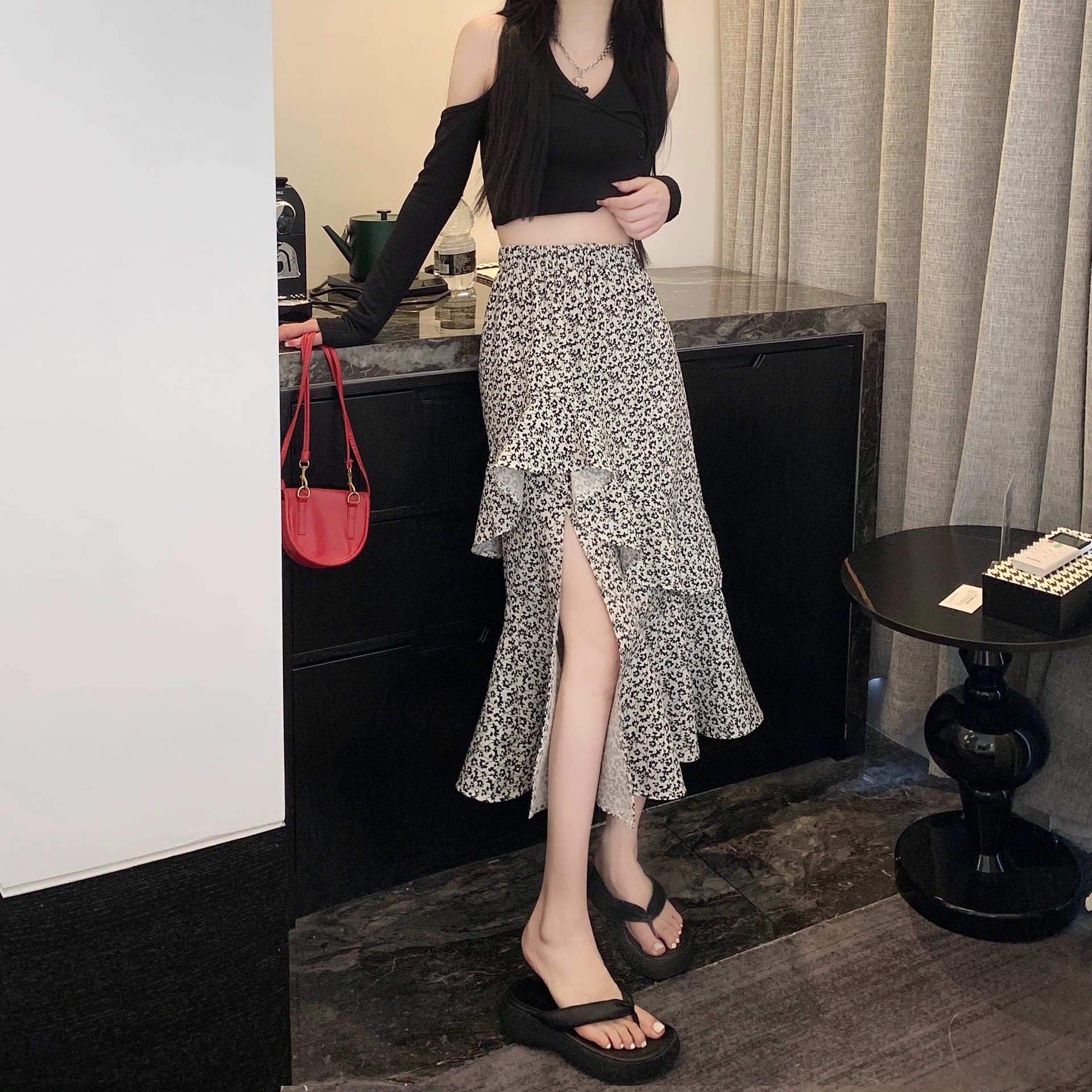 2024 봄/여름 높은 허리 슬리밍 중간 길이 불규칙한 러플 꽃 스플릿 하프 A 라인 피쉬 테일 스커트