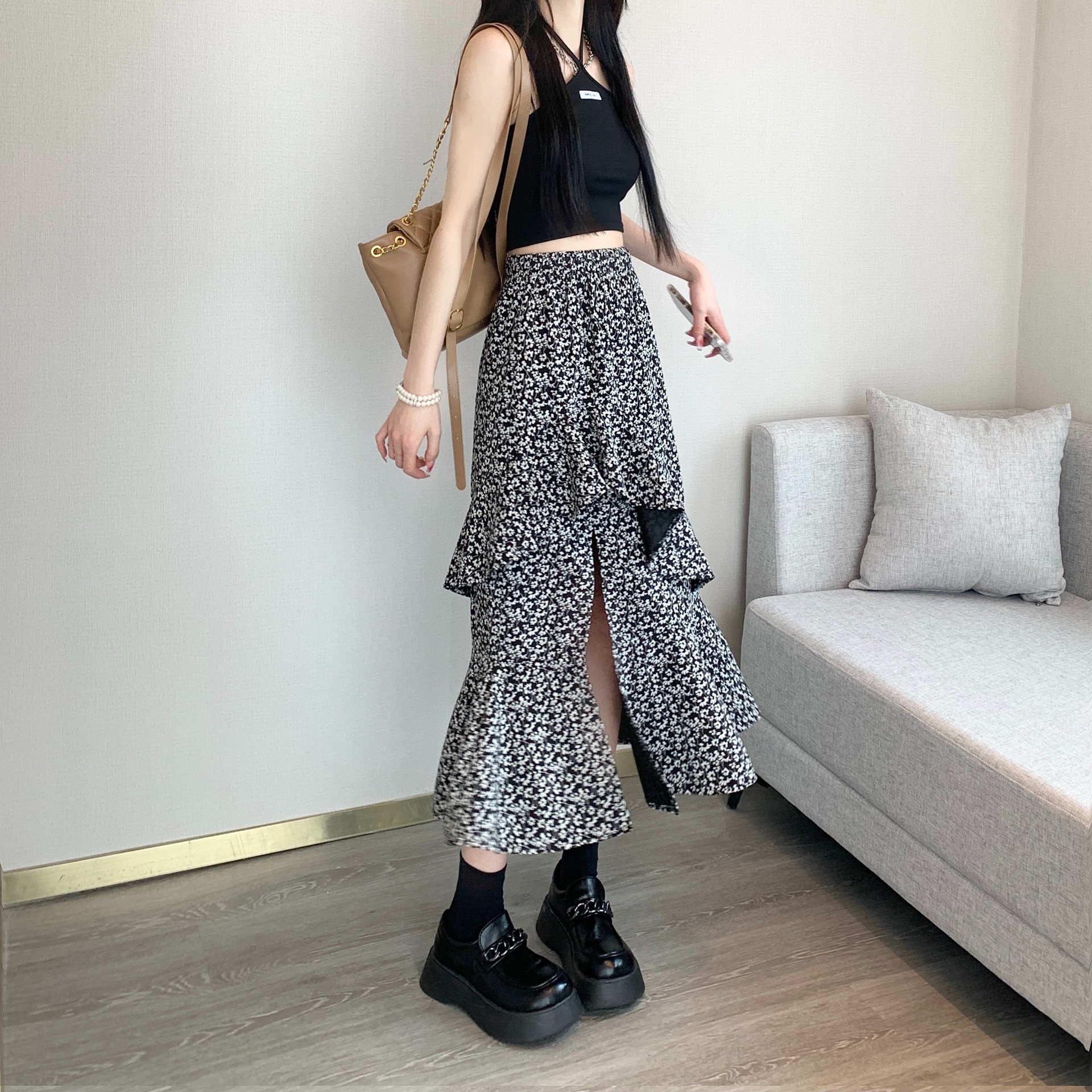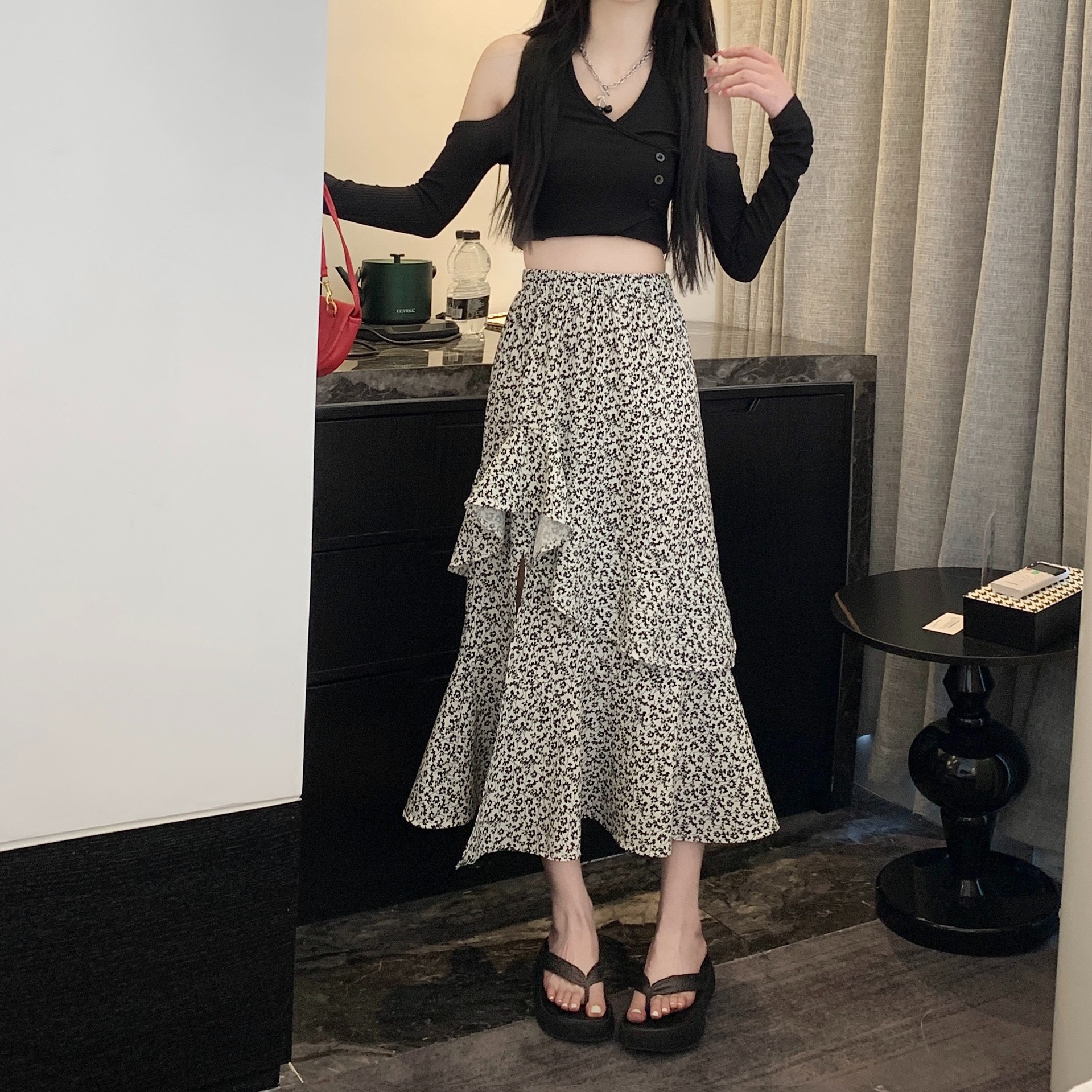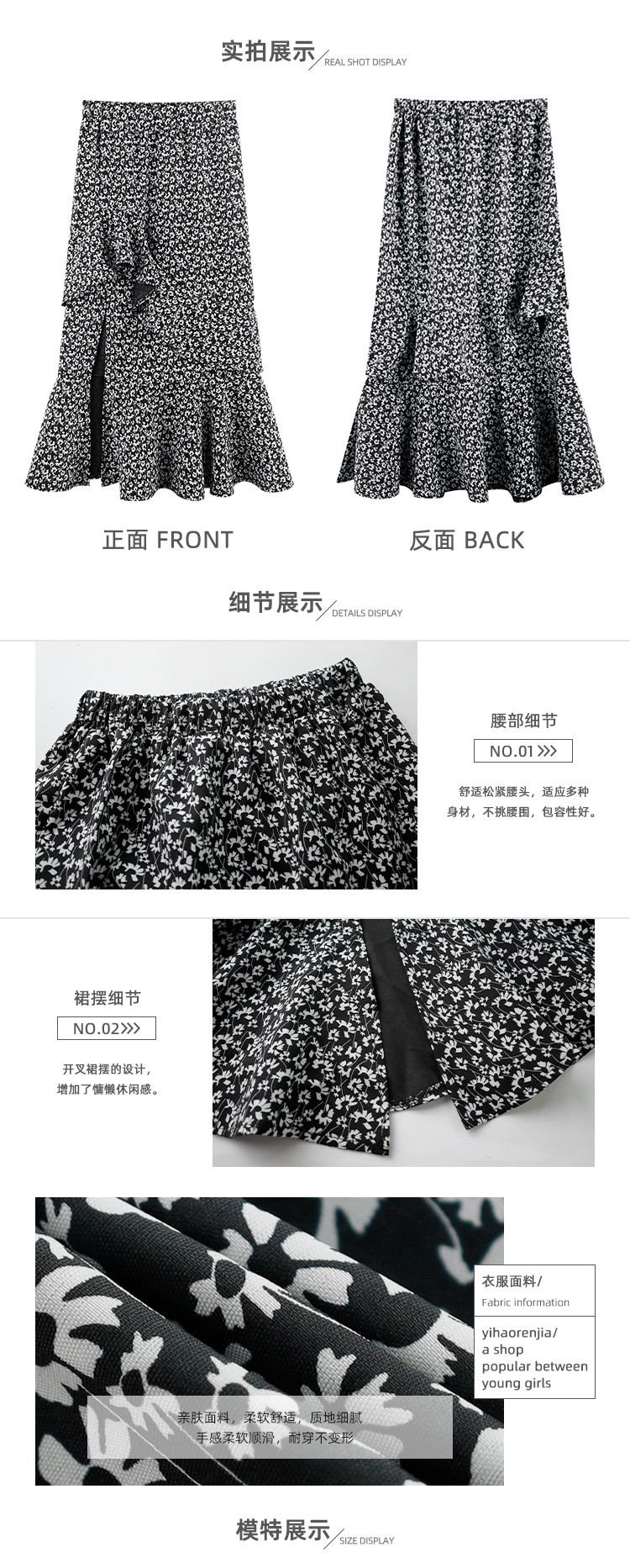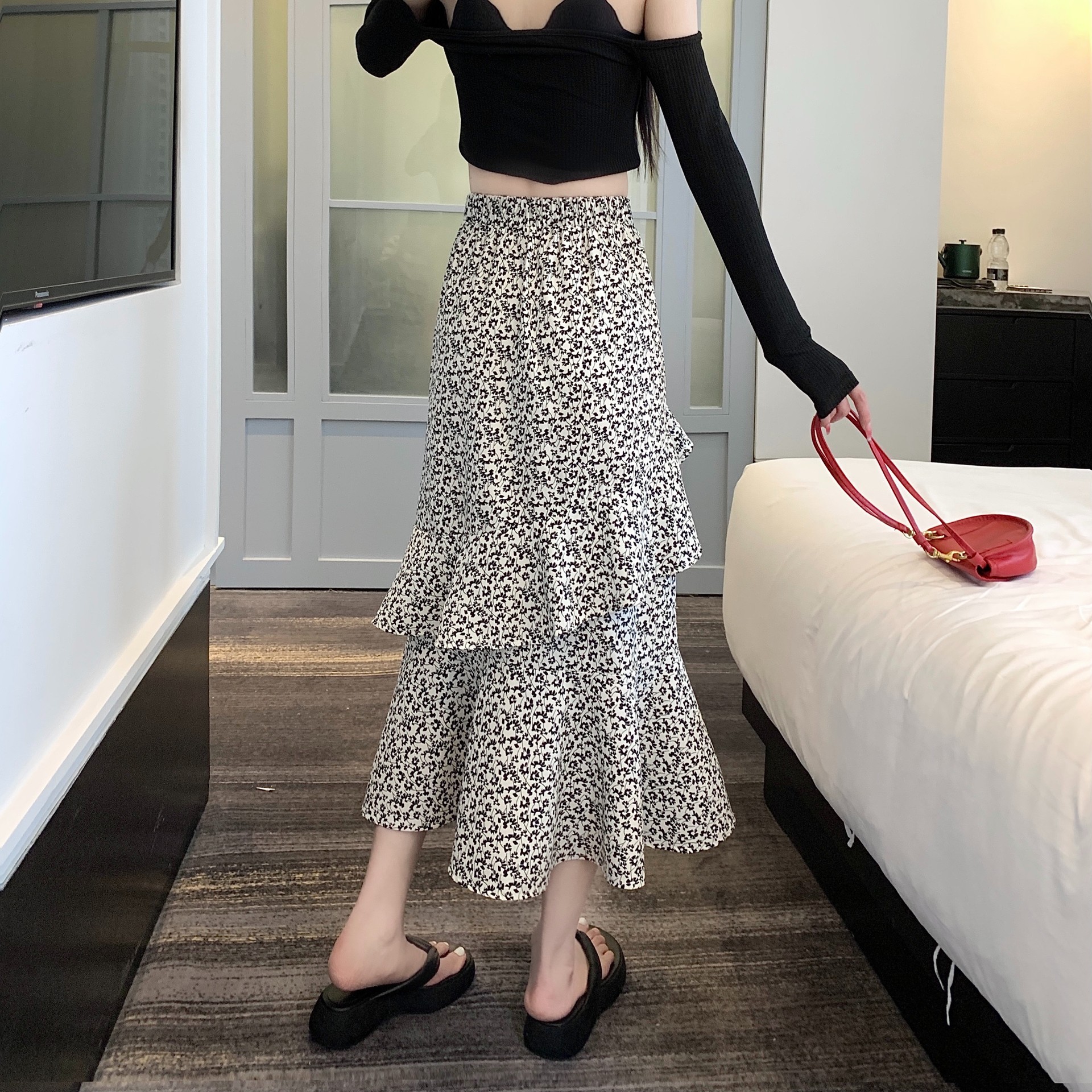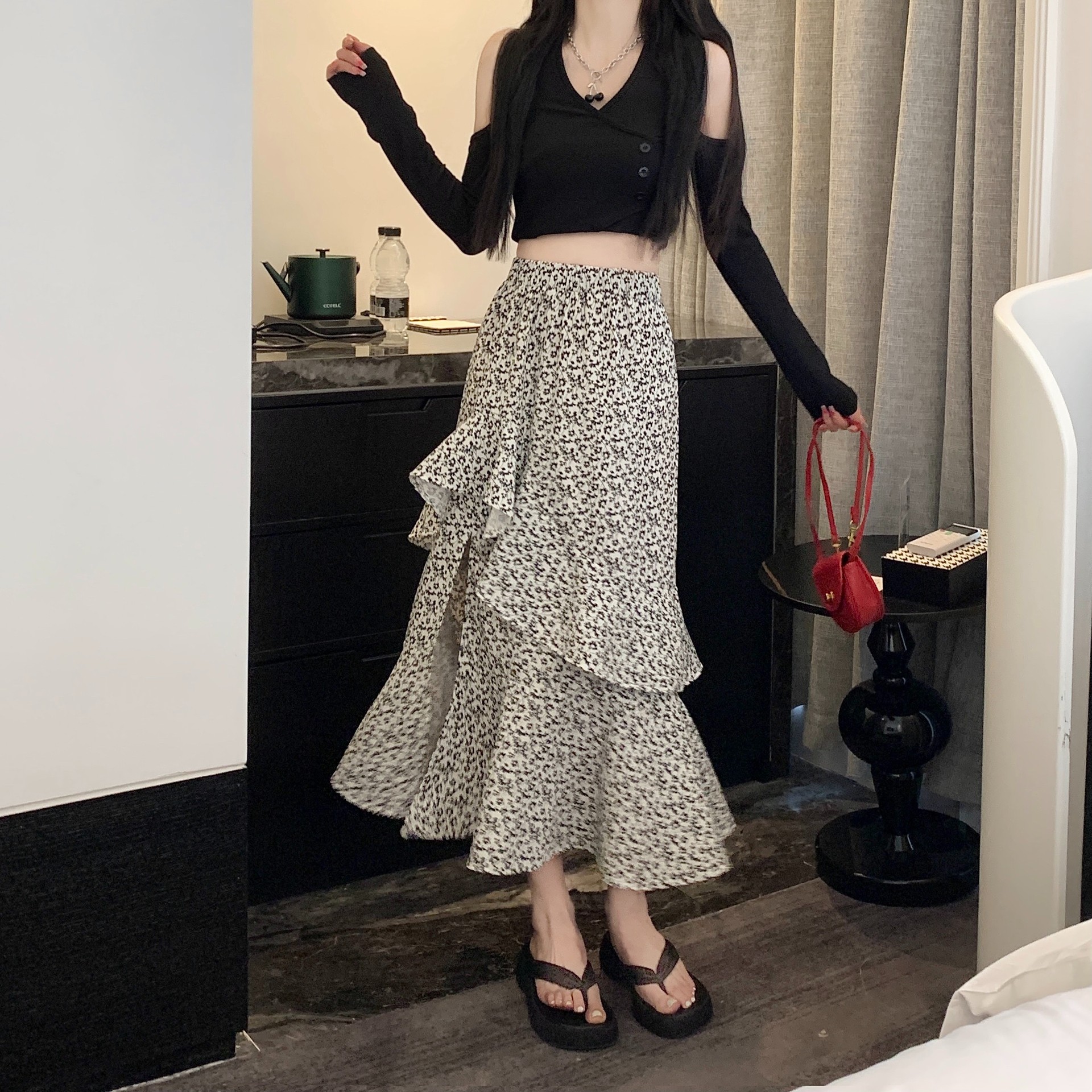 2024 봄/여름 높은 허리 슬리밍 중간 길이 불규칙한 러플 꽃 스플릿 하프 A 라인 피쉬 테일 스커트